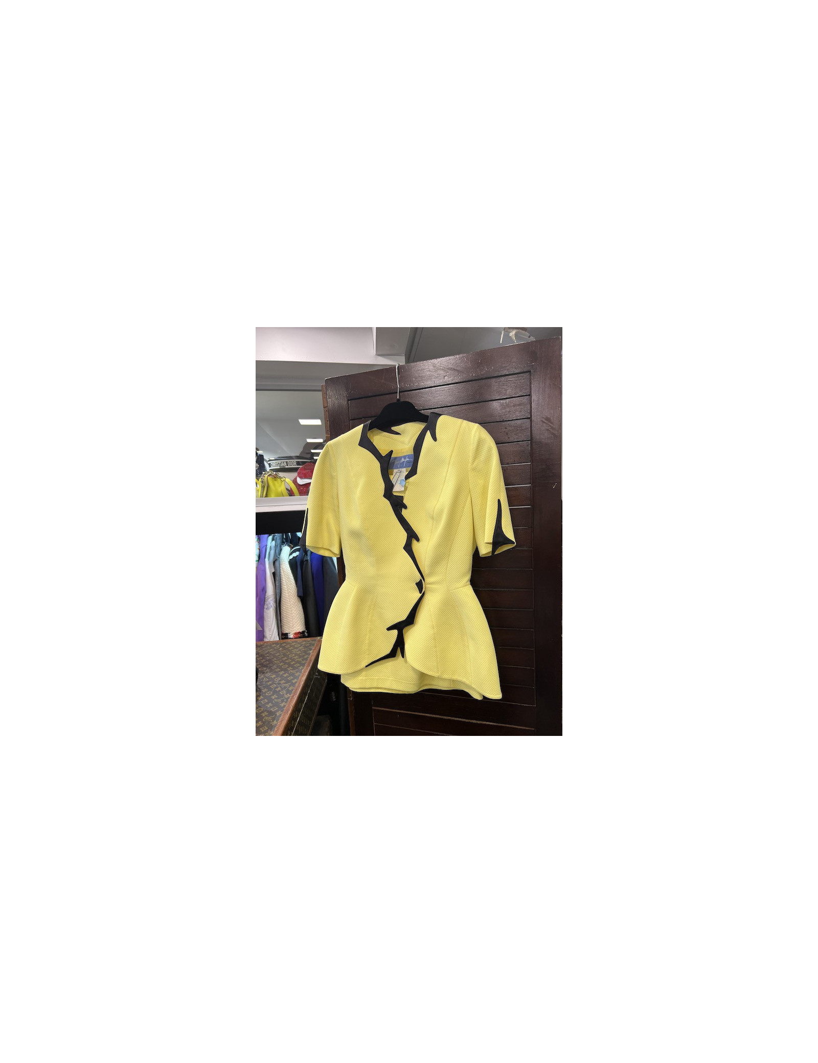 SETS CHANEL vintage yellow jacket and skirt suit CHANEL 29227 3,900.00 € CHANEL vintage suit size 42FR Condition : goodMade in FranceSize : 42FRMaterials : wool, silkLining: yellow monogram silkColor : yellowMeasurements:Jacket: shoulders: 40 cm, underbust: 50 cm, height : 67 cm, sleeves length : 56 cm, wrist circumference: 25 cmSkirt : waist: 37 cm, length : 56 cmDetail : vintage Fall/Winter 1994, 4 patch pockets, Chanel logo... Add to cart