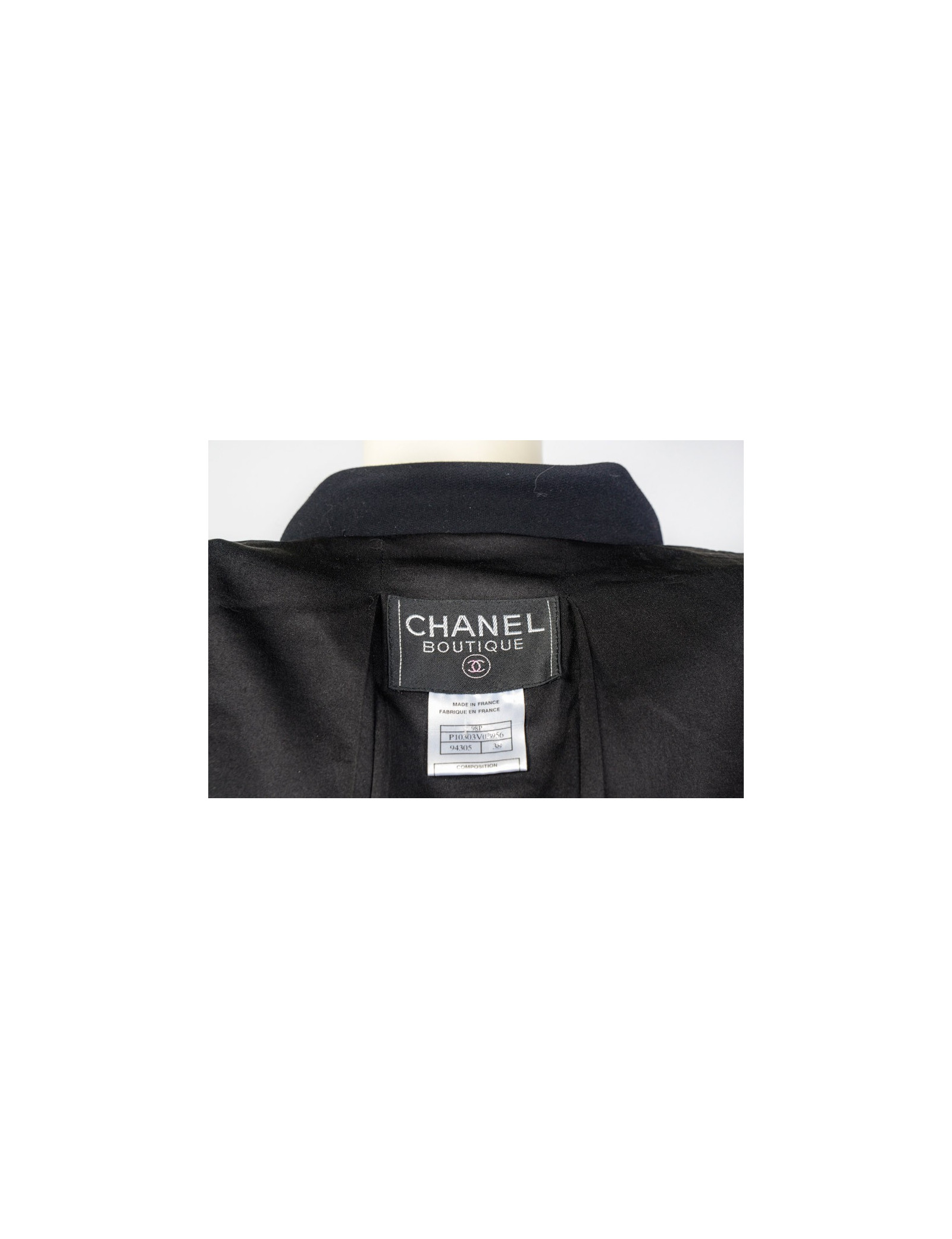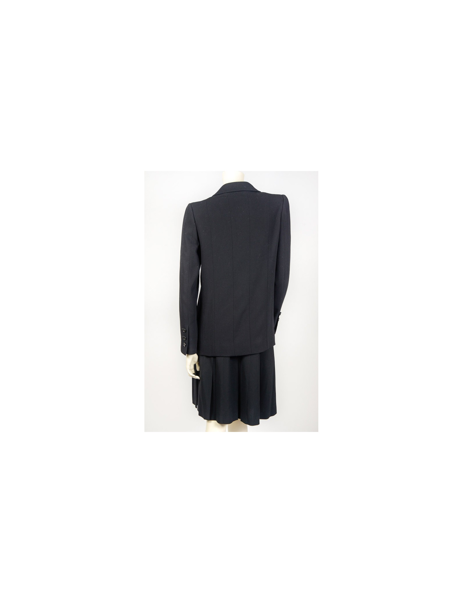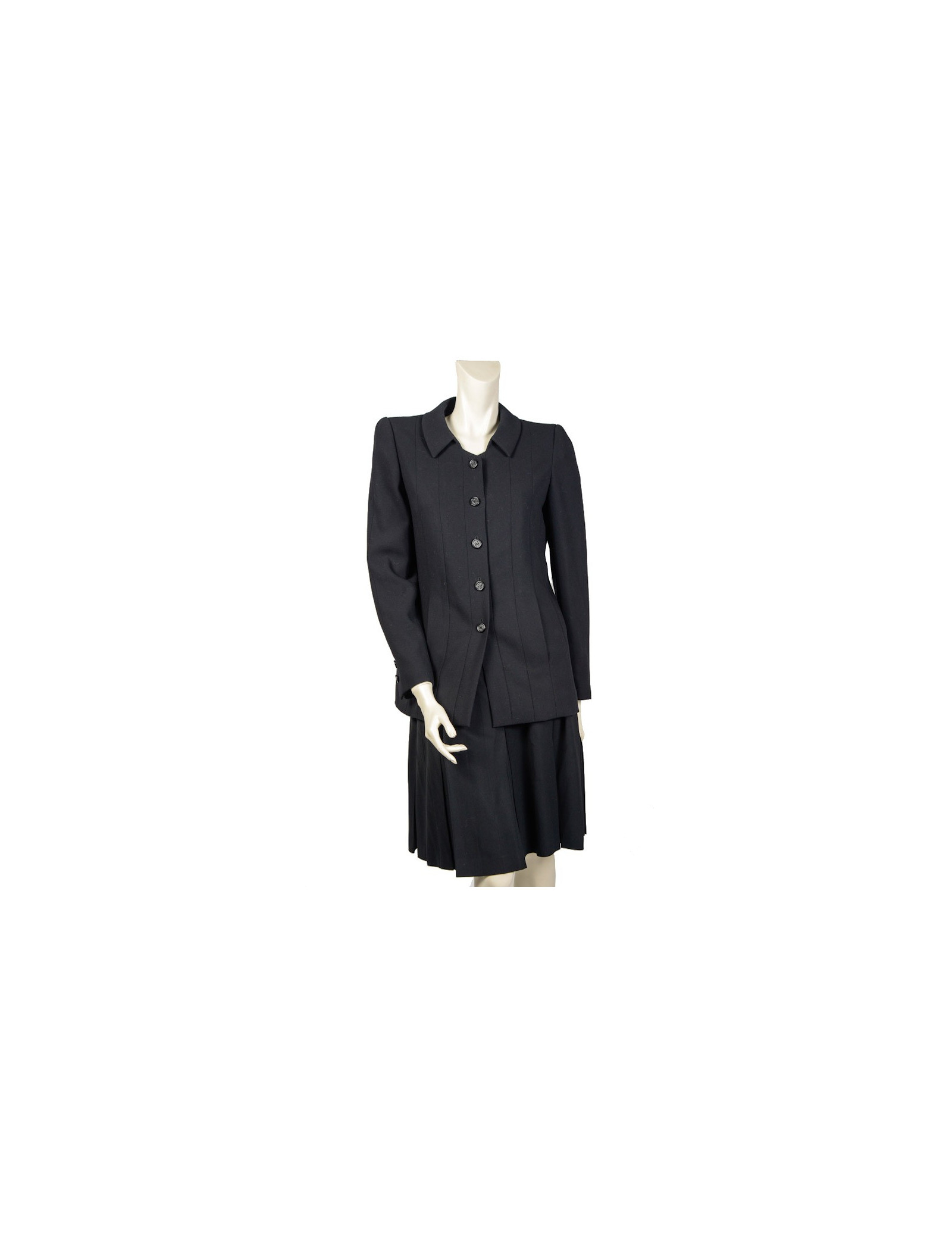 Tailor skirt Chanel Black wool. Size 38. Collection Spring 98. The jacket is wool with a silk lining. It has two pockets. Closing 5 buttons initials "CC". In very good condition. Height: 69 cm, chest width: 46 cm, width height: 47 cm, arm length: 62 cm, width shoulder: 38 cm The skirt is pleated cotton. Closure 3 buttons initials "CC" with a zip below. In very good condition. Height: 52 cm, width height: 35 cm, width hips: 45 cm