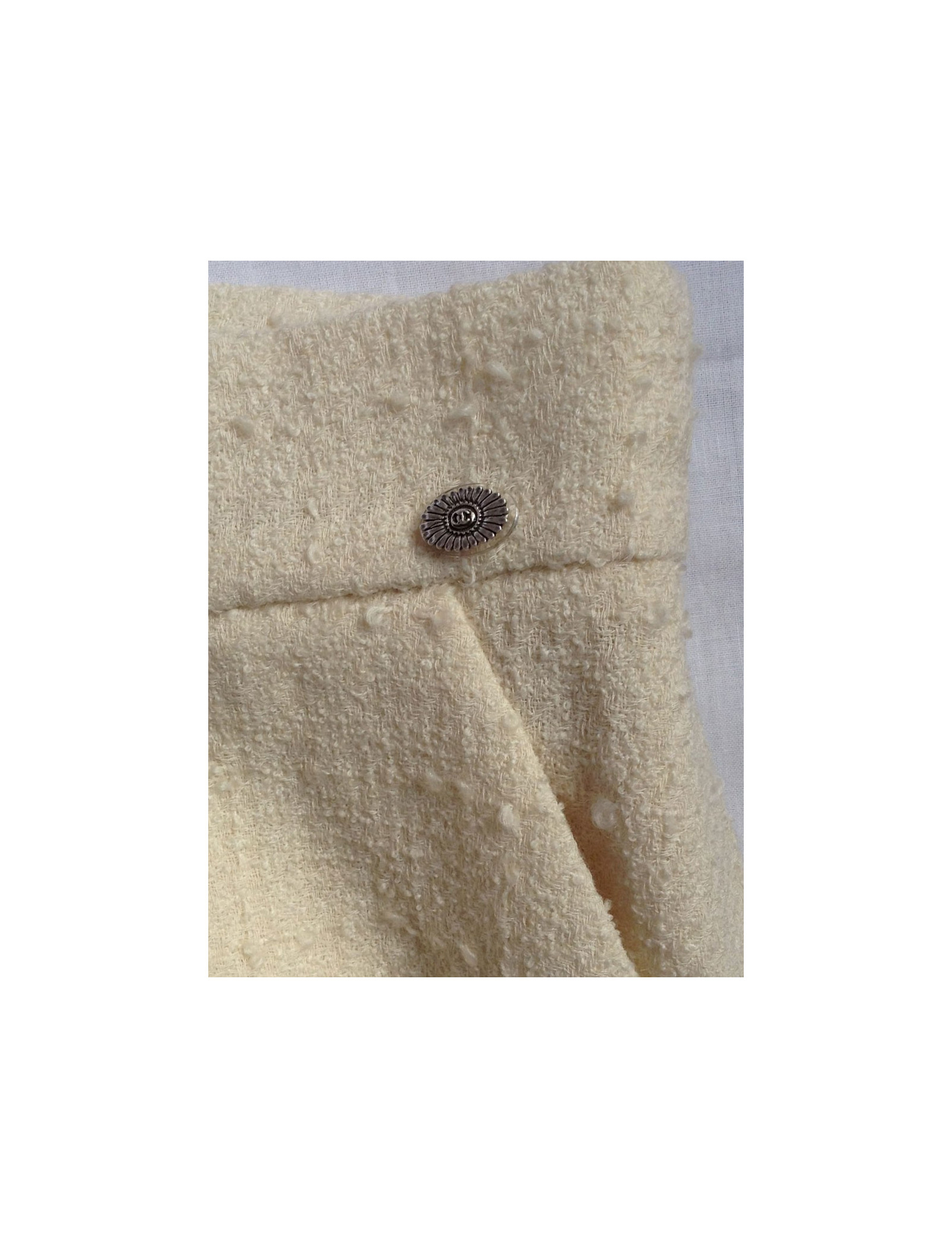 A Chanel skirt;" Chic French", Ecru color, size high and narrow that stops below the knee. The success of this skirt is that it indicates the feminine curves in value. Small jewelry of silver on the sealed Chanel, 1 belt pocket on each side and zipper on the back. Size 44 FR. Composition: 90% wool, lining is 100% silk. Length: 59 cm, Width: 41 cm This skirt has never been brought very good condition! Tagged Chanel barred