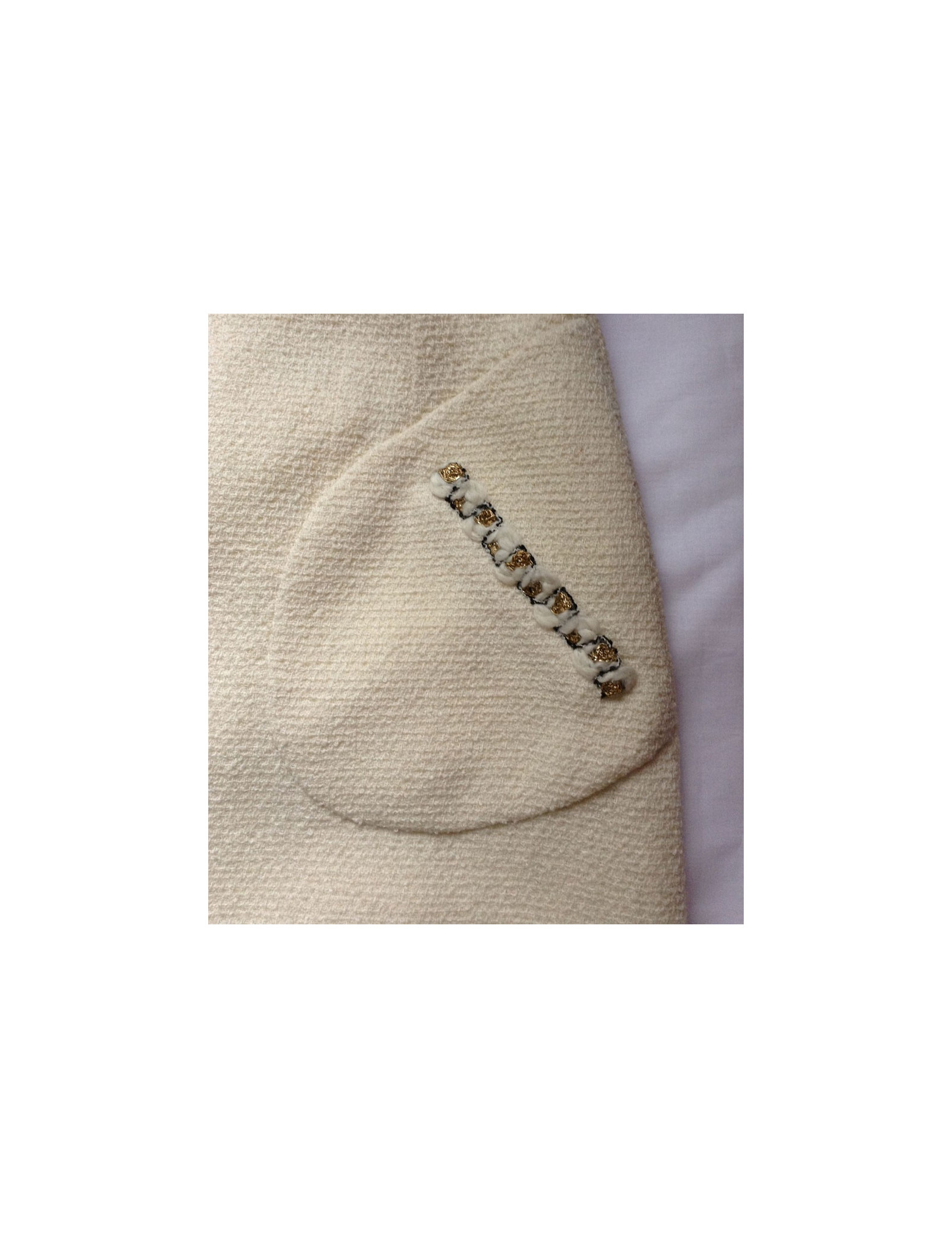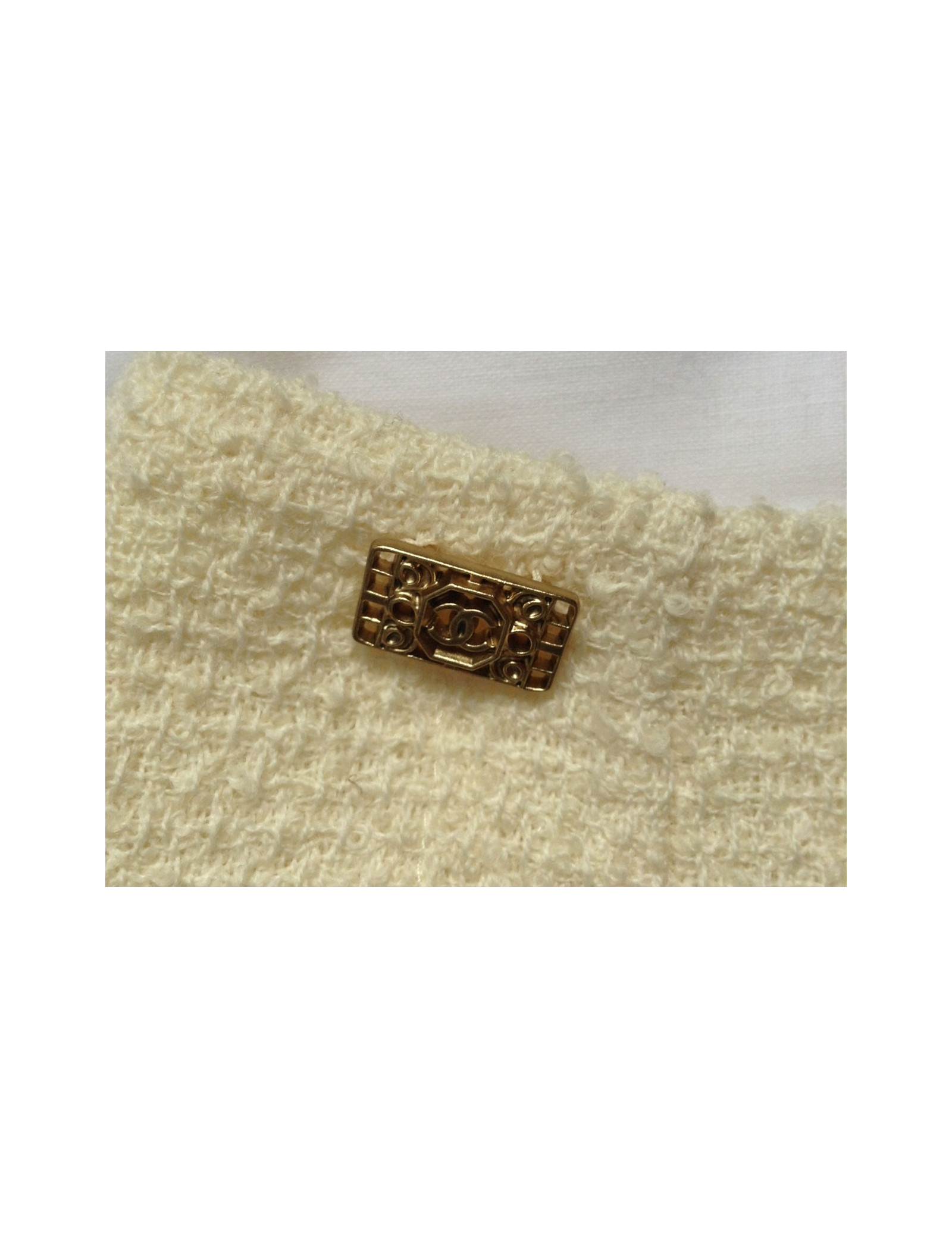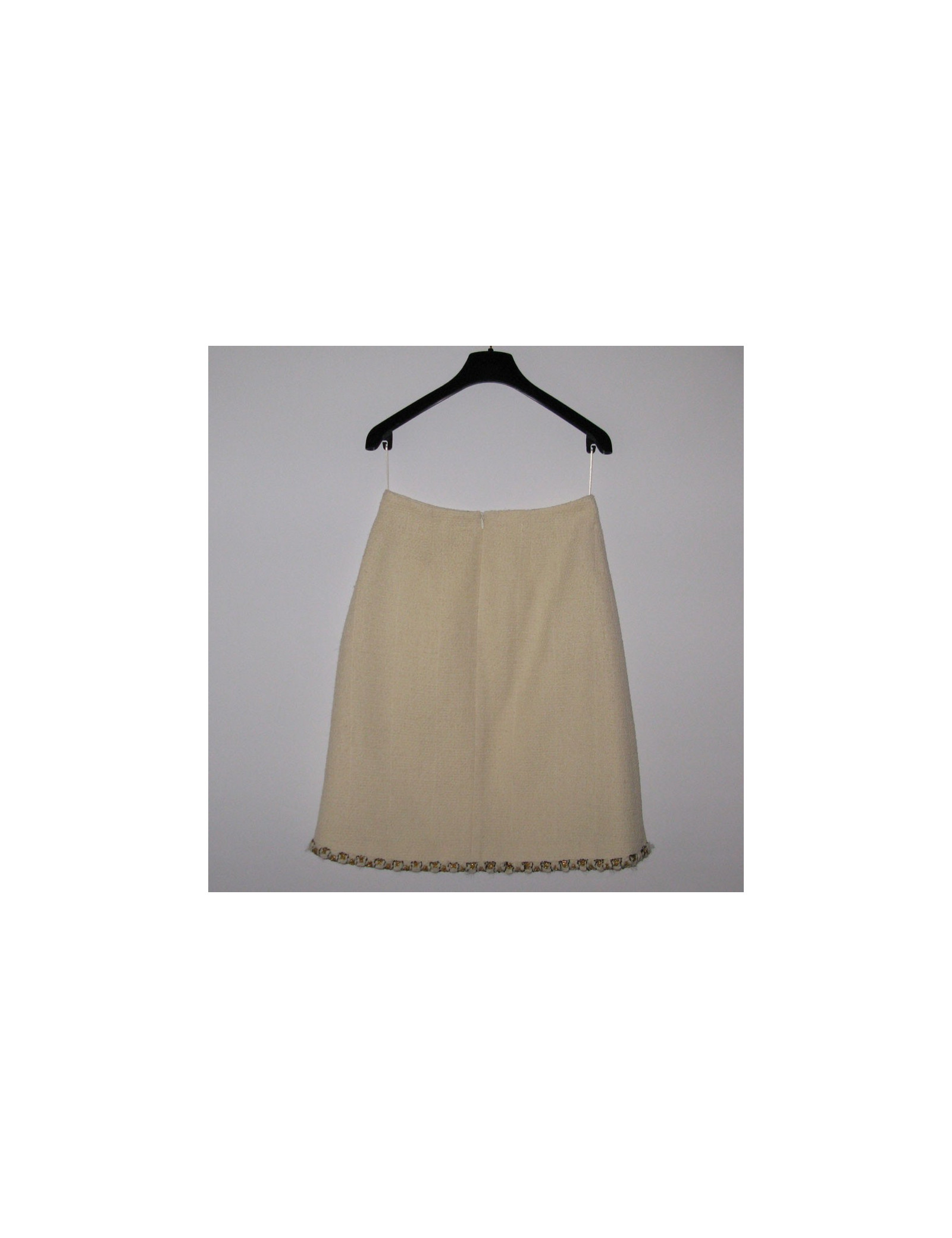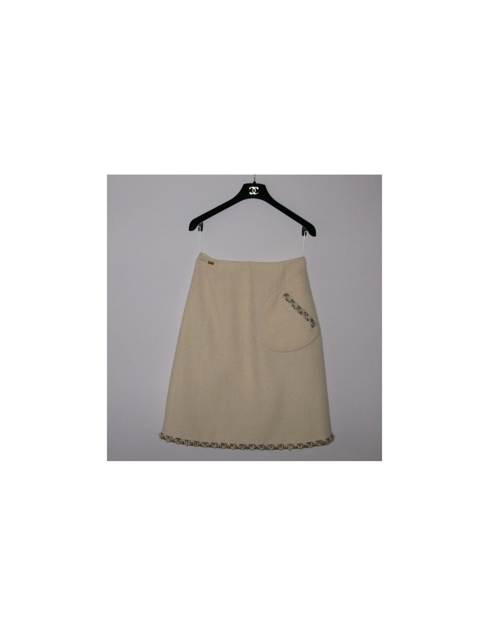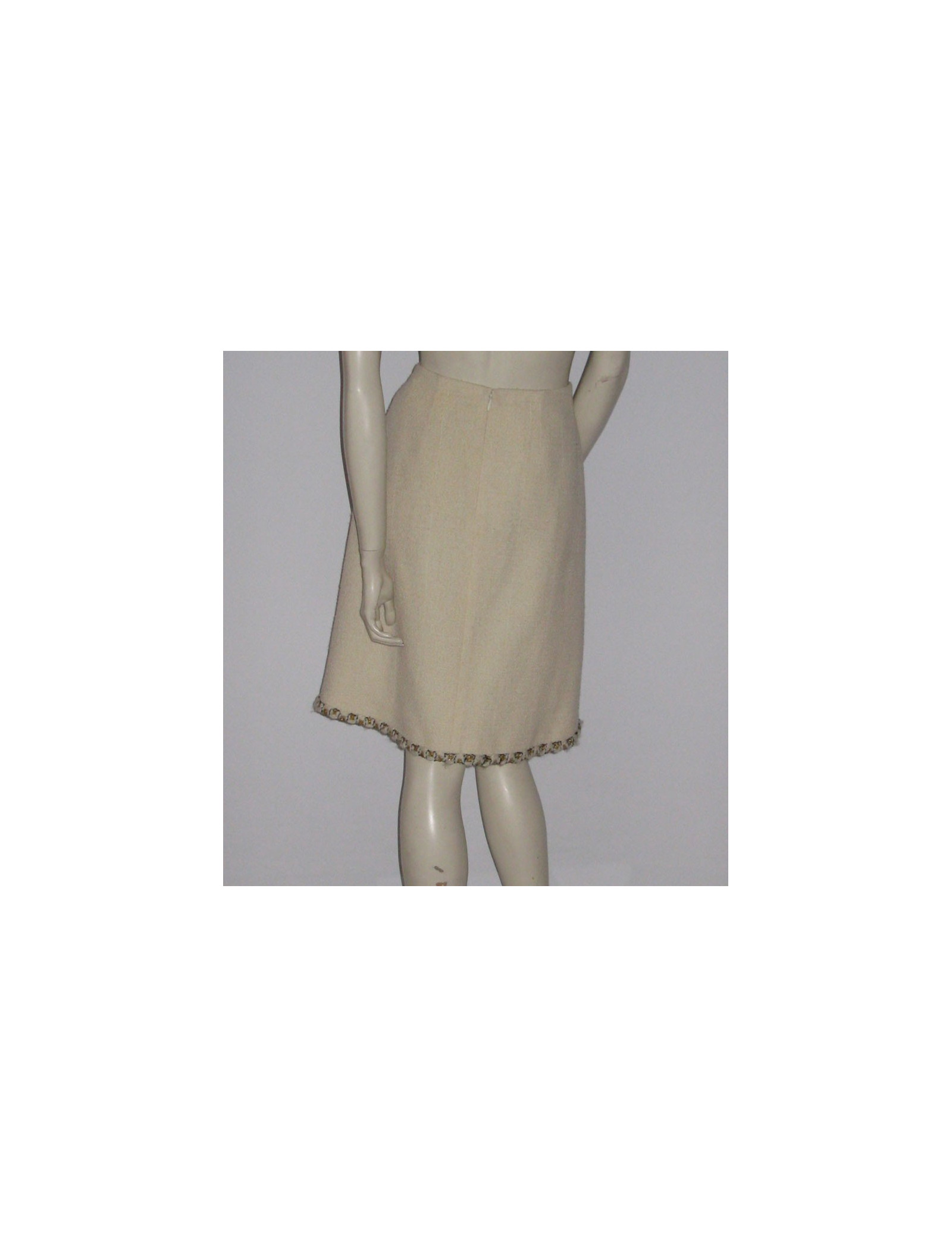 Ravishing Chanel, off-white white plain tweed trapeze-shaped skirt. High waist, front and back bending pliers. Skirt lined with off-white plain silk, taped to a mat of off-white white wool and small gold, white and black wire on the left pocket of decoration as well as on the hem. Small plate of color '' or '' symbol of the CC logo on the right side of the size. Opening on the back by a long discreet zip. Size 36FR 95% wool. 100% silk lining. Collection: Autumn/winter Color: Off-white Length: 58 cm, Waist: 68 cm, Hip: 46 cm Very good condition (it has no label size and the brand logo)