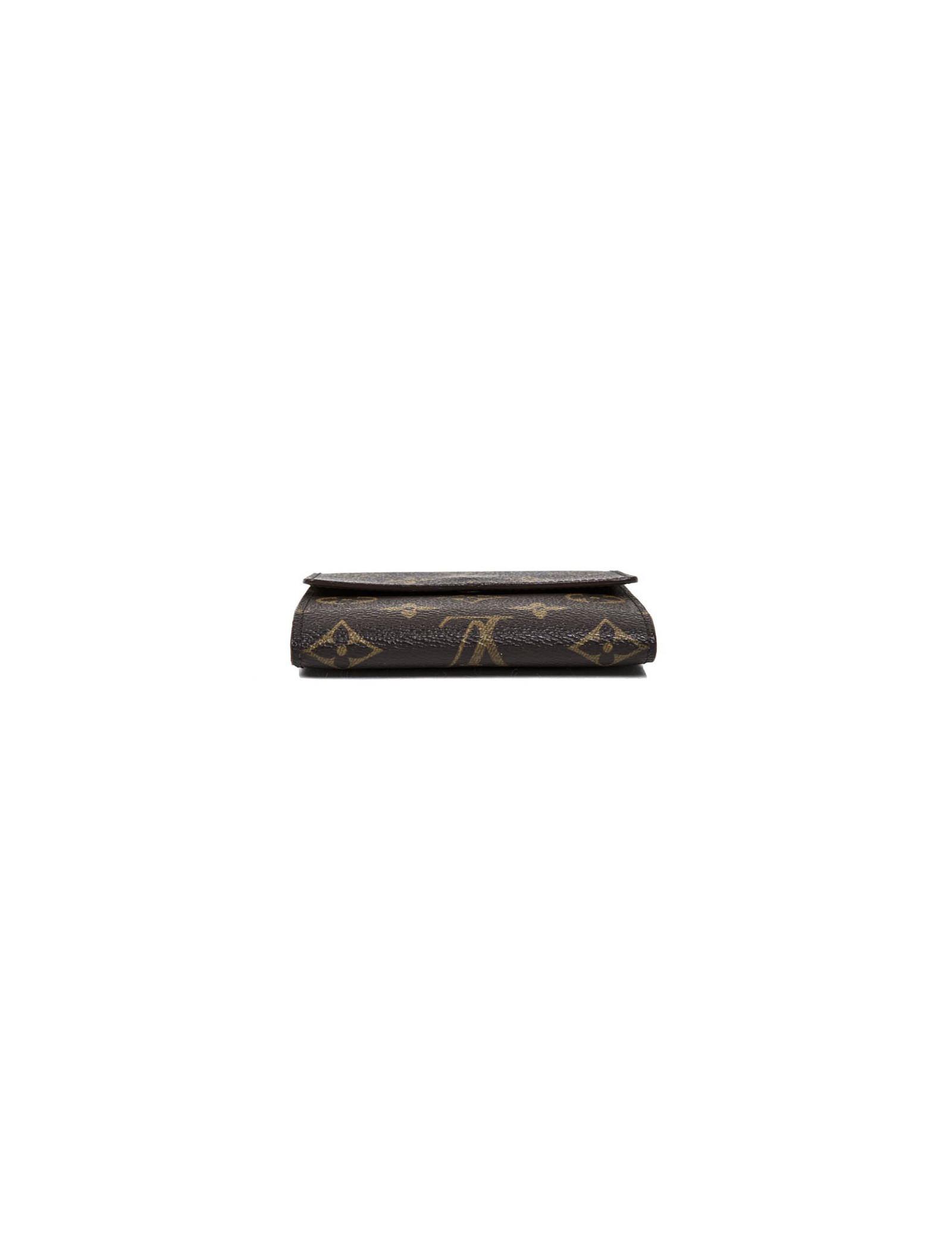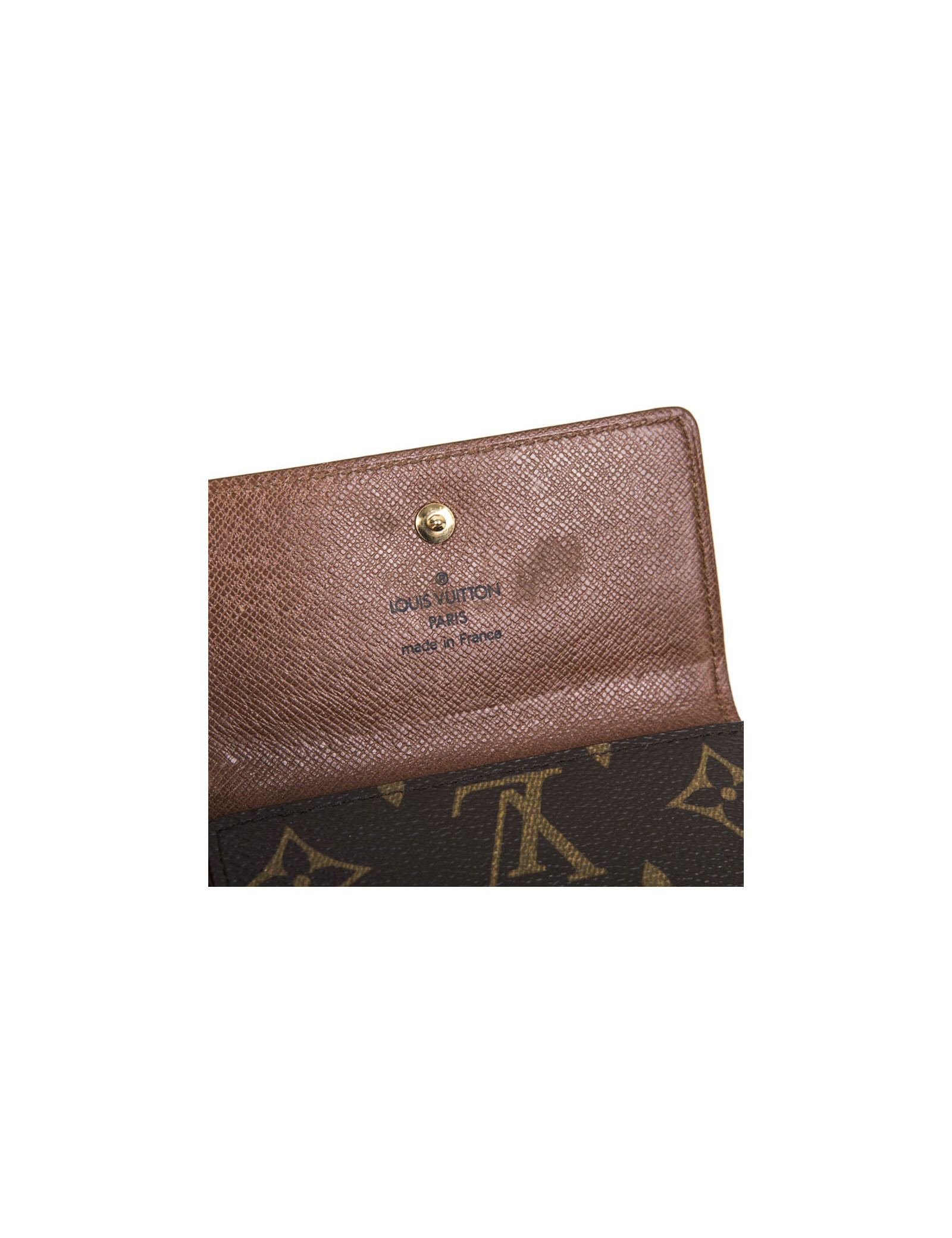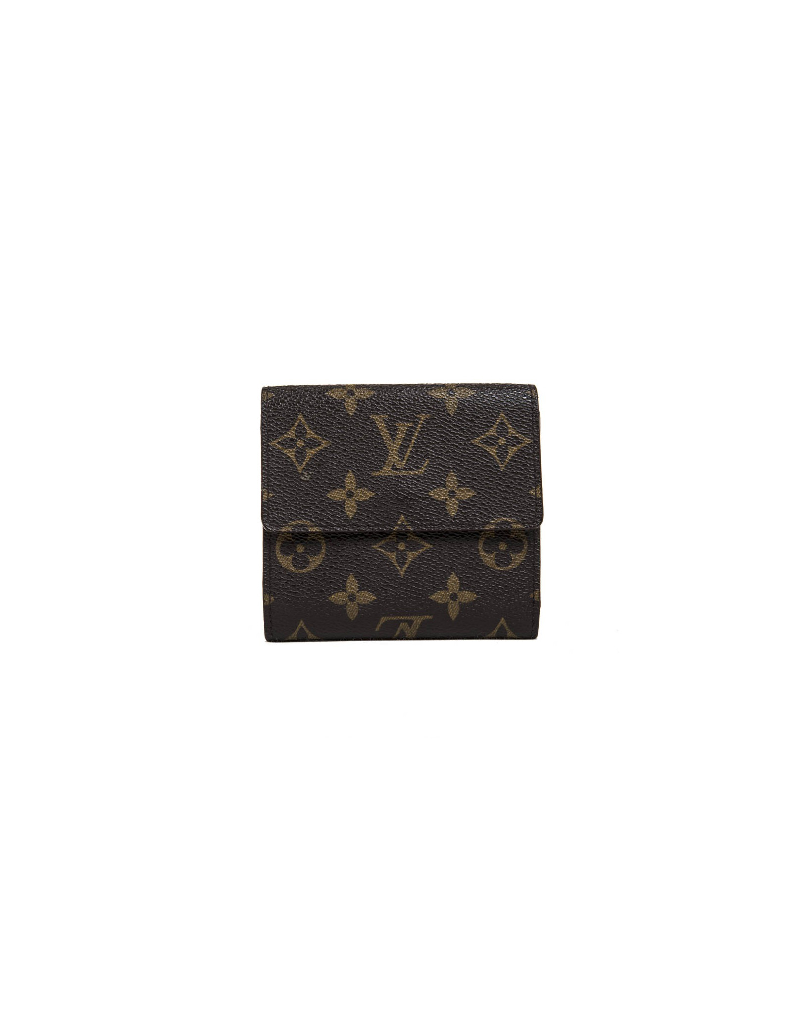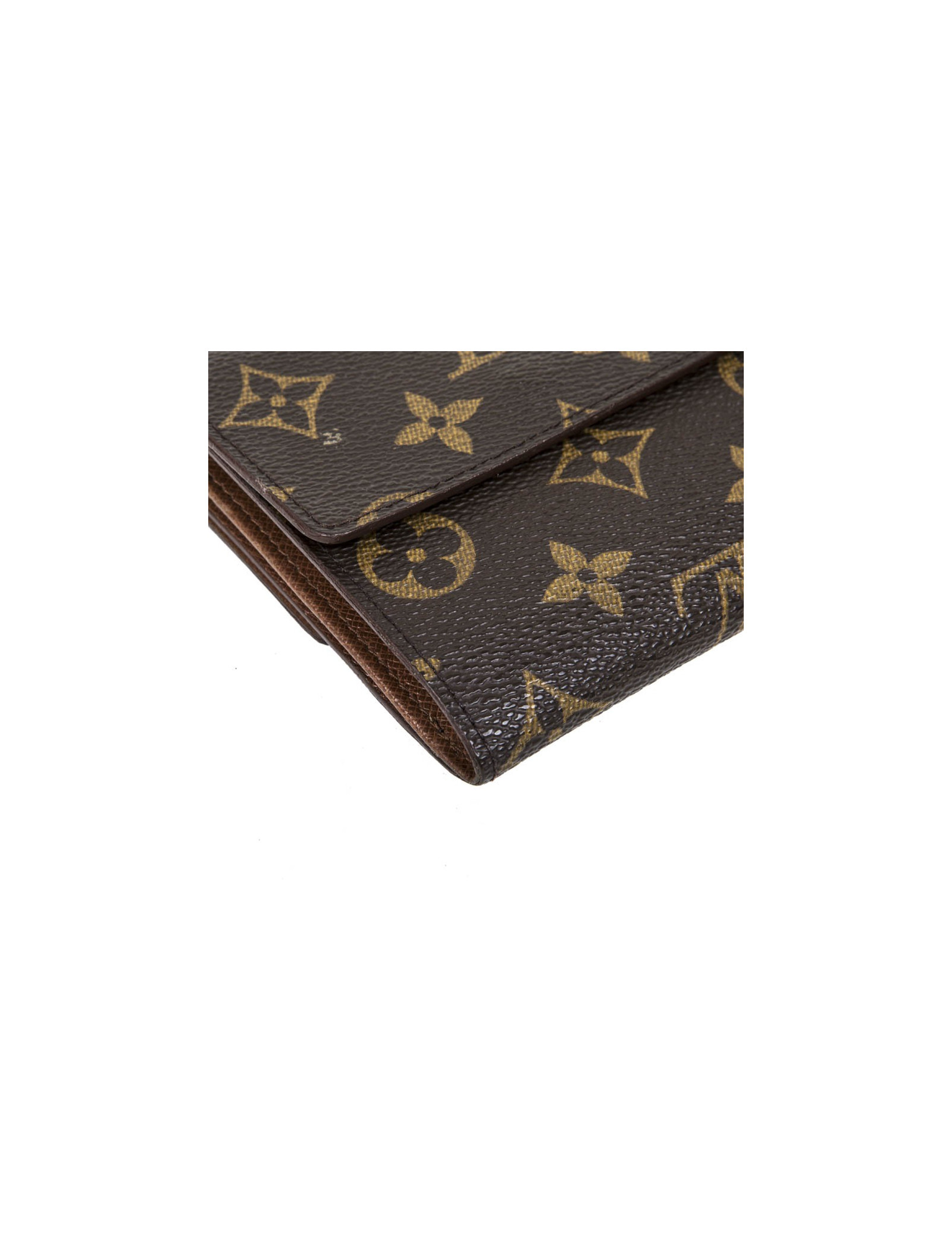 Louis Vuitton wallet in brown monogram coated canvas. There is one side for cards and bills and one side for coins. Each side closes with a snap, an apparent engraved Louis Vuitton and one invisible.
