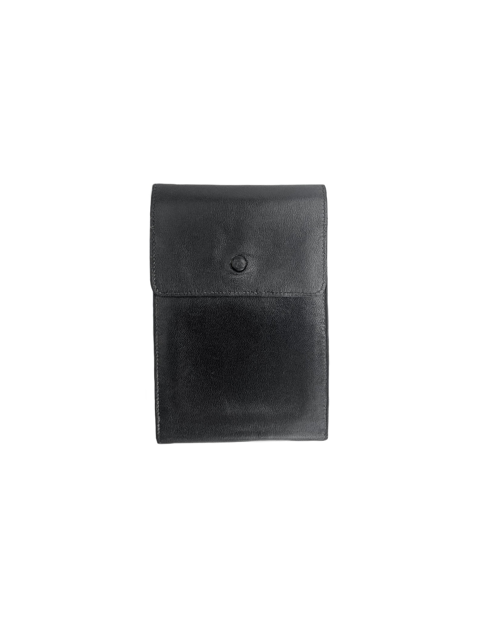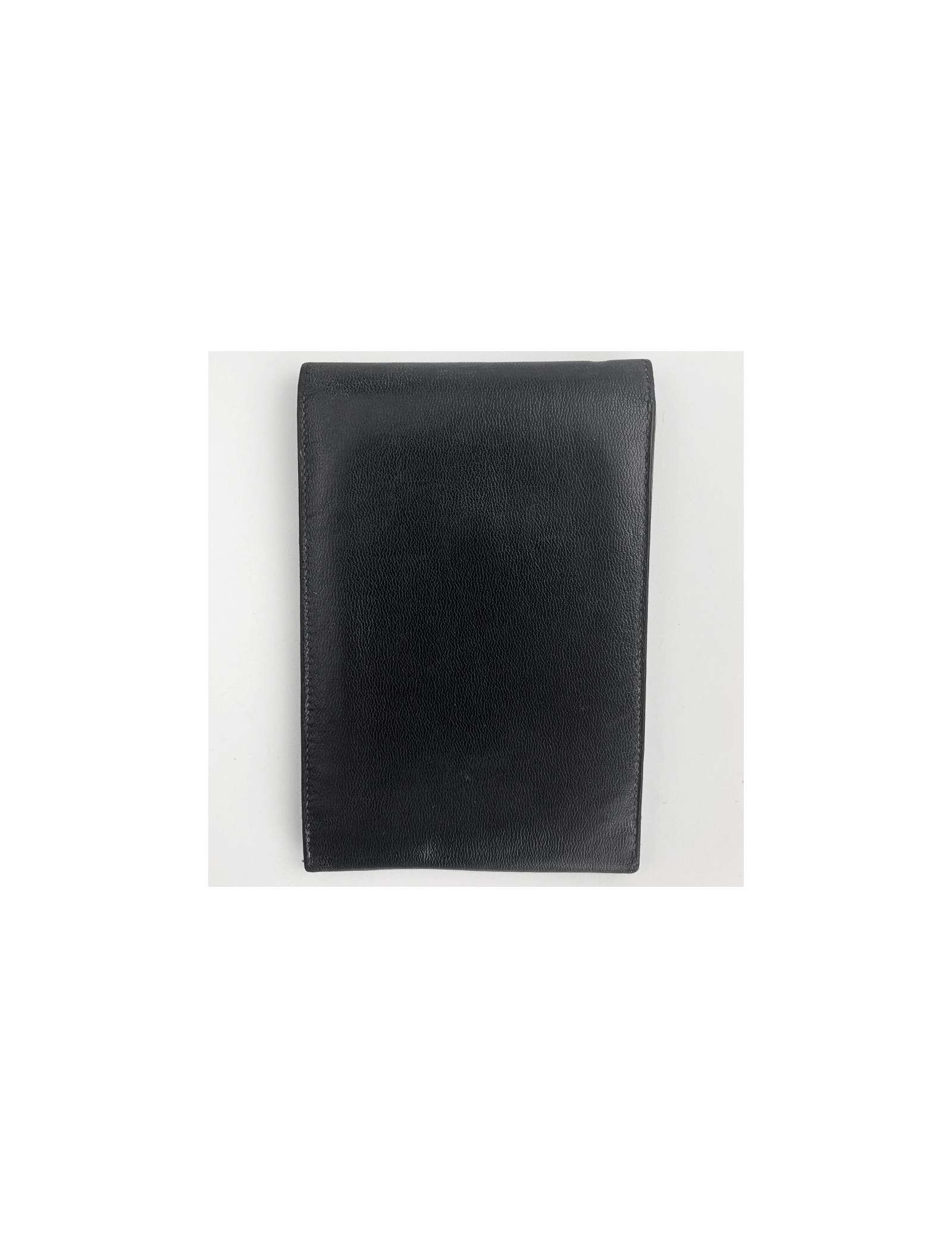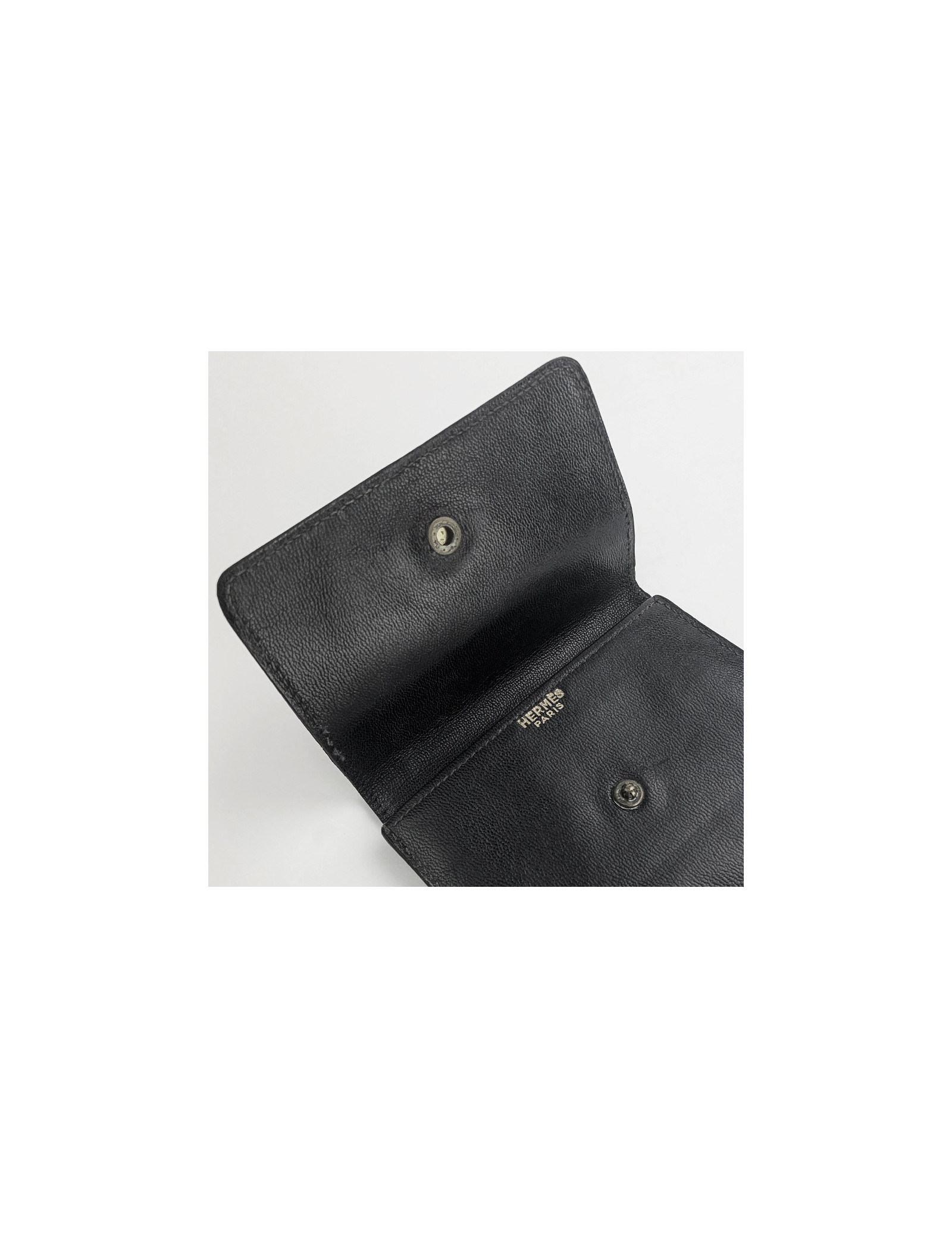 The photo holder is a vintage piece from HERMES. It has a rectangular shape in black Box leather and closes with a snap fastener. It features three double-sided photo compartments.