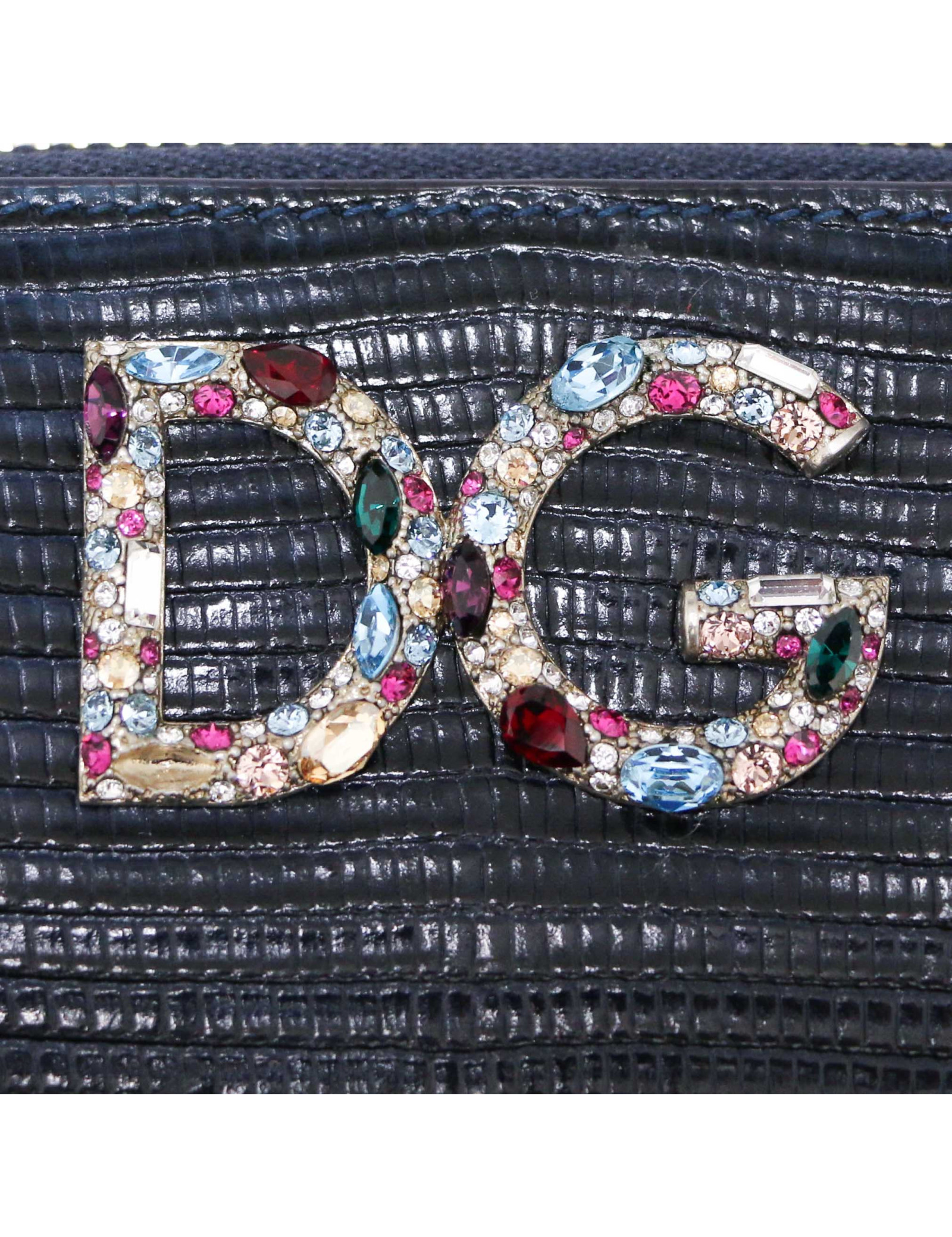 Details : lizard imitation leather, yellow, pink, blue, green rhinestones on the DG logo