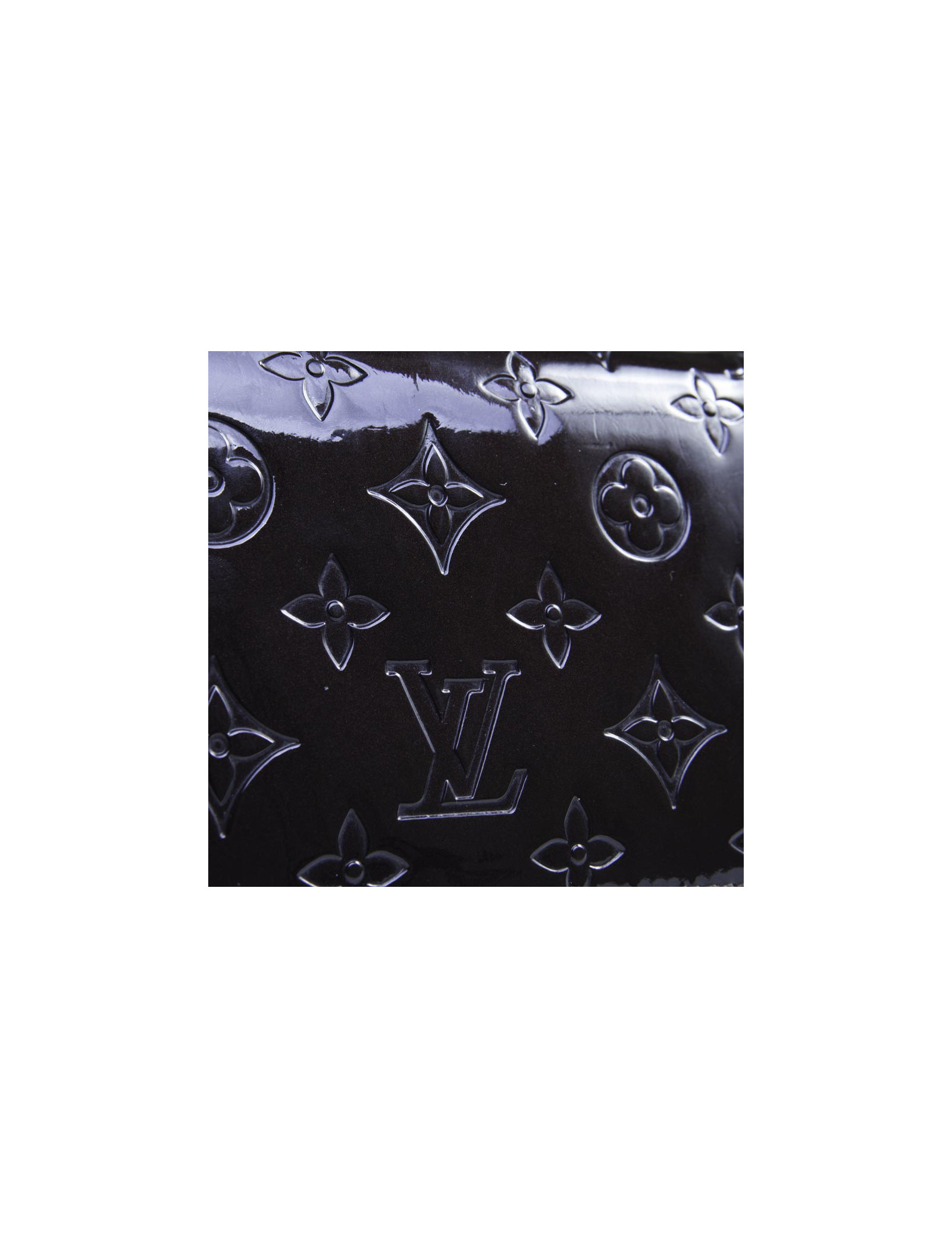 Louis Vuitton, monogram, varnish leather wallet is subtly embossed with a calfskin and gold metal lining.