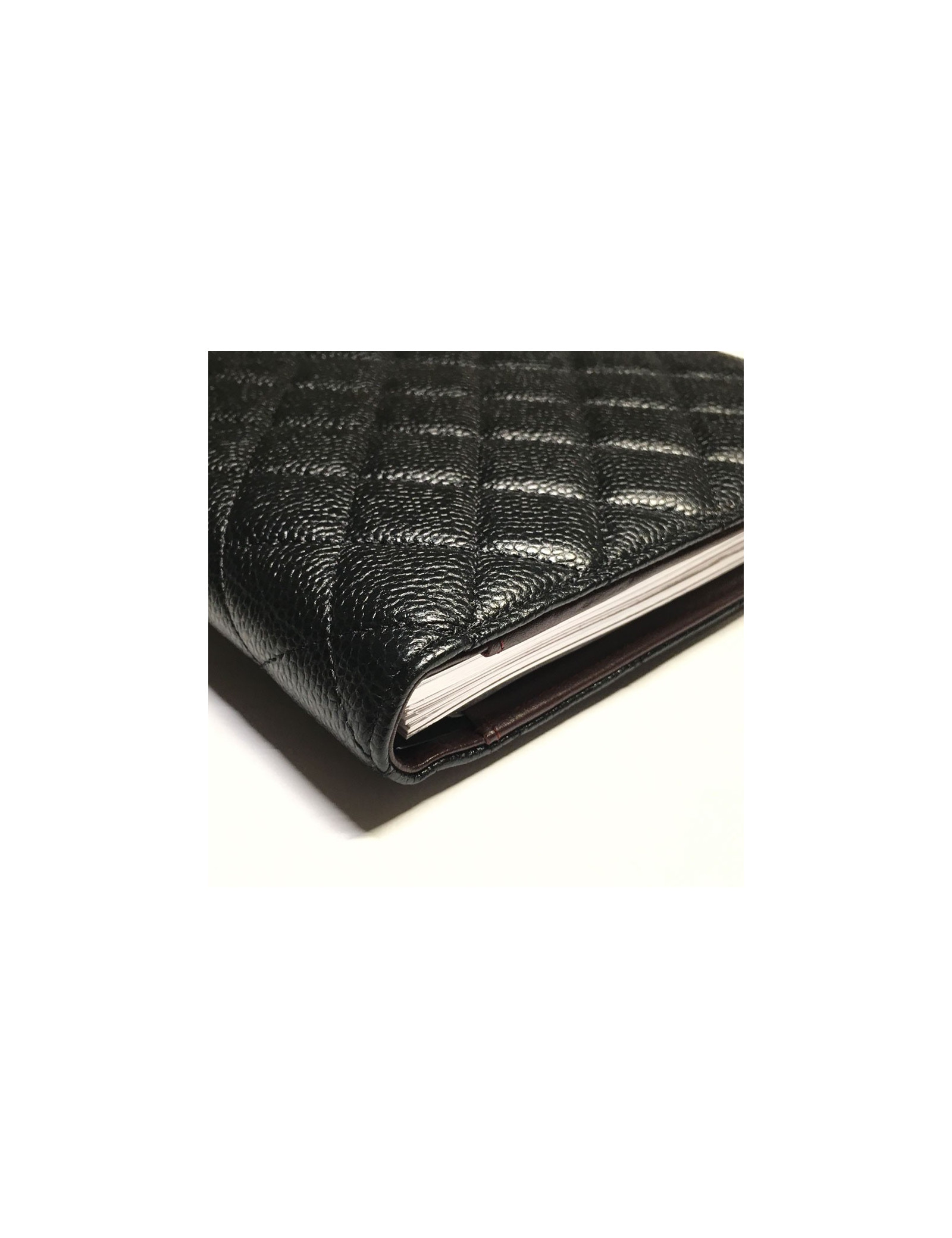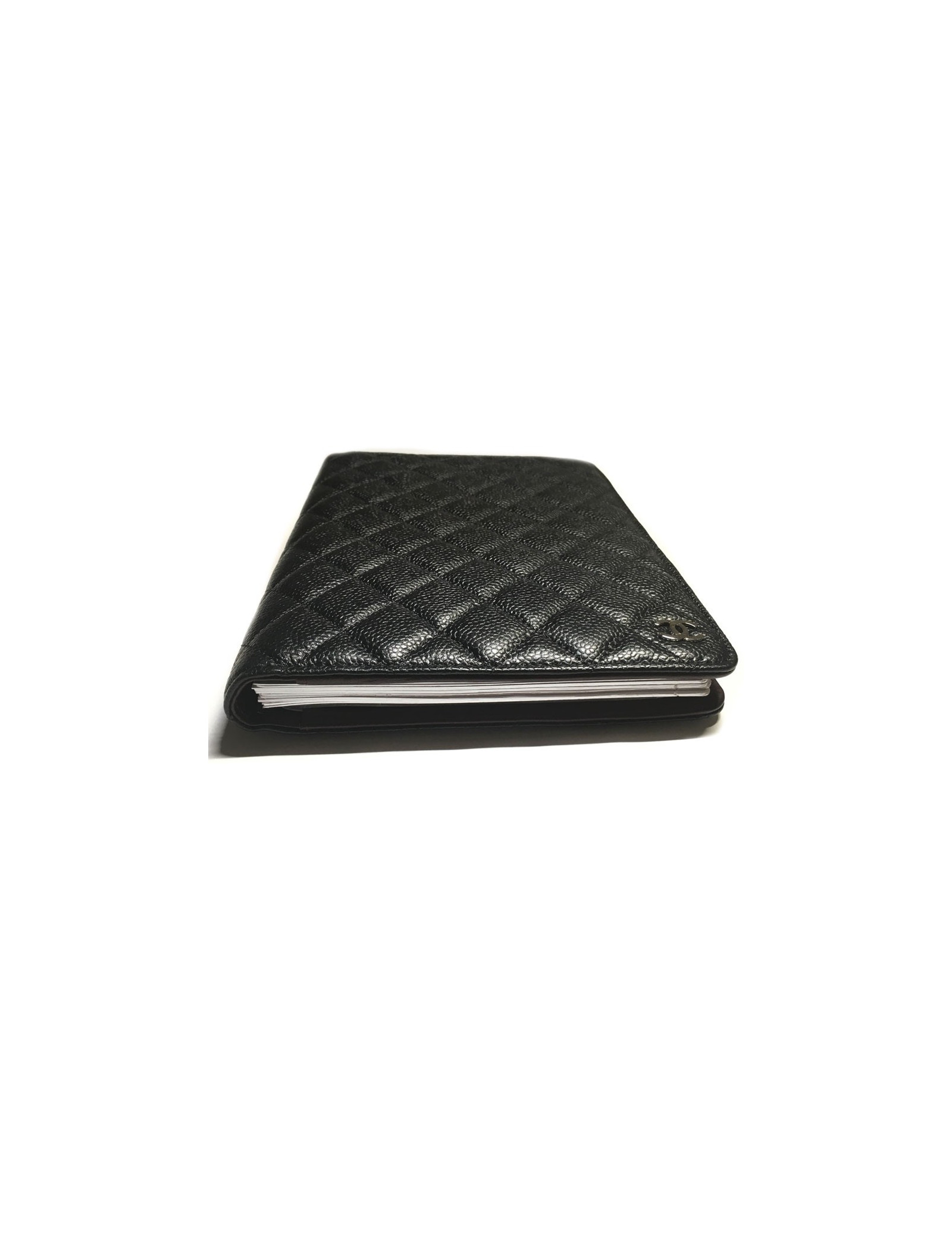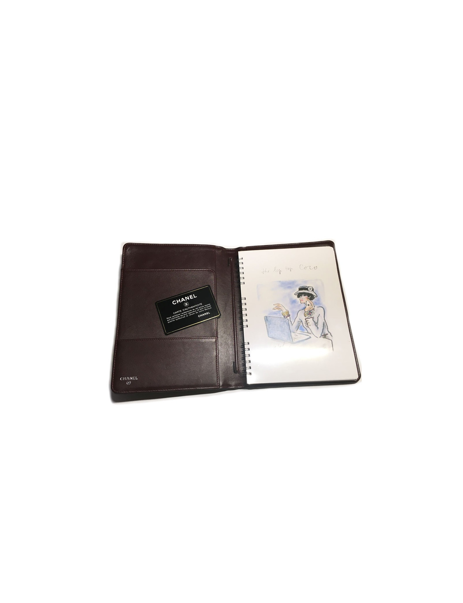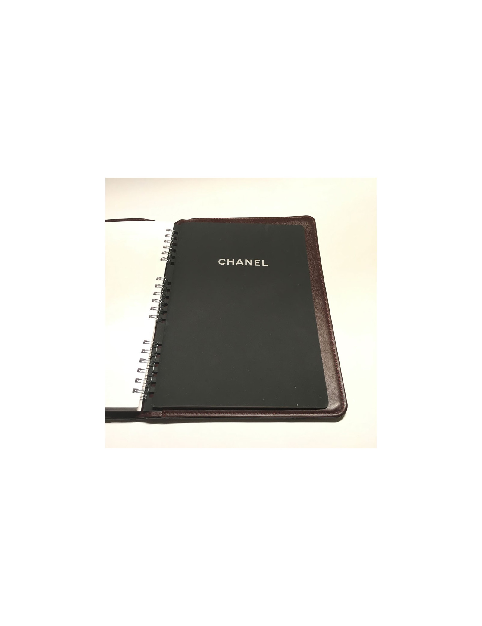 Door agenda CHANEL black quilted leather. Small CC silver on the cover. Inside Burgundy leather and spirals. 2 large slots for documents, a smaller card. Address book black at the end of the door agenda.