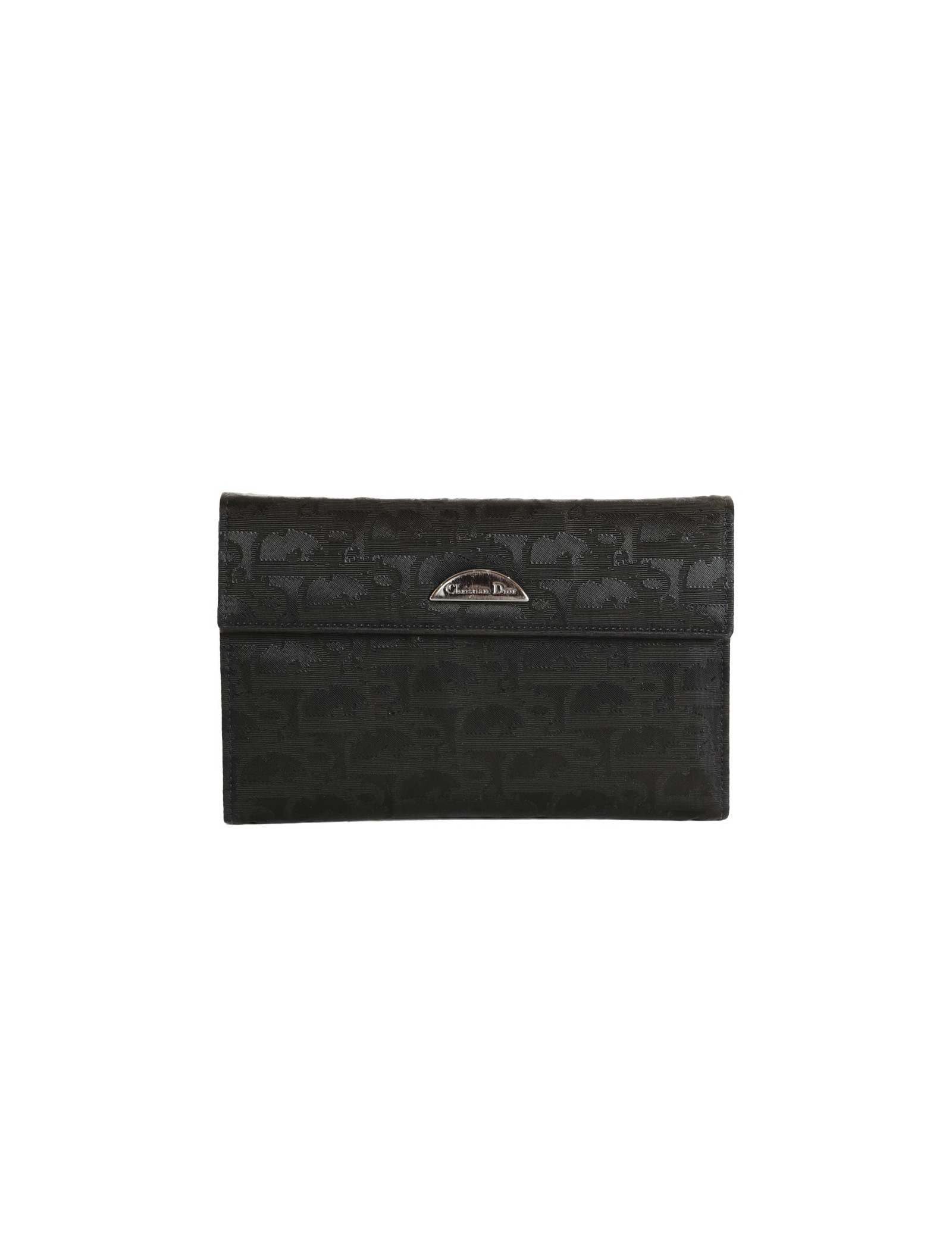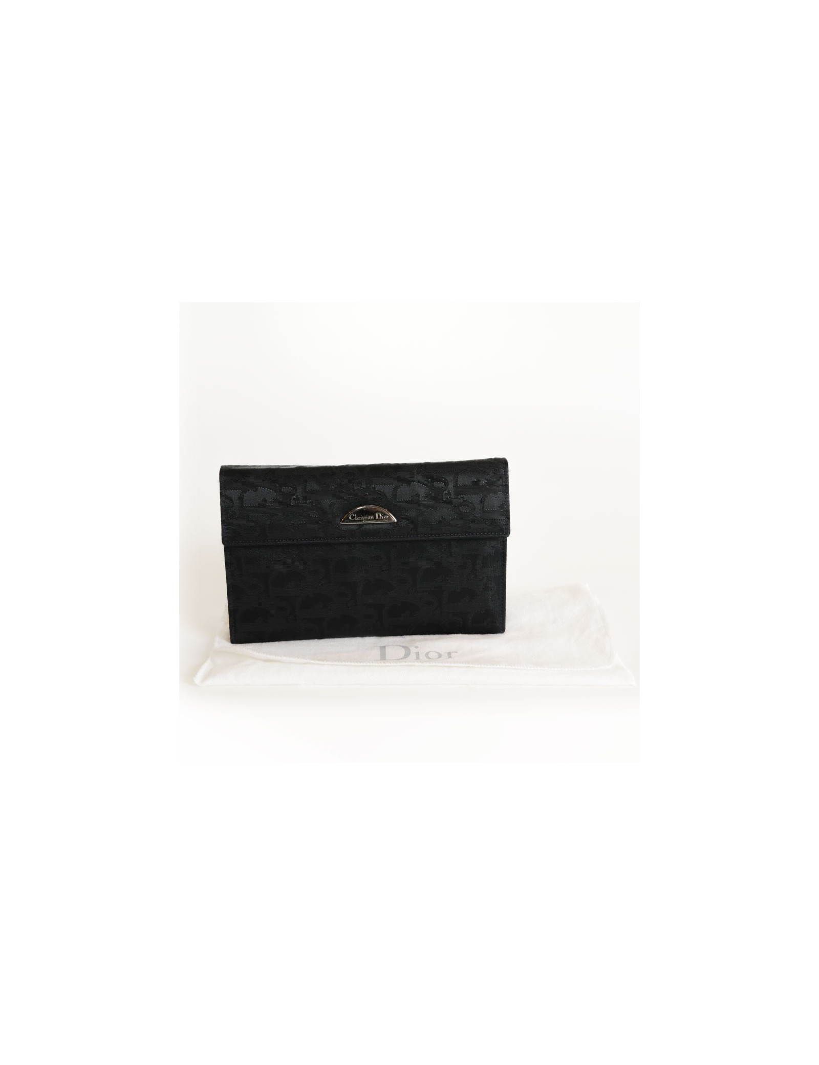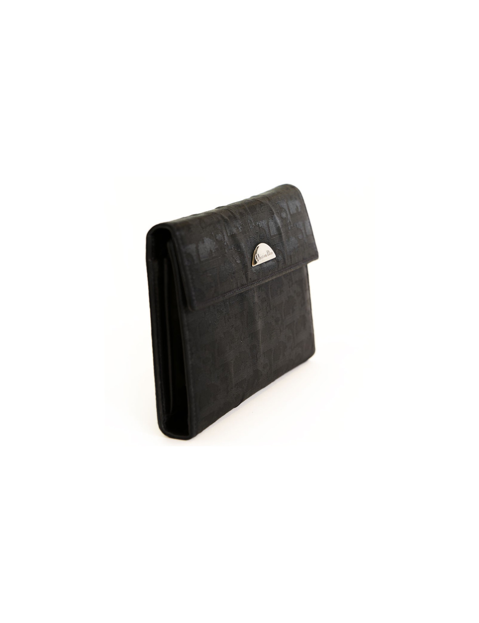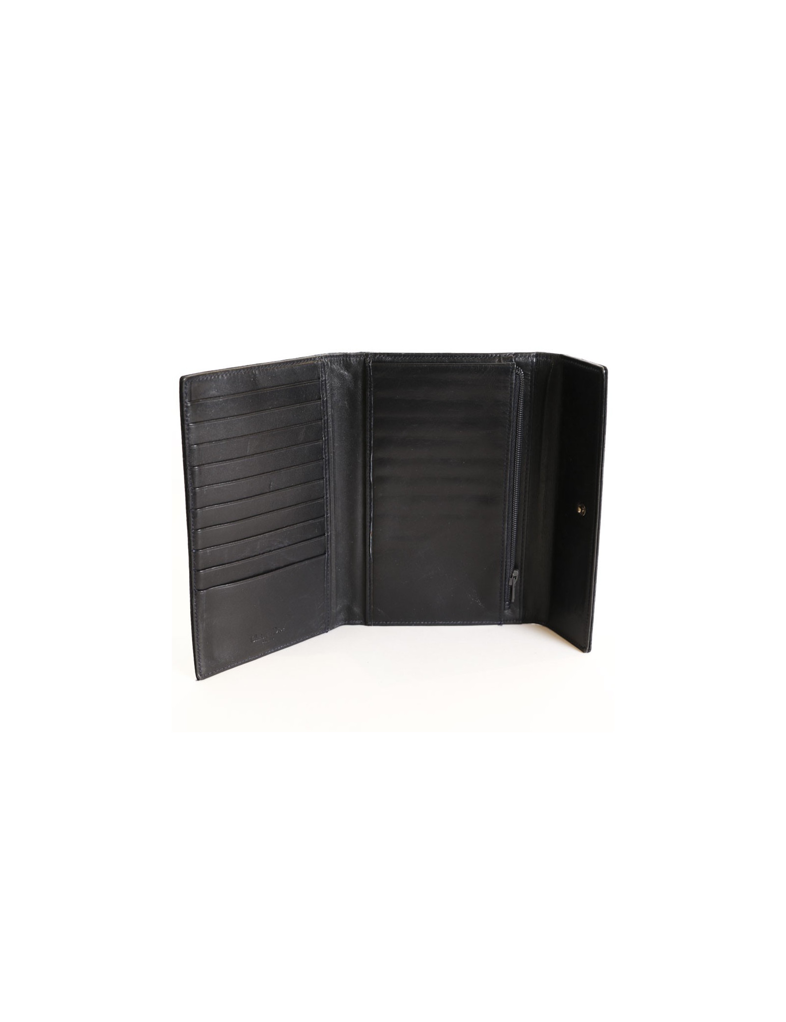 Portefeuille en toile monogram, se fermant par un bouton pression. L'intérieur est en cuir d'agneau noir avec 10 fentes pour cartes de crédit et 40 poches dont une zippée. bijouterie : argent palladié.