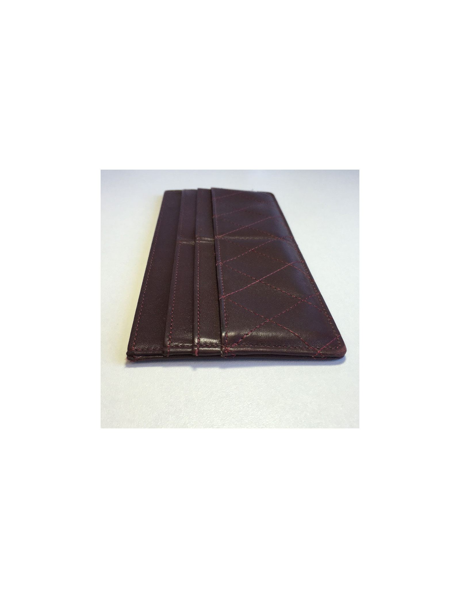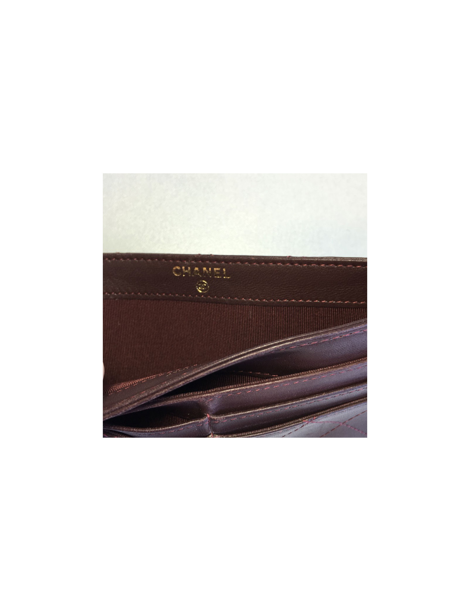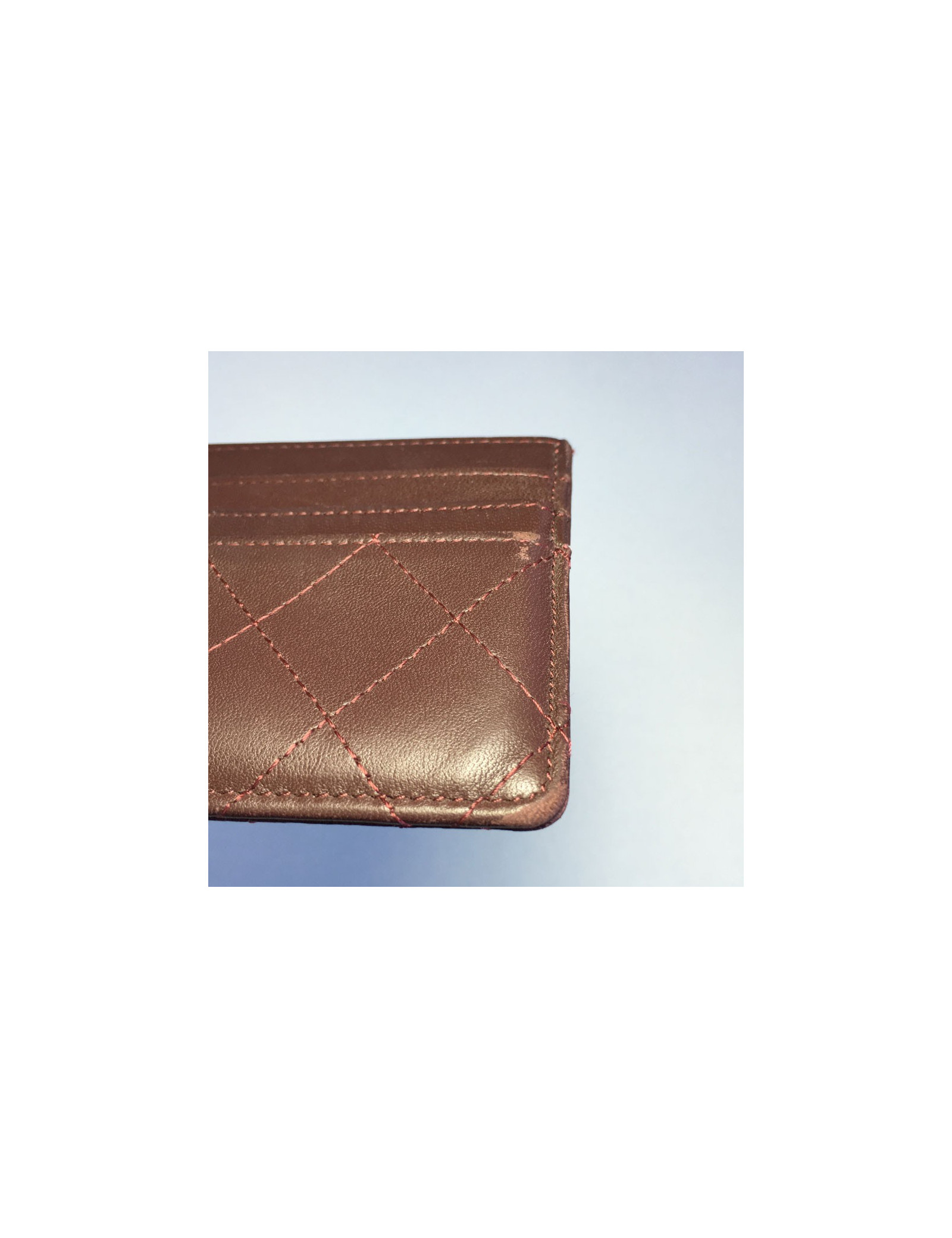 Card holders and tickets Chanel Burgundy quilted leather: 4 card slots and a large crack, then a big crack through. Good condition. the low corners are worn, small stroke of a pen (see photos). No hologram.