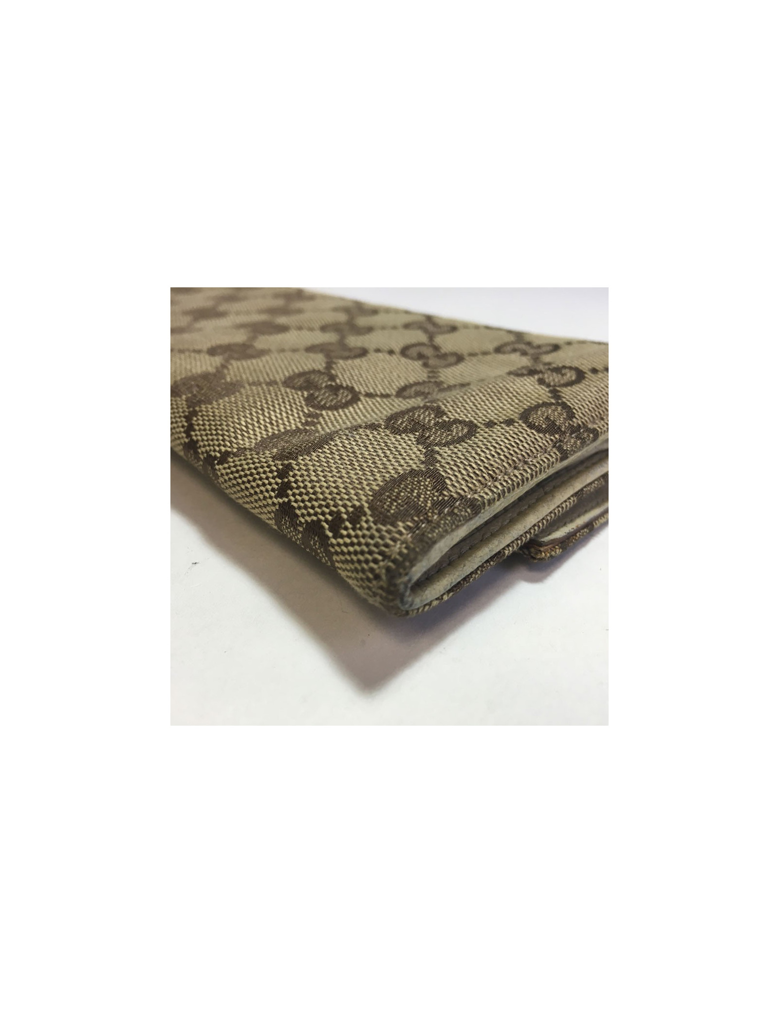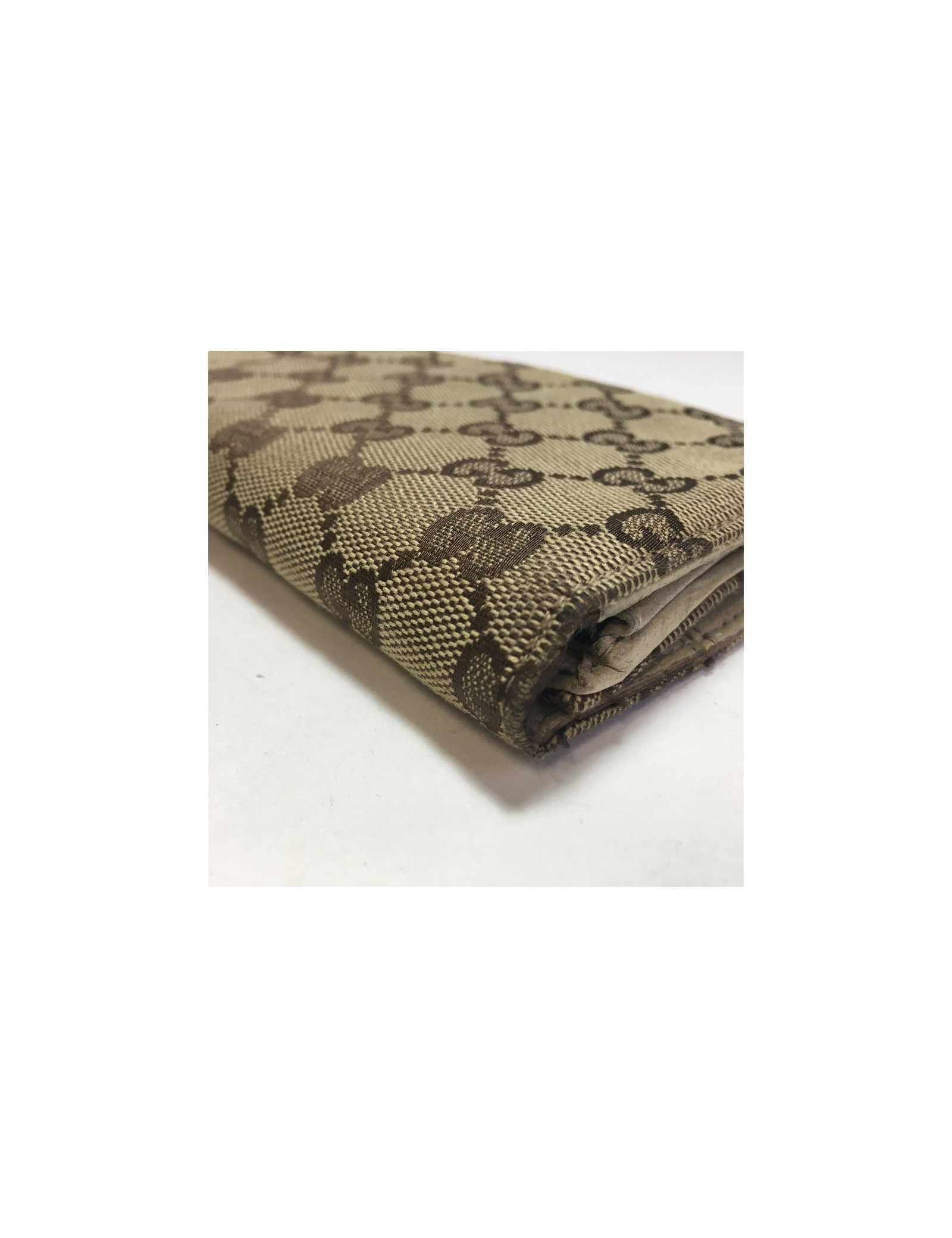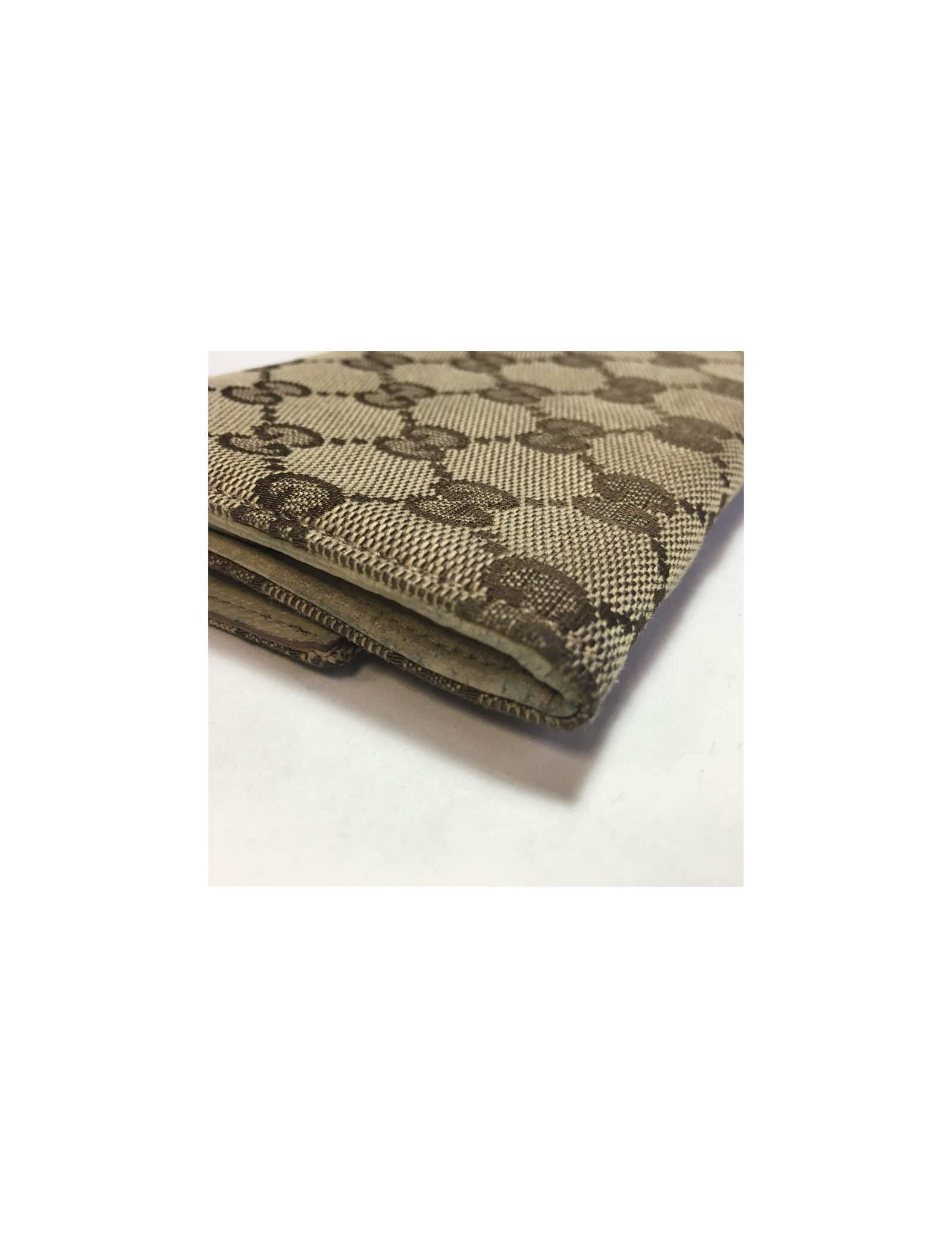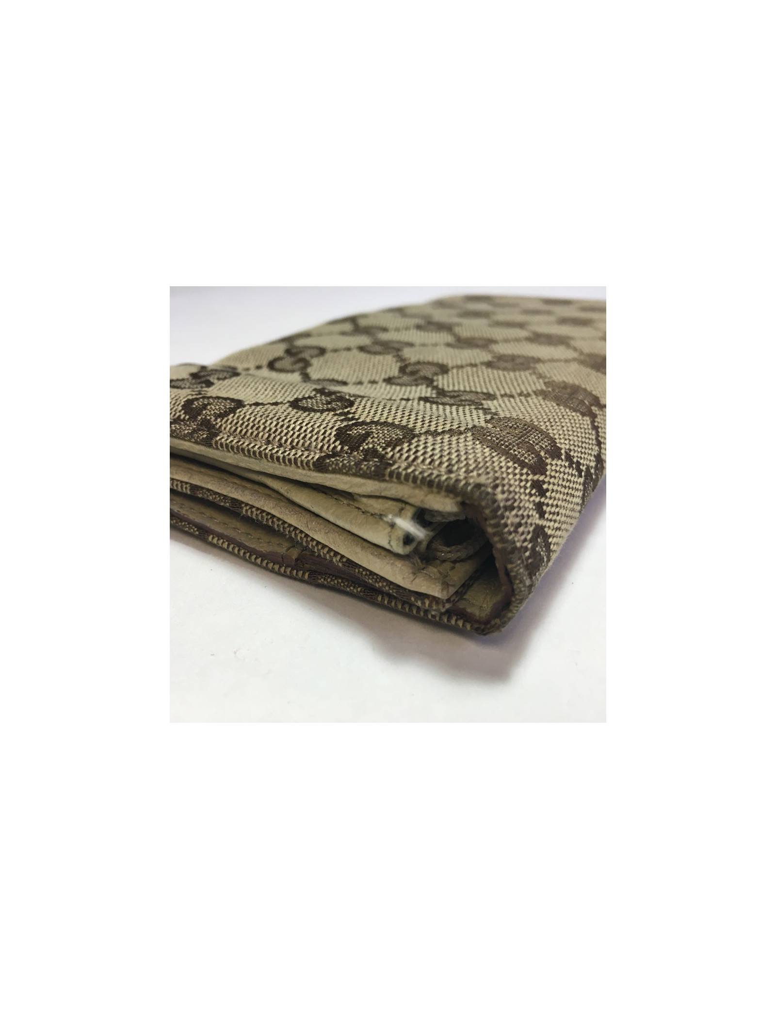 Portefeuille Gucci en toile monogram beige foncé, intérieur en cuir beige clair. Fermoir pression en métal doré (dorure légèrement passée et rayée).
