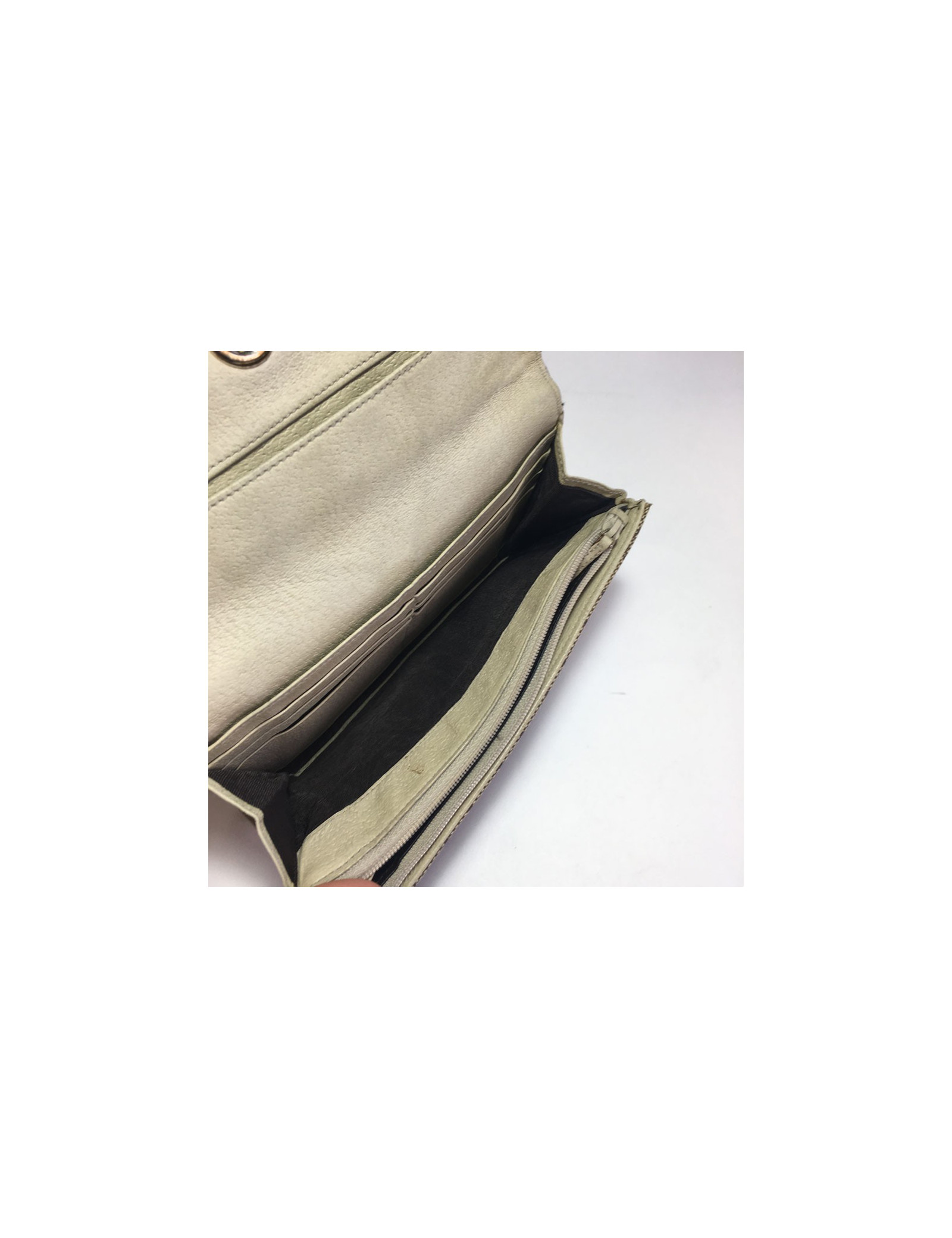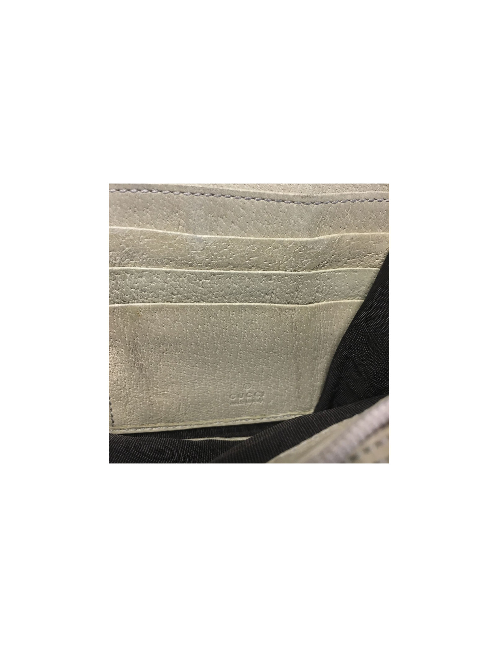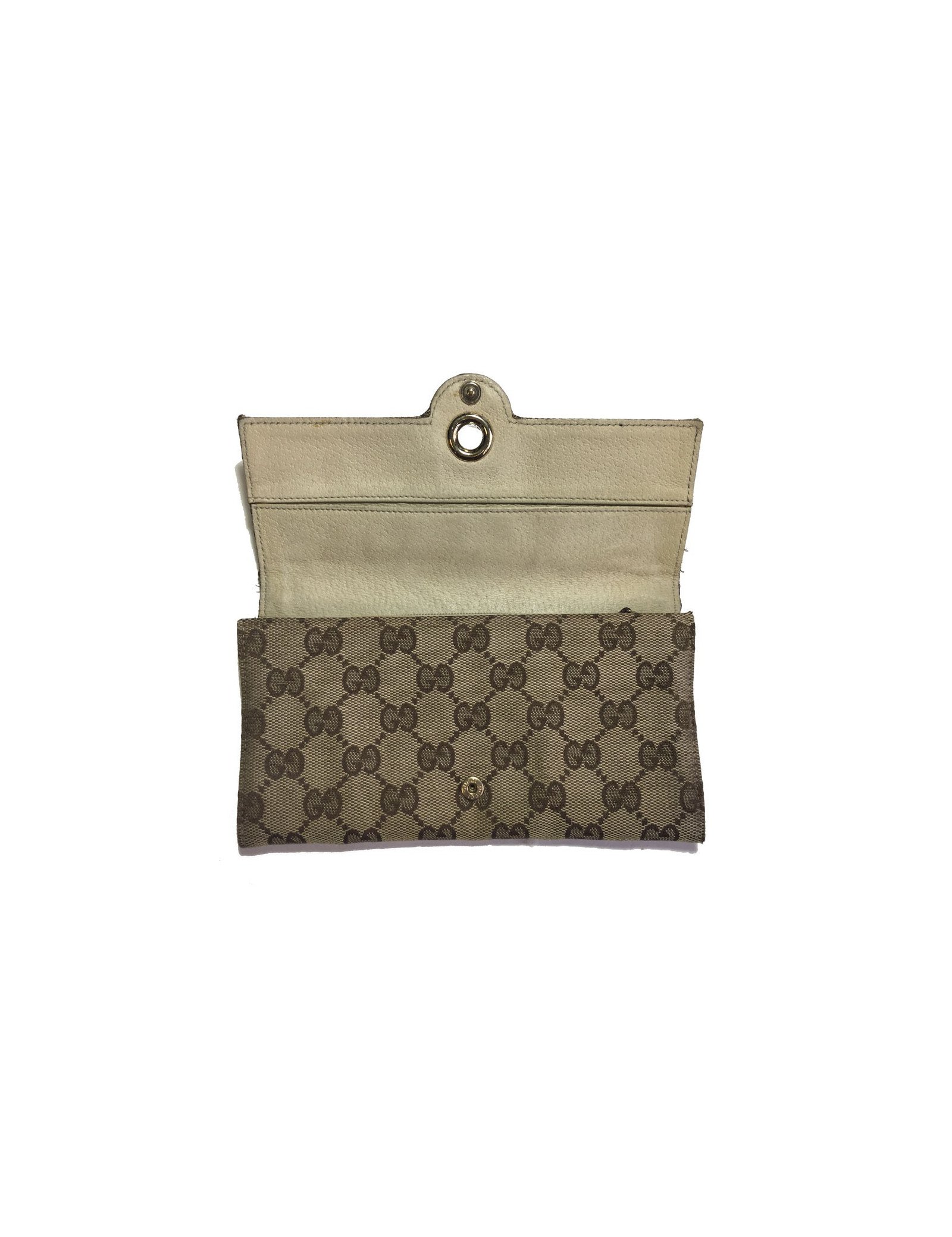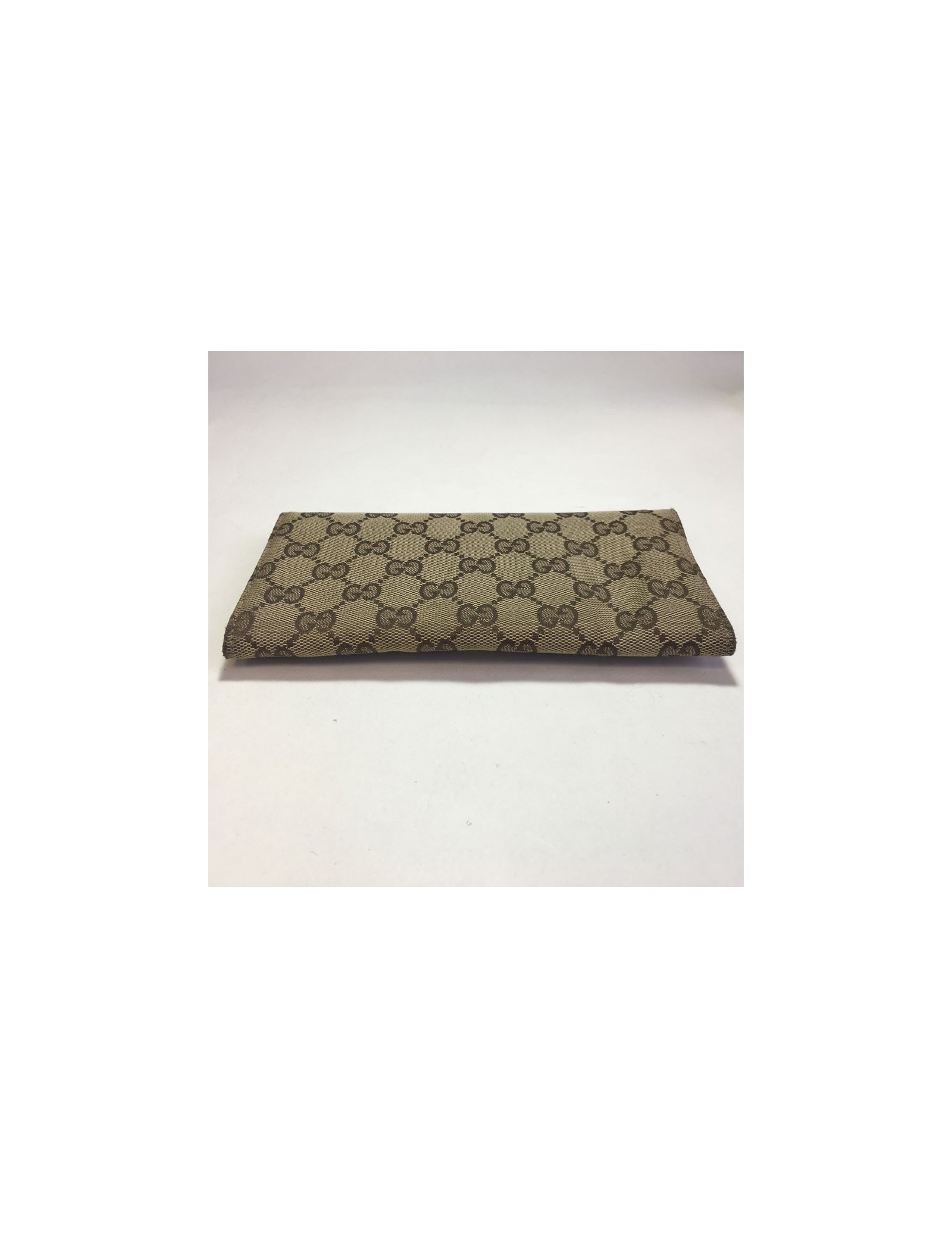 Portefeuille Gucci en toile monogram beige foncé, intérieur en cuir beige clair. Fermoir pression en métal doré (dorure légèrement passée et rayée).
