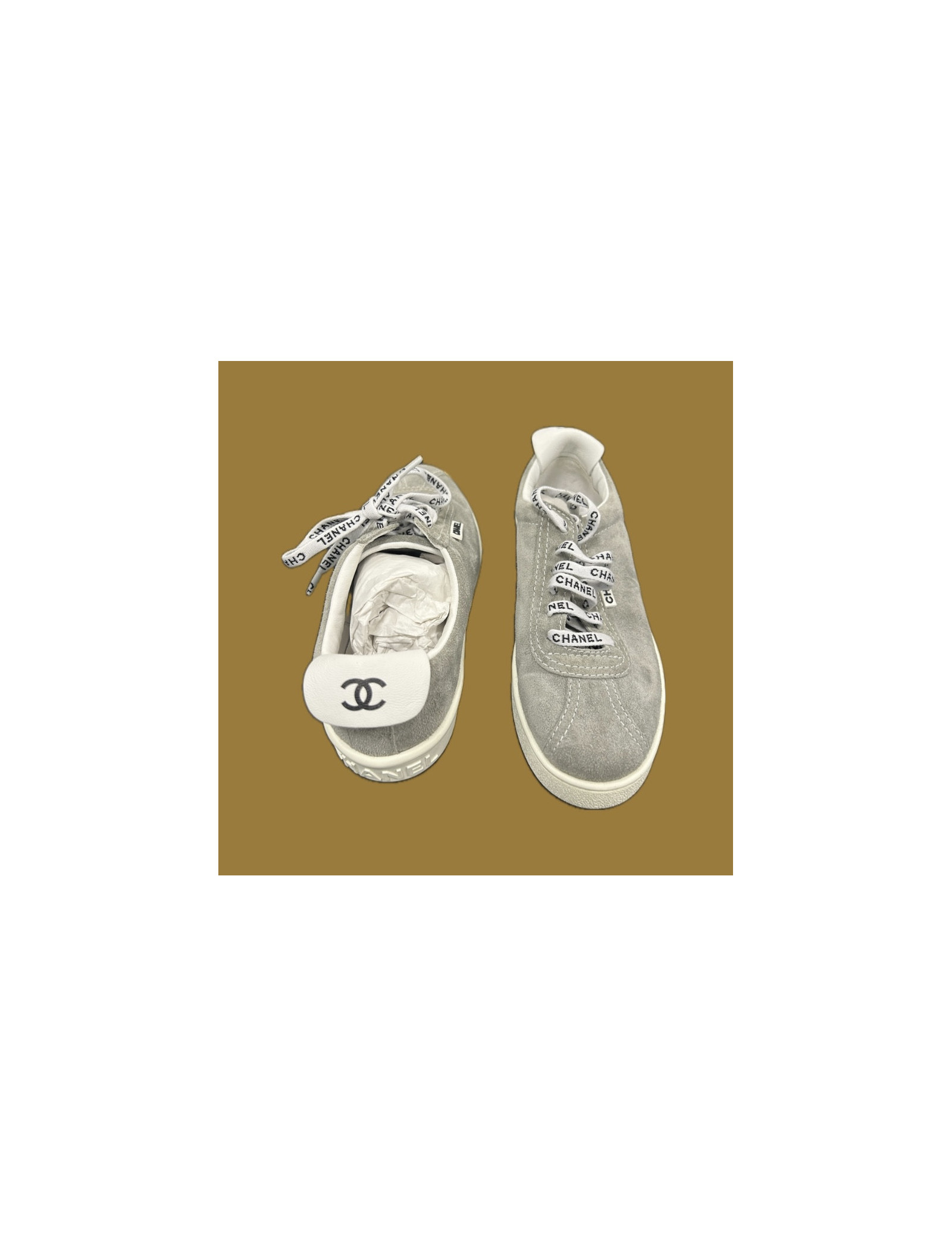 SNEAKERS Tennis CHANEL monogram T38 CHANEL 15566 368.00 € Chanel sneakers in grey monogram canvas. Size 38. New condition. Ppublic RIX 650 euros. will be delivered in a box Chanel Add to cart