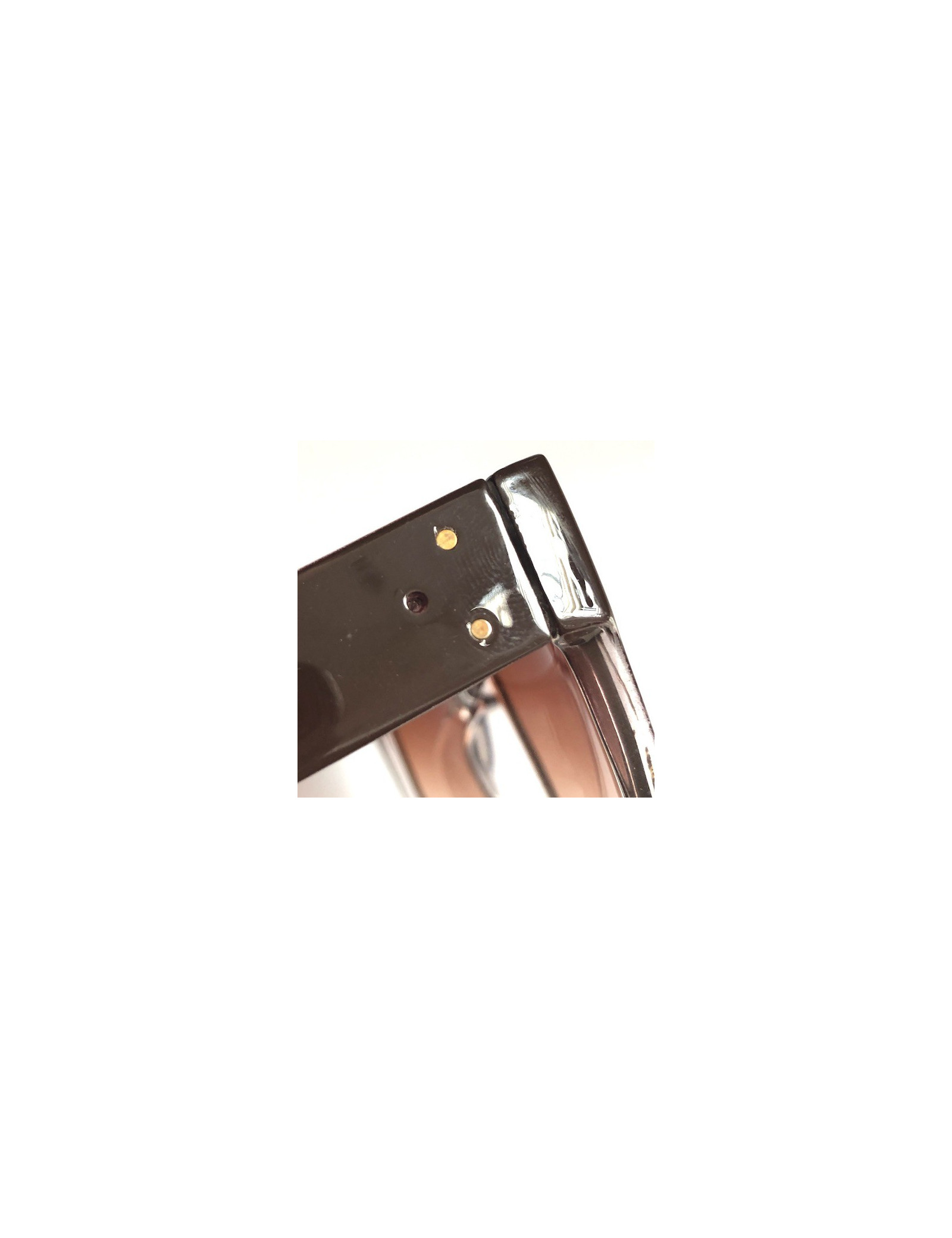 Sunglasses with gradient color lenses. Gold hardware. Wide arms. They are in very good condition, with micro-scratches on the plastic and 1 decorative stud missing (see photo).