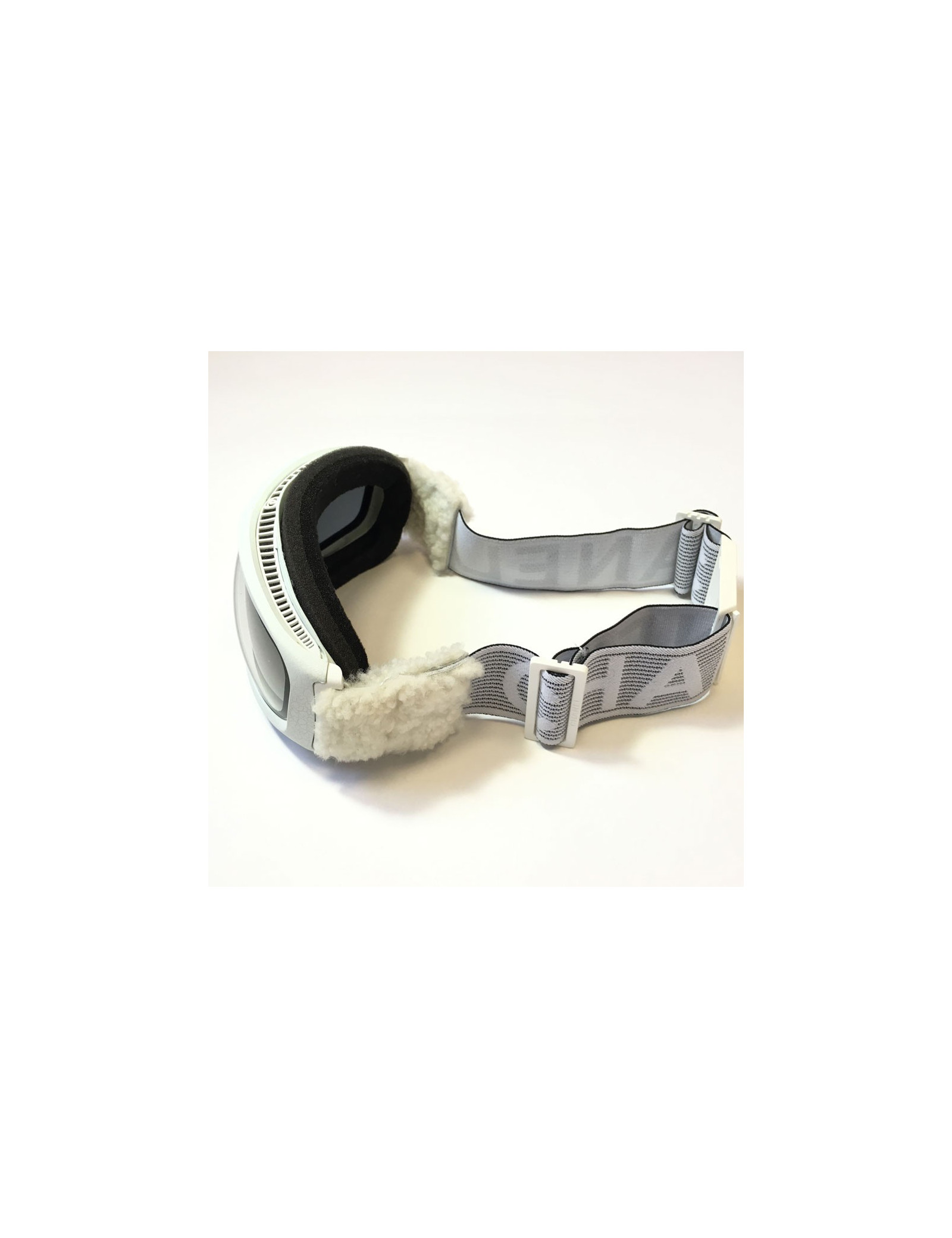 To be trendy on the slopes! CHANEL ski mask. Frame white with crackle effect. Elasticated strap on the sides, CHANEL inscription in white. Clasp clip in white plastic with a CC on it. Dark glasses.
