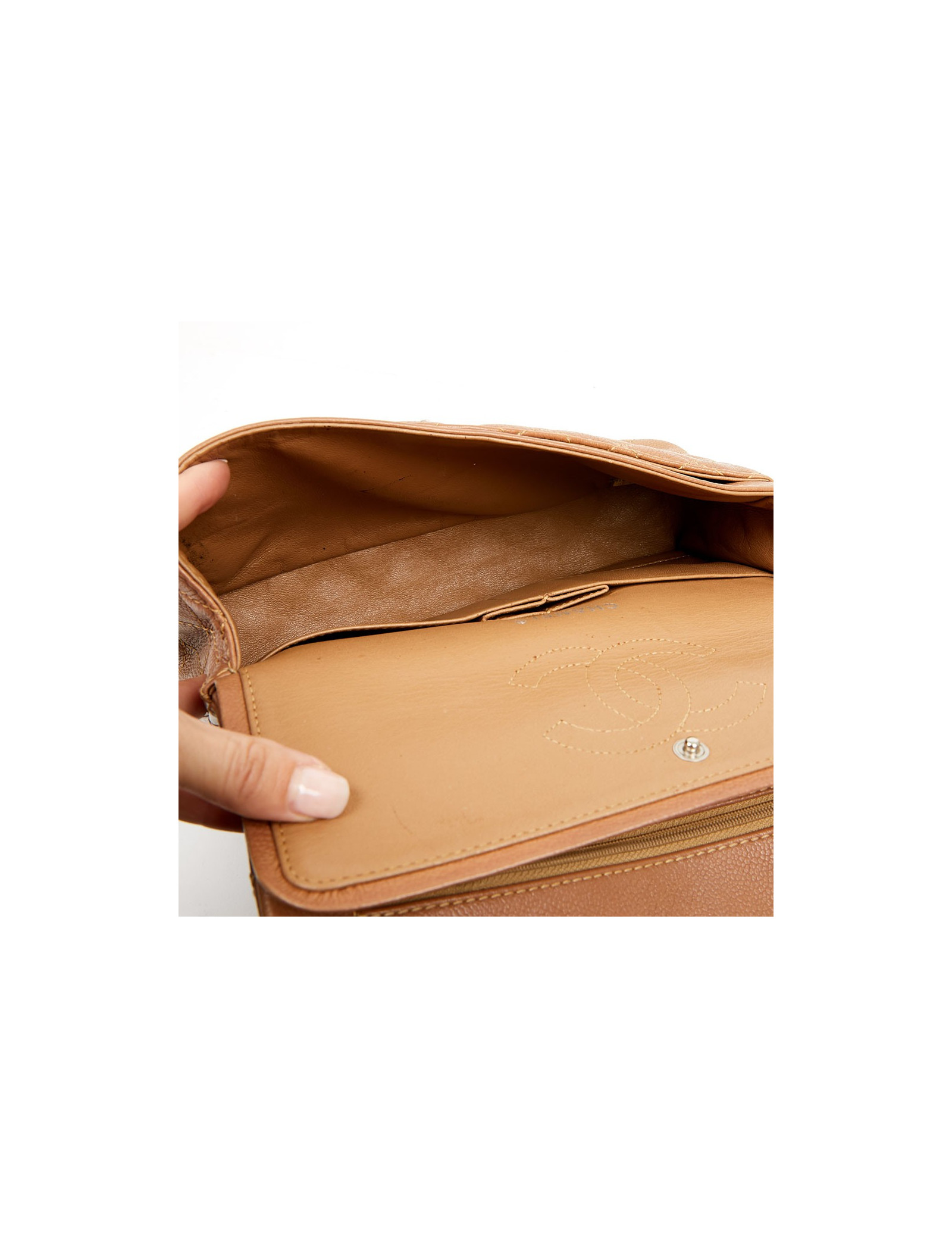 The beige stitching gives it a quilted effect. It is lined with smooth leather with two flat pockets, at the back a patch pocket. One of the distinctive features of Timeless is the secret compartment under the flap.
