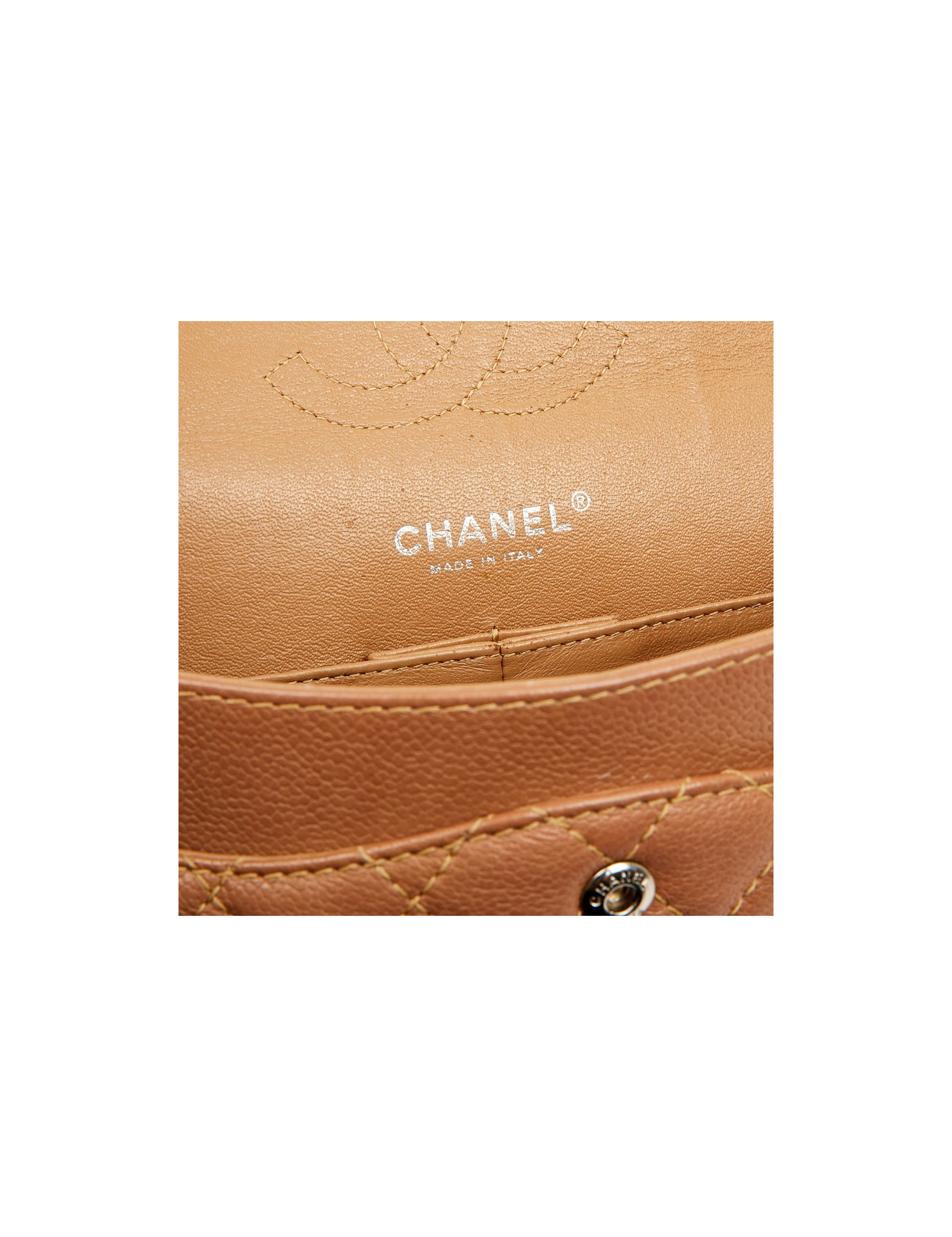 It has a double flap with an interlaced Mademoiselle double C clasp engraved with the name of the House.