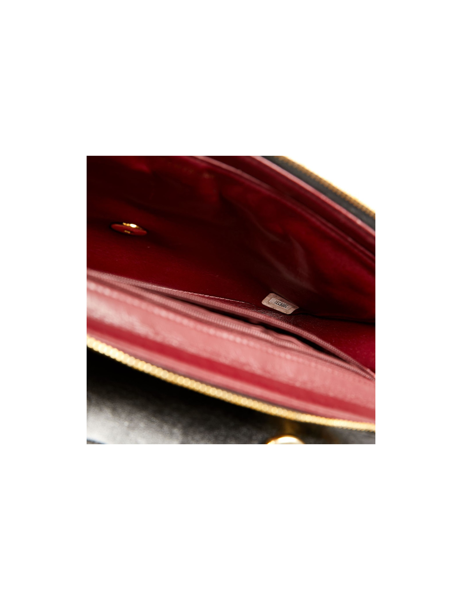 The interior is in burgundy leather. It closes with a golden zip. It can be worn on the shoulder or crossbody with a leather interlaced shoulder strap in gold tone.