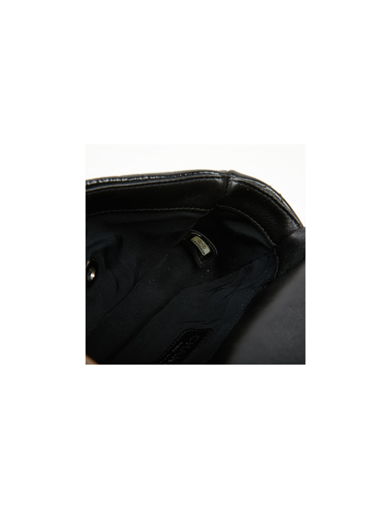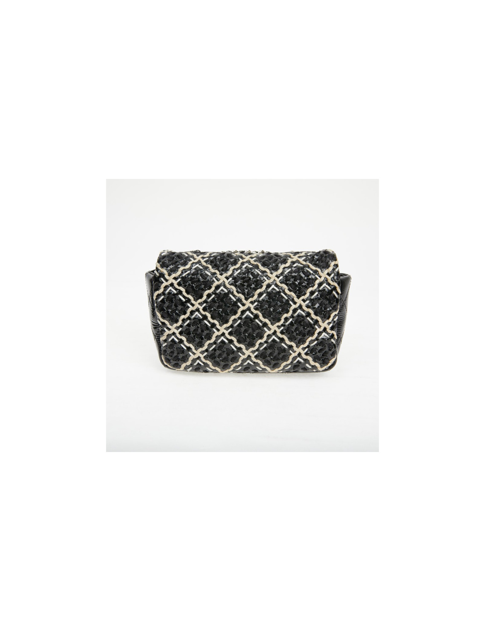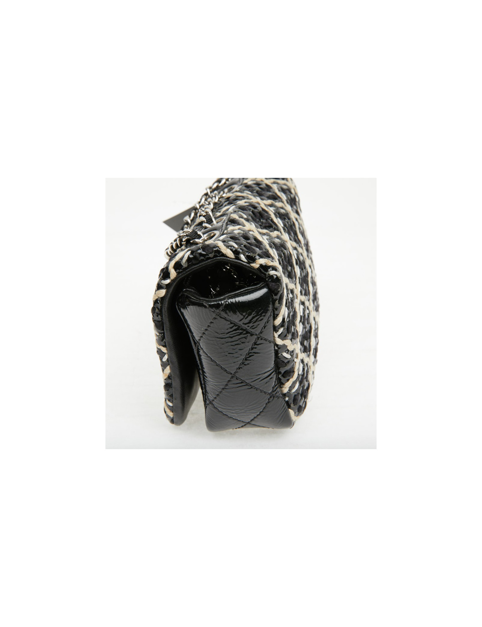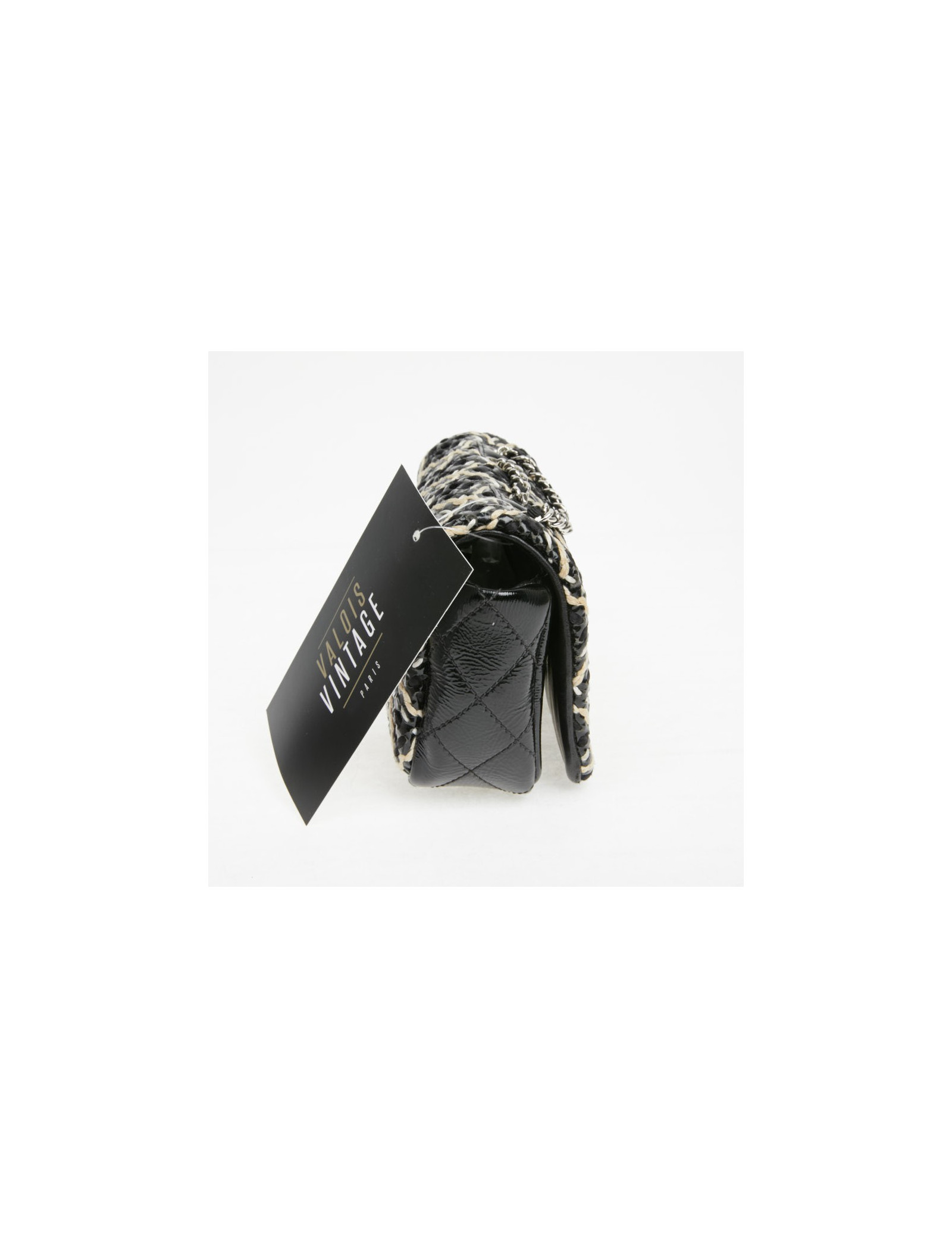 It is in patent leather braided in superposition on a smooth black leather. It is embroidered with a beige cord thread. The hardware is in palladium silver metal. The interior is lined in black canvas with a small black canvas pocket.