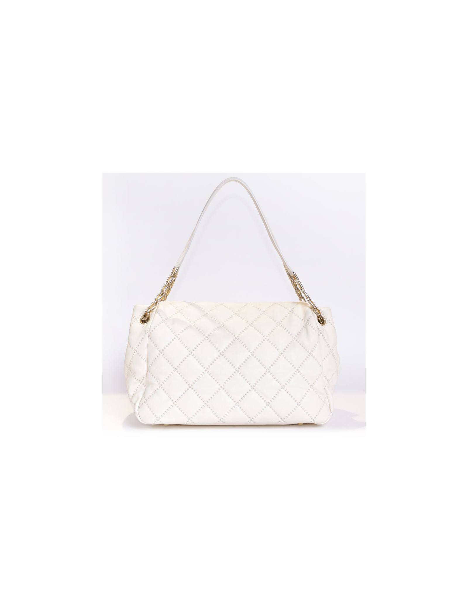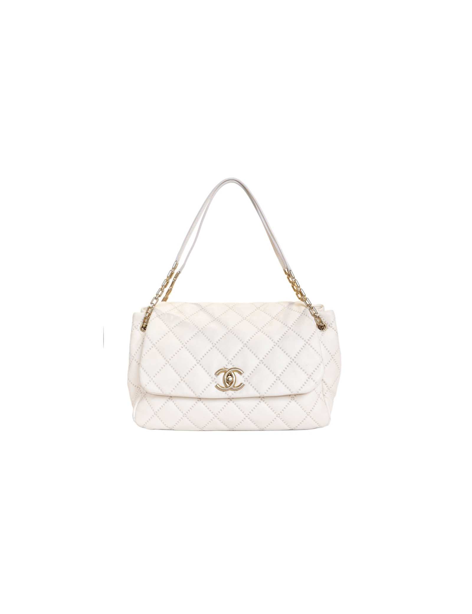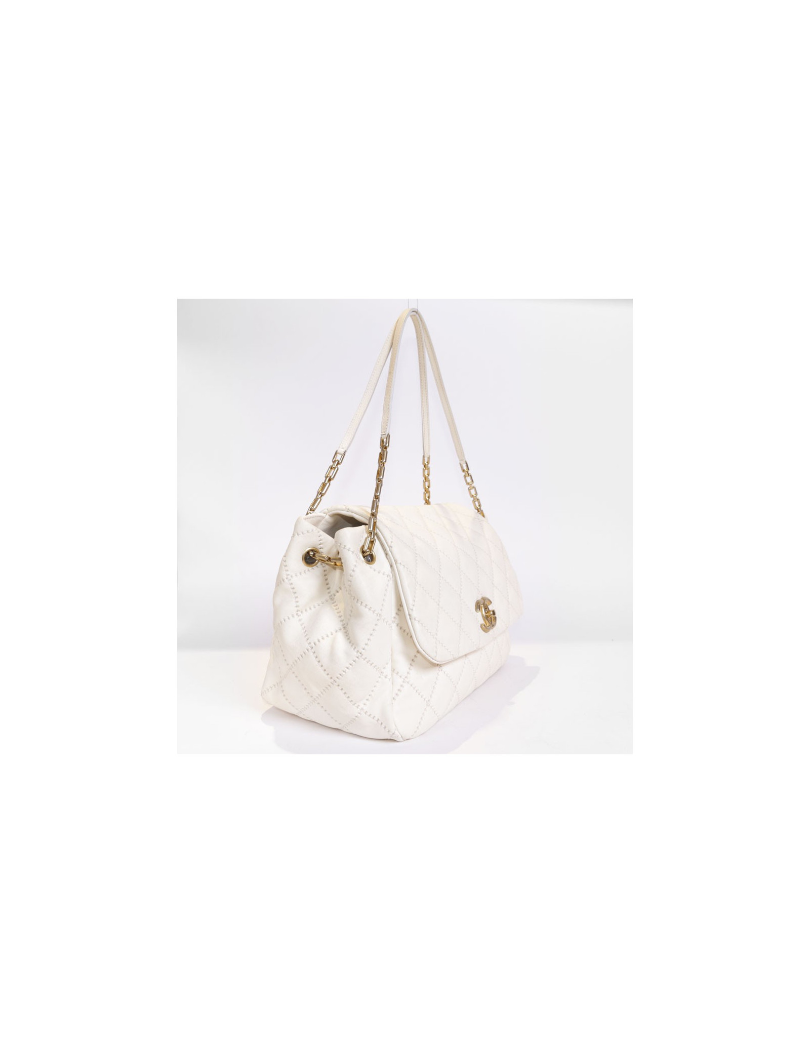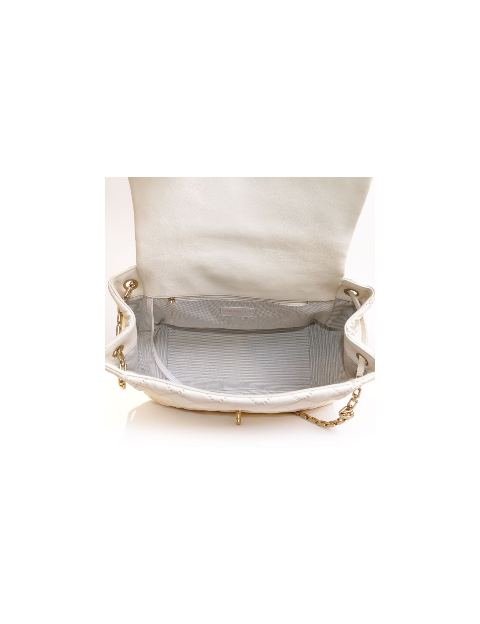 Bag leather eggshell quilted Chanel House. The jewelry is gold metal aged patina. Clasp 'CC'. The Interior is canvas with 3 pockets including 1 zipped and 1 for smartphone. Hologram: 1660... No authenticity card.