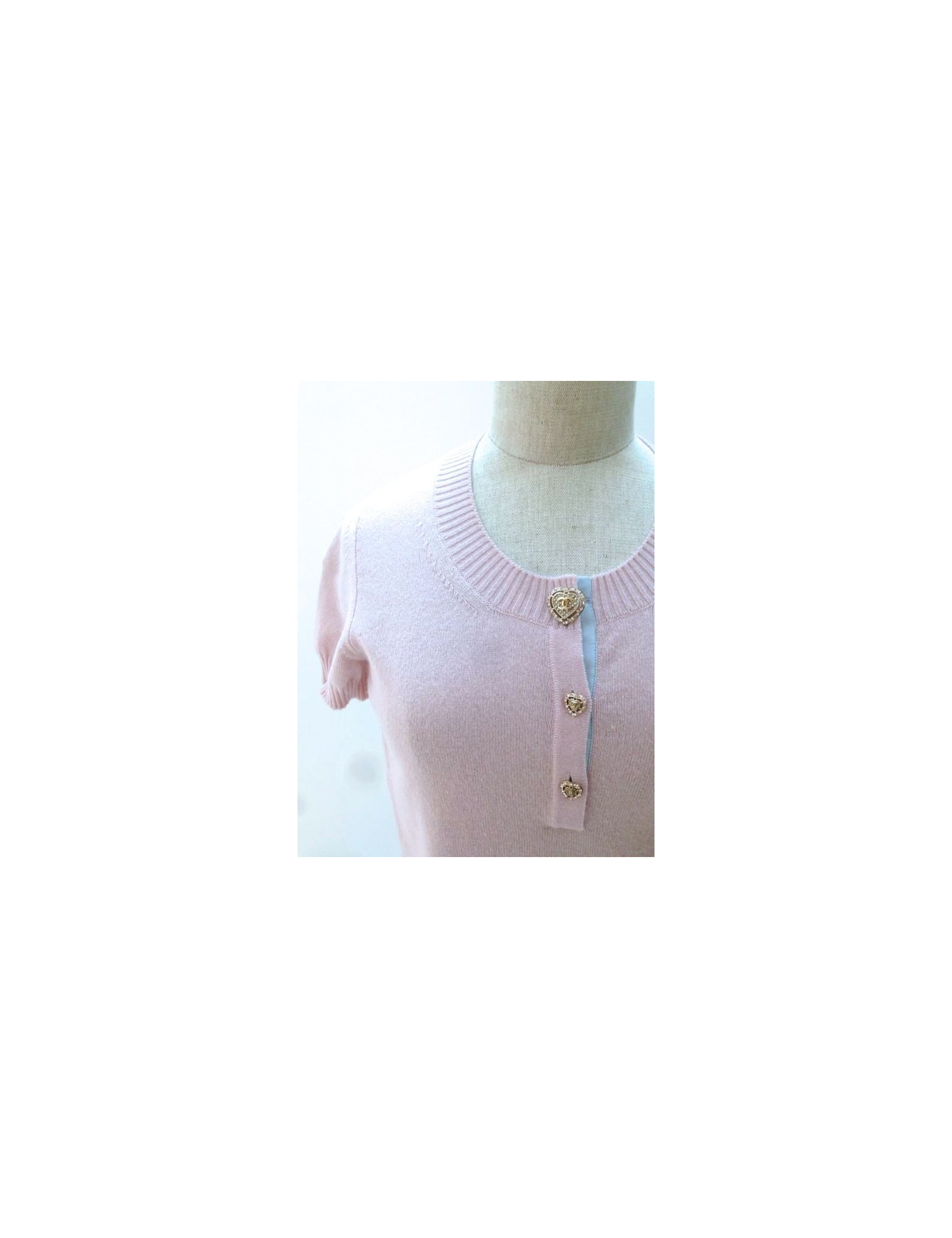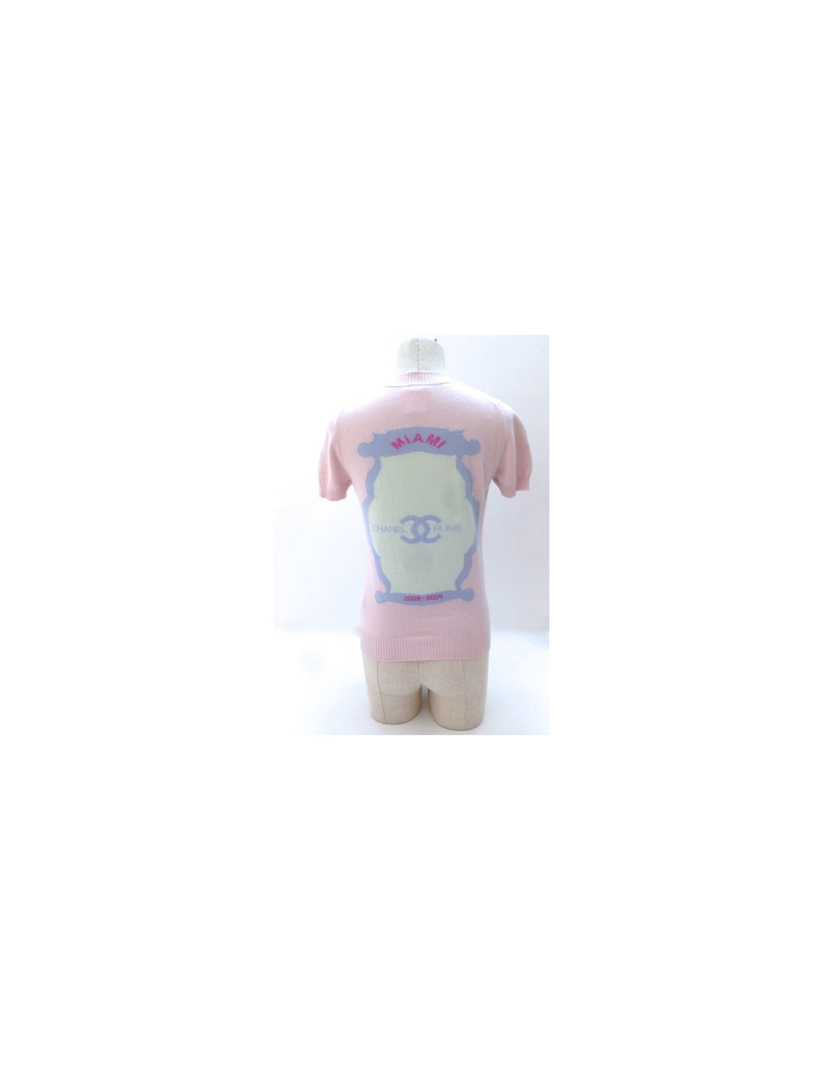 Top CHANEL, size 36, cruise 2009 collection. This feminine piece can be worn very casual. At the front, collar is adorned with three stunning gold, heart shaped, acronyms CC, and surrounded by silver and pale pink rhinestone buttons. The back is embroidered a drawing in the form of baroque mirror, color sky blue, light yellow. There are inscribed "MIAMI", "CHANEL CRUISE", "2008-2009 '.