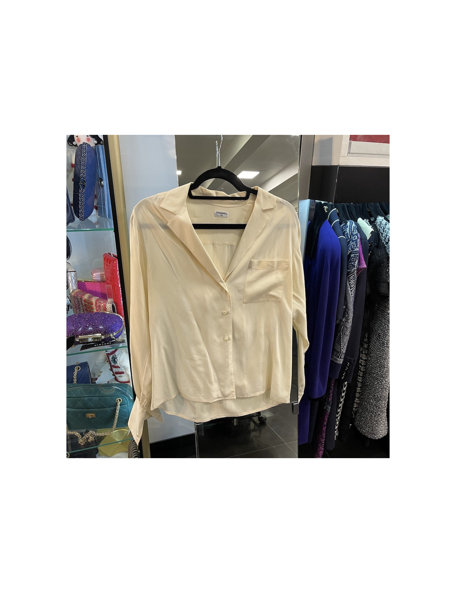 TOPS/BLOUSES Chanel navy blue silk and cotton Blouse CHANEL 20257 700.00 € CHANEL silk and cotton navy and ink blue blouse Condition: very good Materials : cotton, silk Lining: silkColors : navy, inkSize: 38FRMade in Italy Measurements: shoulders 38cm, bust 44cm, height 62cm, bottom width 50cm Details: Beautiful Chanel backless blouse in navy blue and ink cotton and silk. Zipper along the lower back. Details: cut-out ruffles... Add to cart