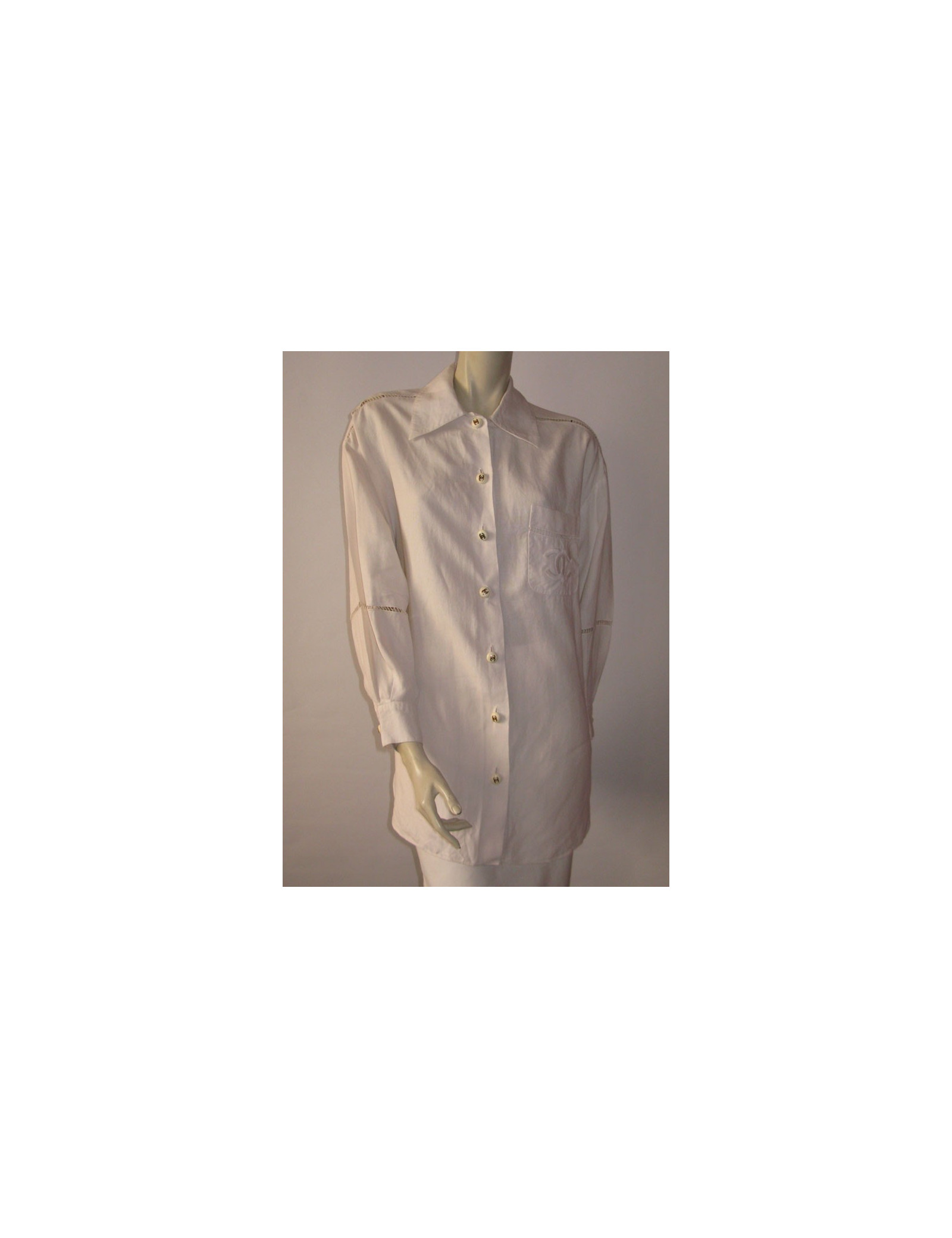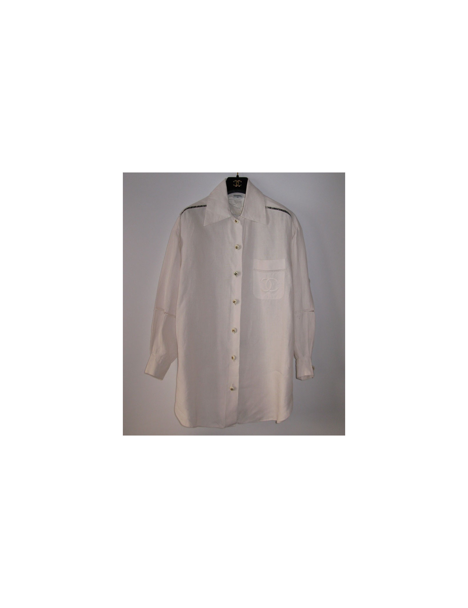 A basic to have in her wardrobe! Shirt Chanel vintage white linen, classic collar, long sleeves, cut over size, 1 pocket on the CC logo embroidered left chest. Shirt punched on the shoulder line, back, sleeves and on the top of the chest pocket. Low round, front closure and cuffs to acronyms white CC buttons in gold. Size 38fr see even 40 fr due to its shape. 100% linen.
