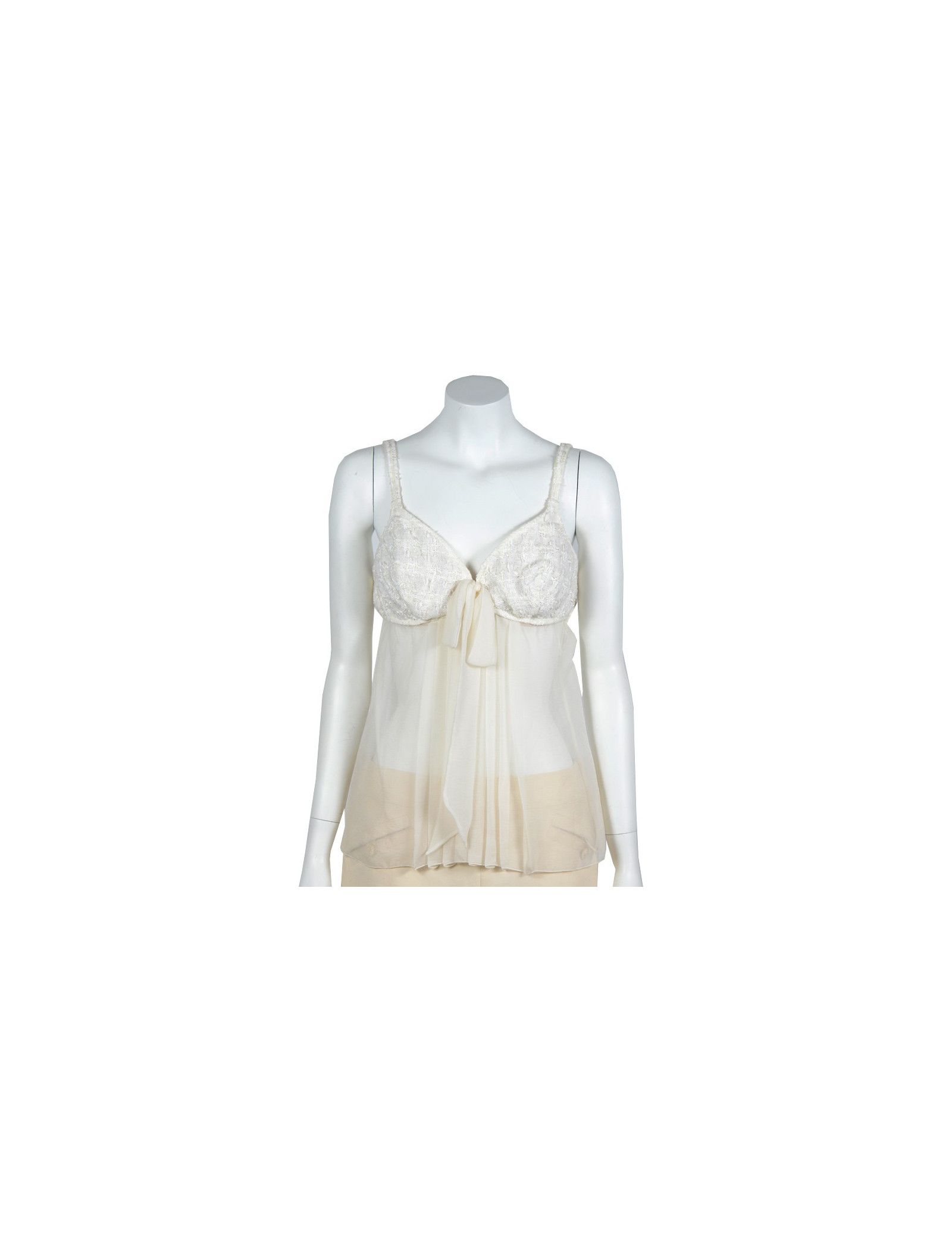Top Camisole Chanel size 42, from cruise 2005 collection. It is silk and ivory colored cotton. The top covering the chest is tweed, a frame of bra is incorporated for comfort. The fell is chiffon cream color and the pretty node that is there. Closure on the side by three mother-of-Pearl buttons CC. It is in very good condition