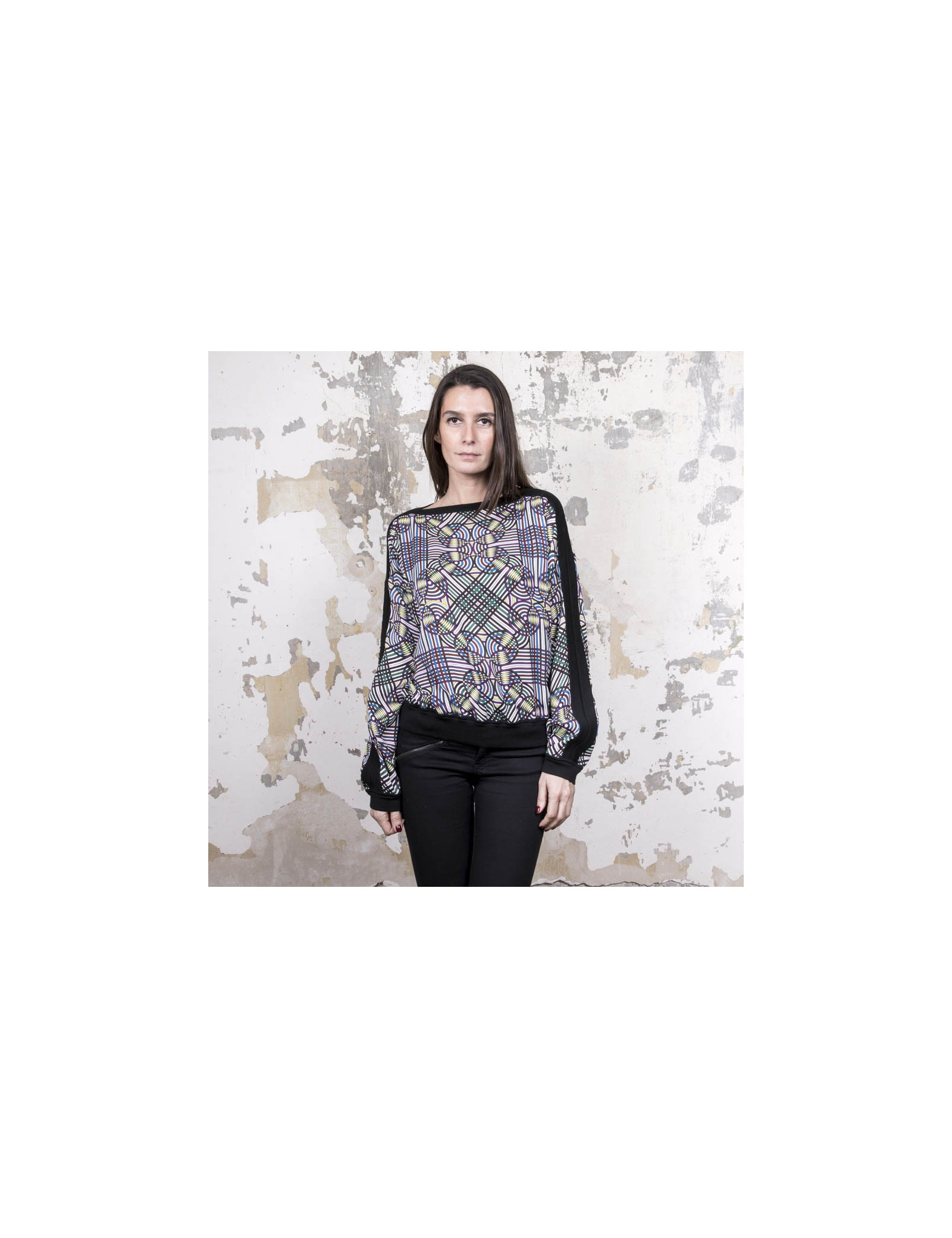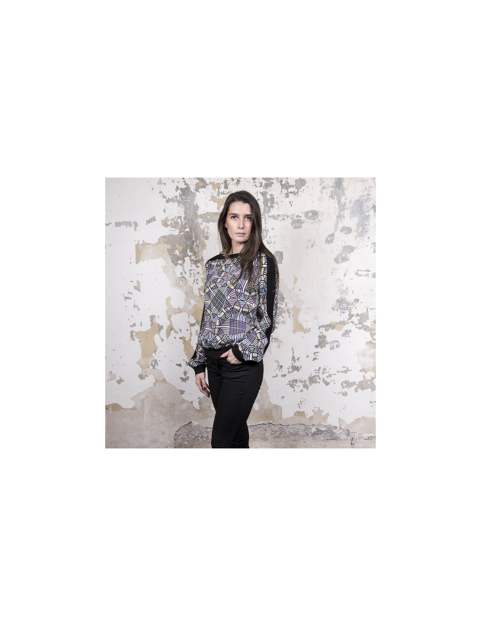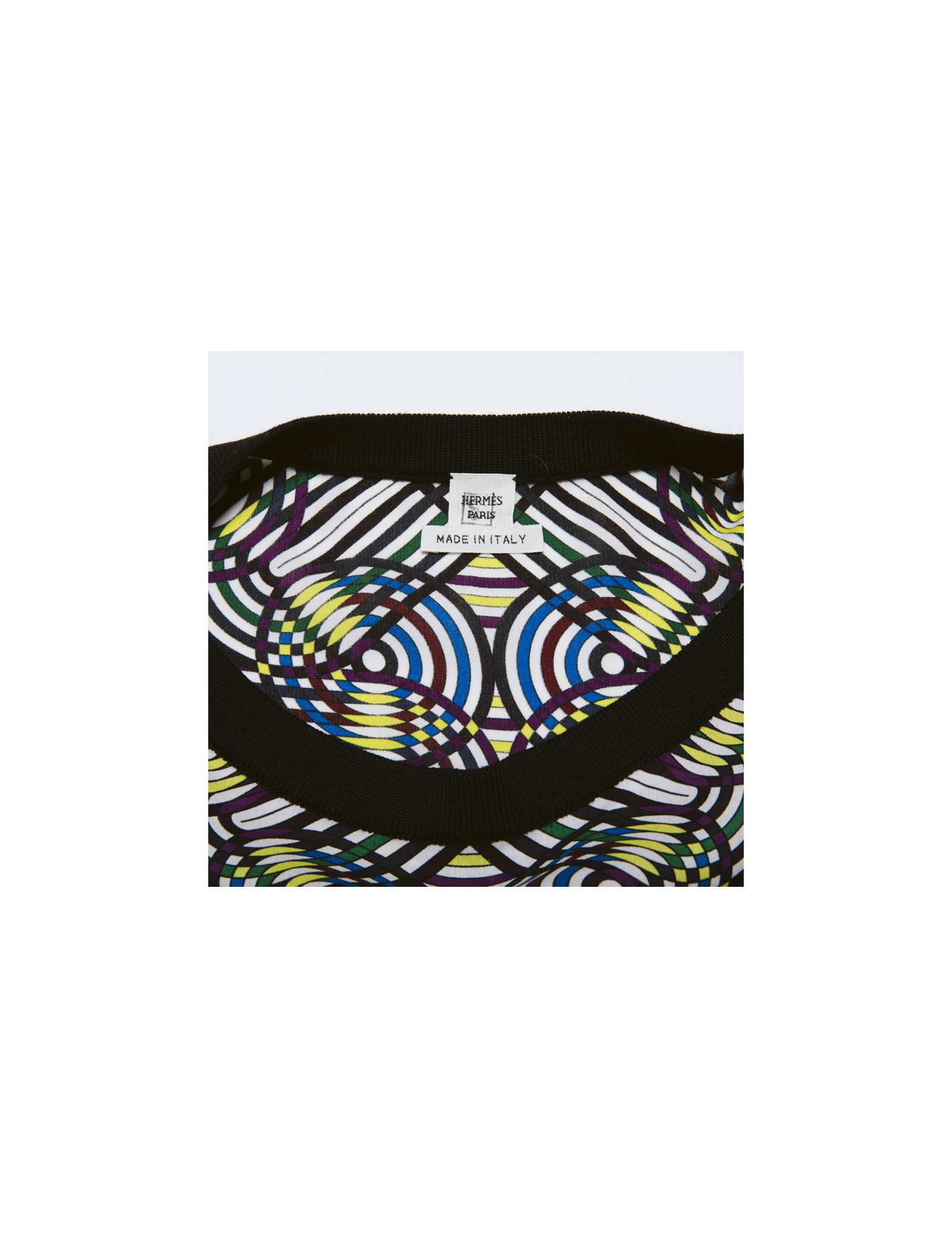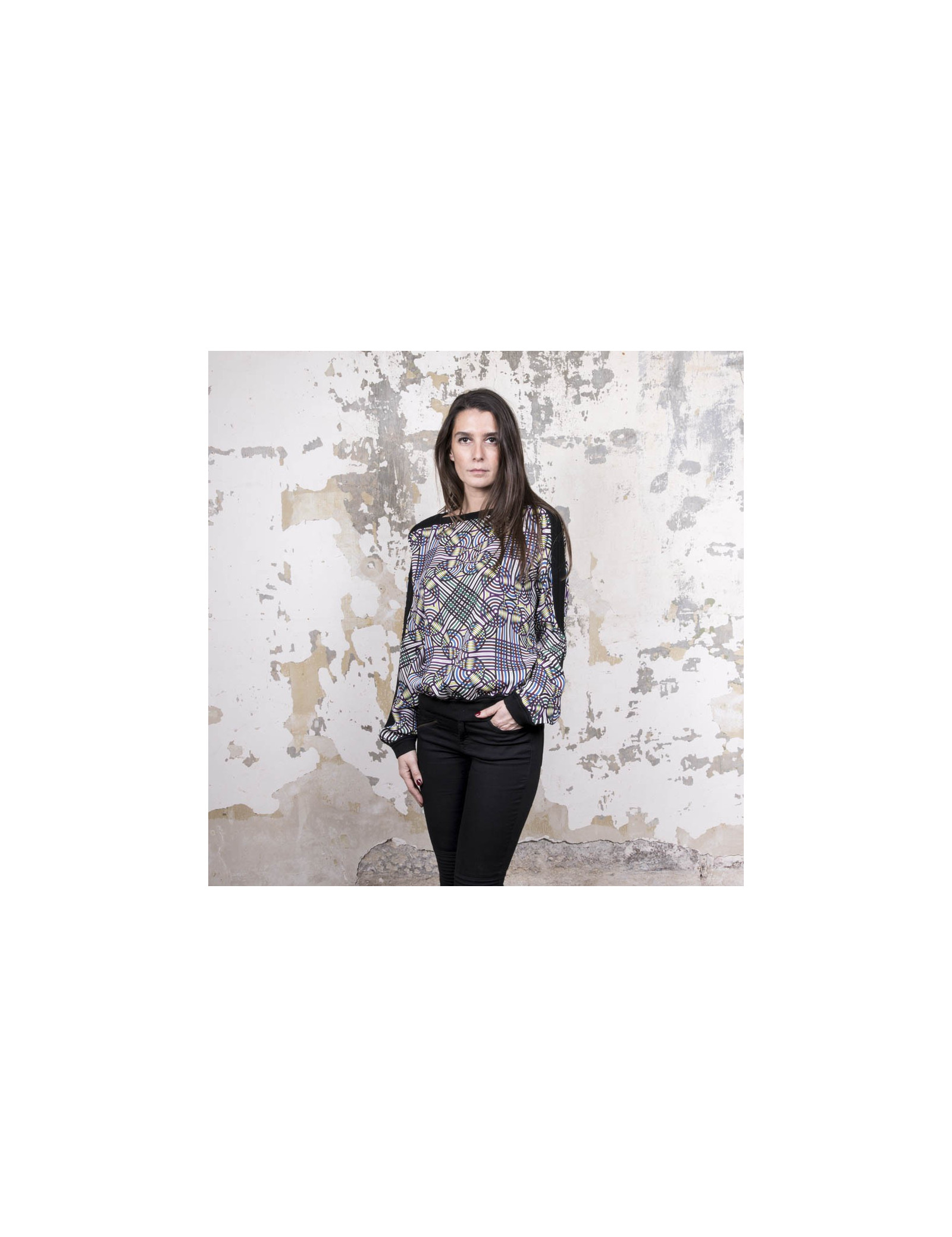 Blouse Vintage HERMES en soie motifs floraux bleu et jaune