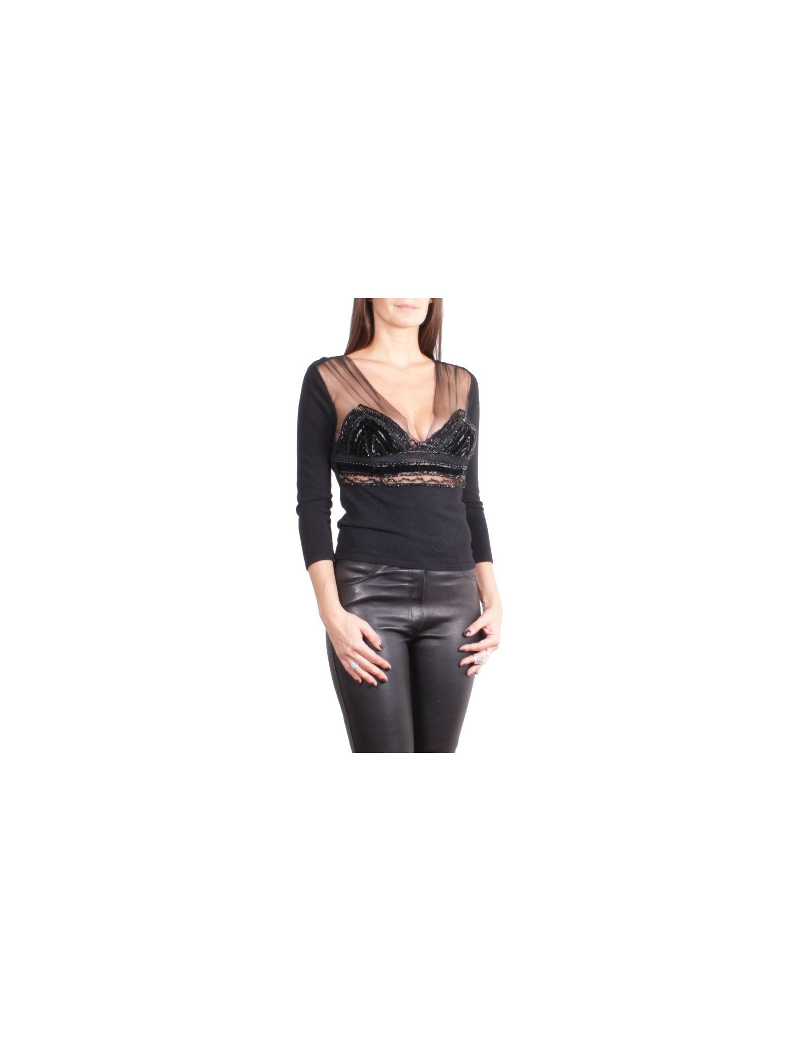 Top VALENTINO T 38 EN, wool and cashmere, embroidered with sequins and black pearls on the chest in black tulle.