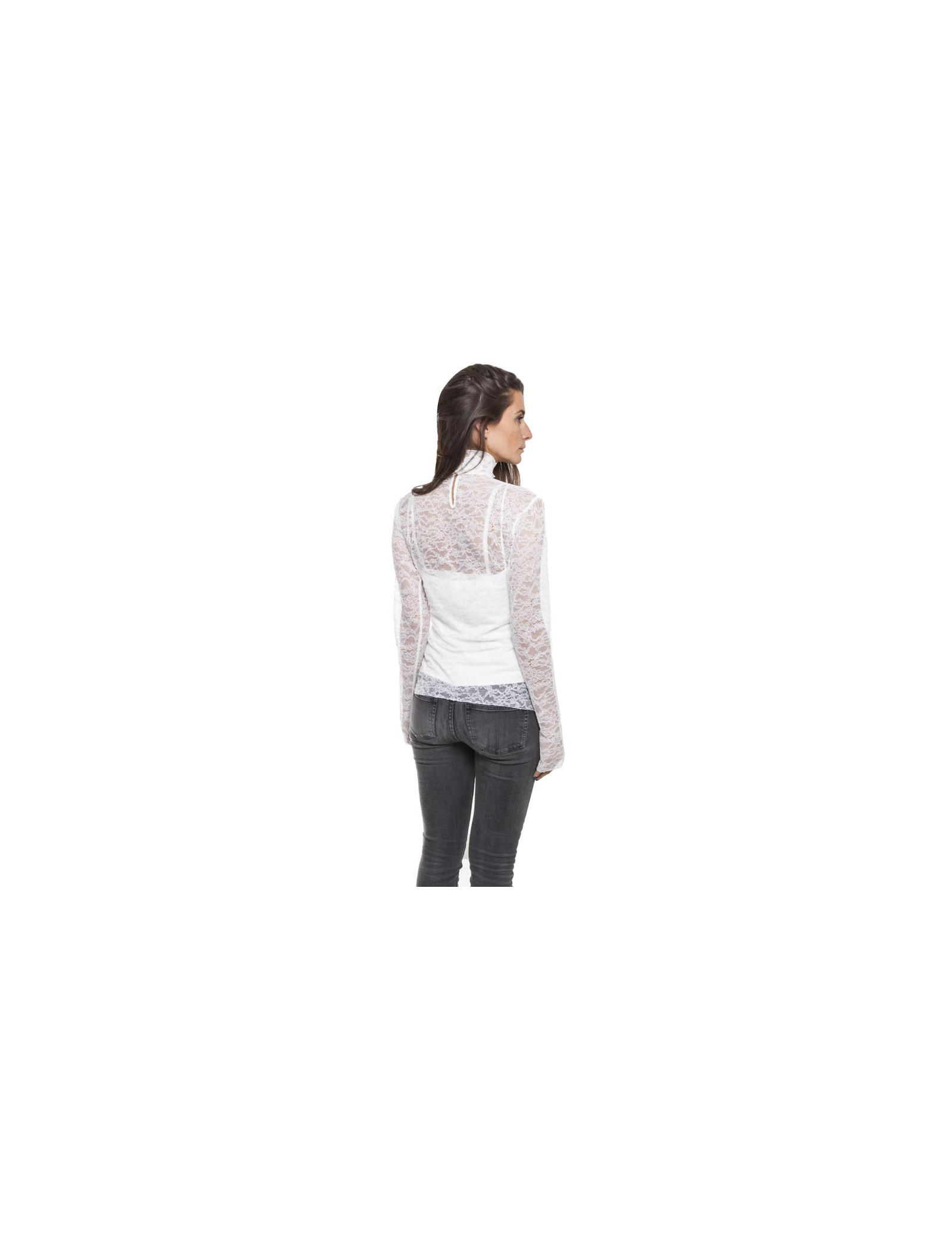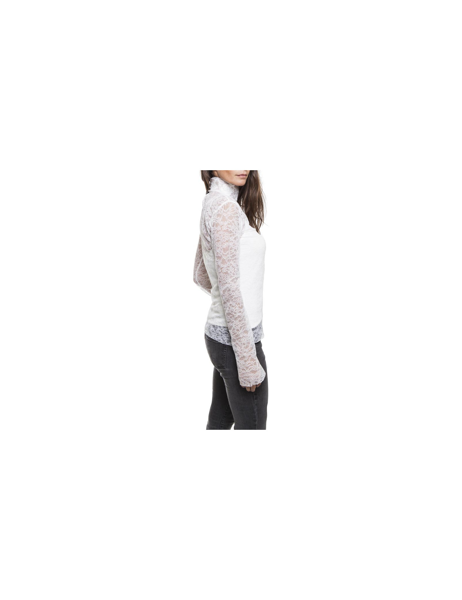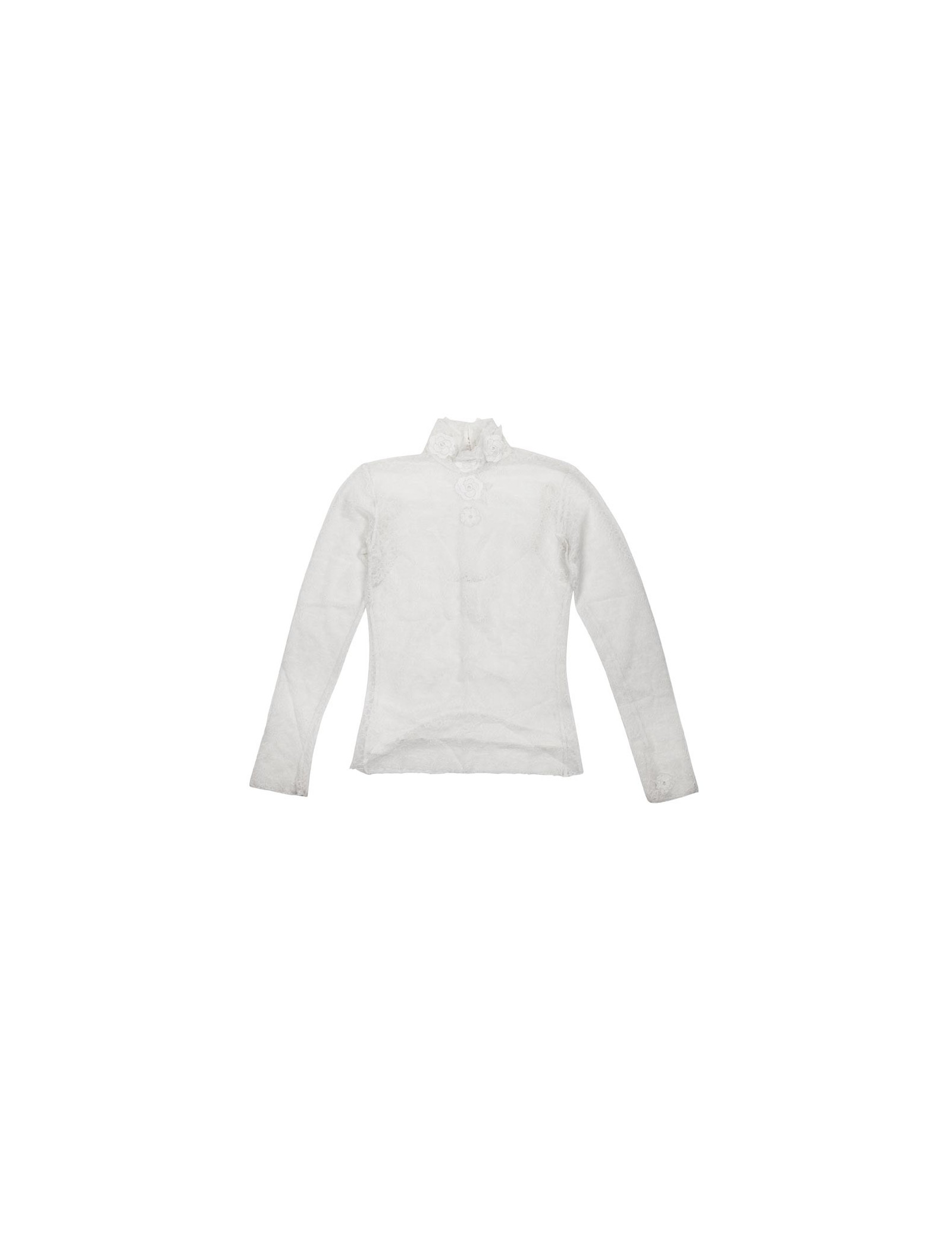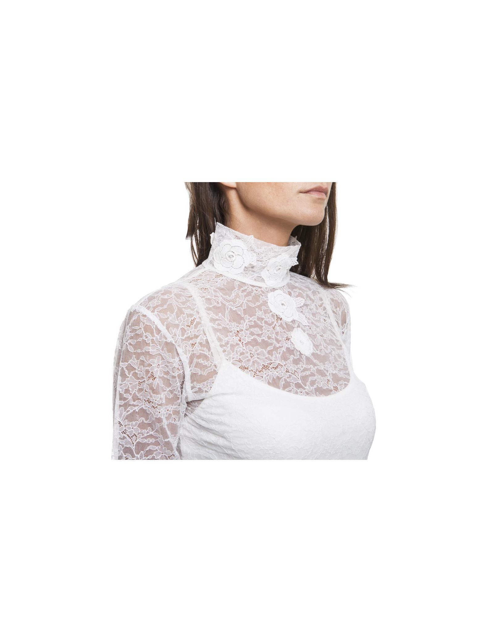 CHANEL blouse in off-white lace and its cotton caraco. Long sleeves, high collar and 4 pearly pearl buttons on the back of the neck.