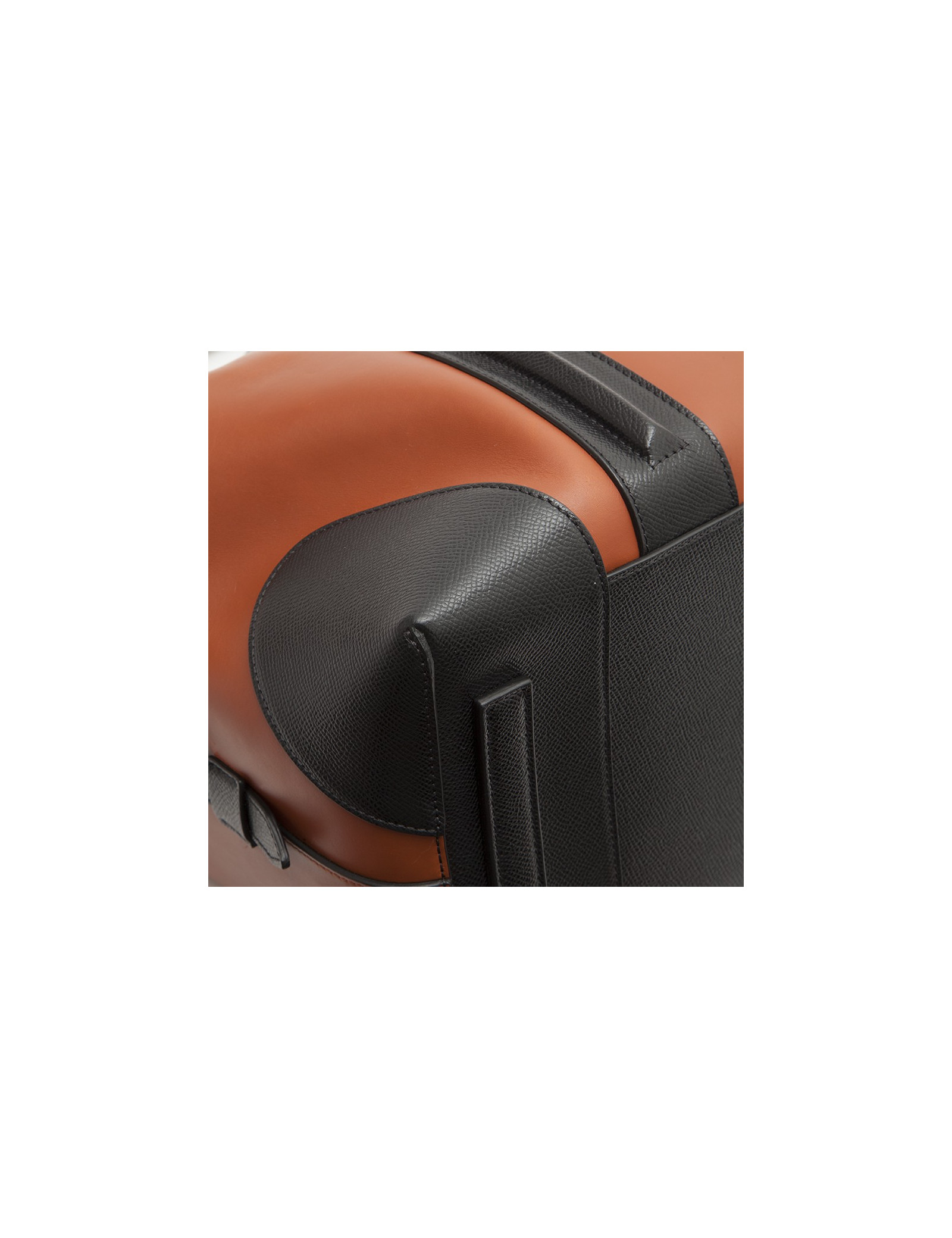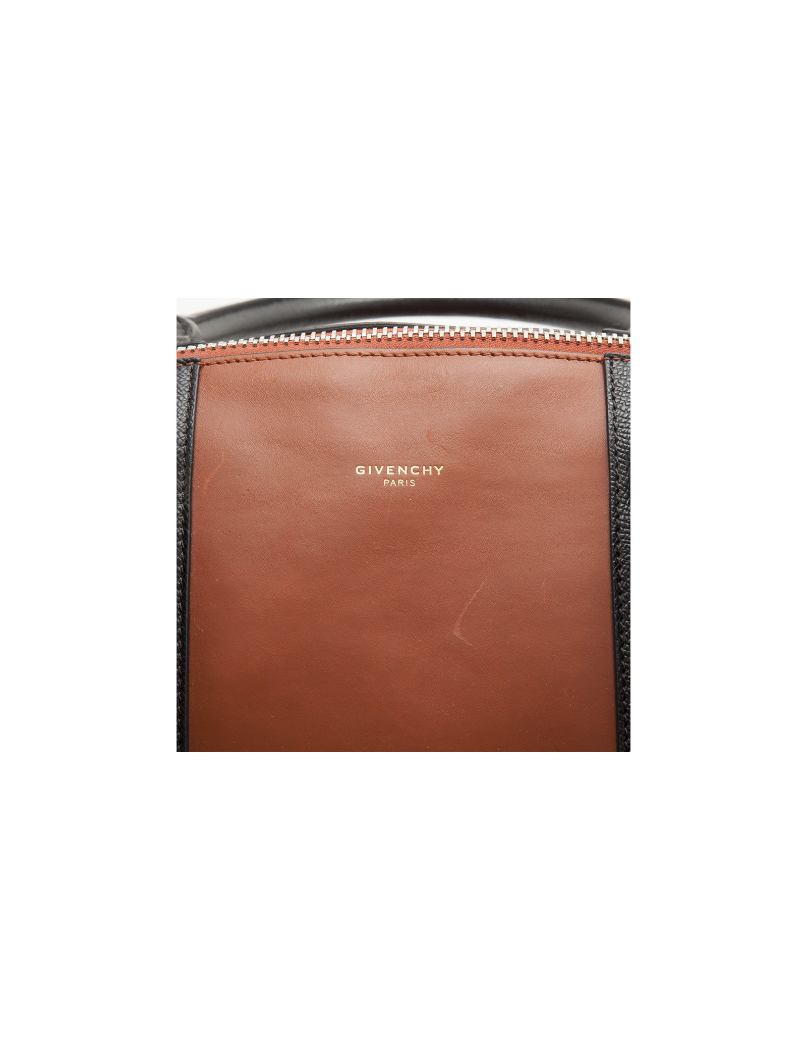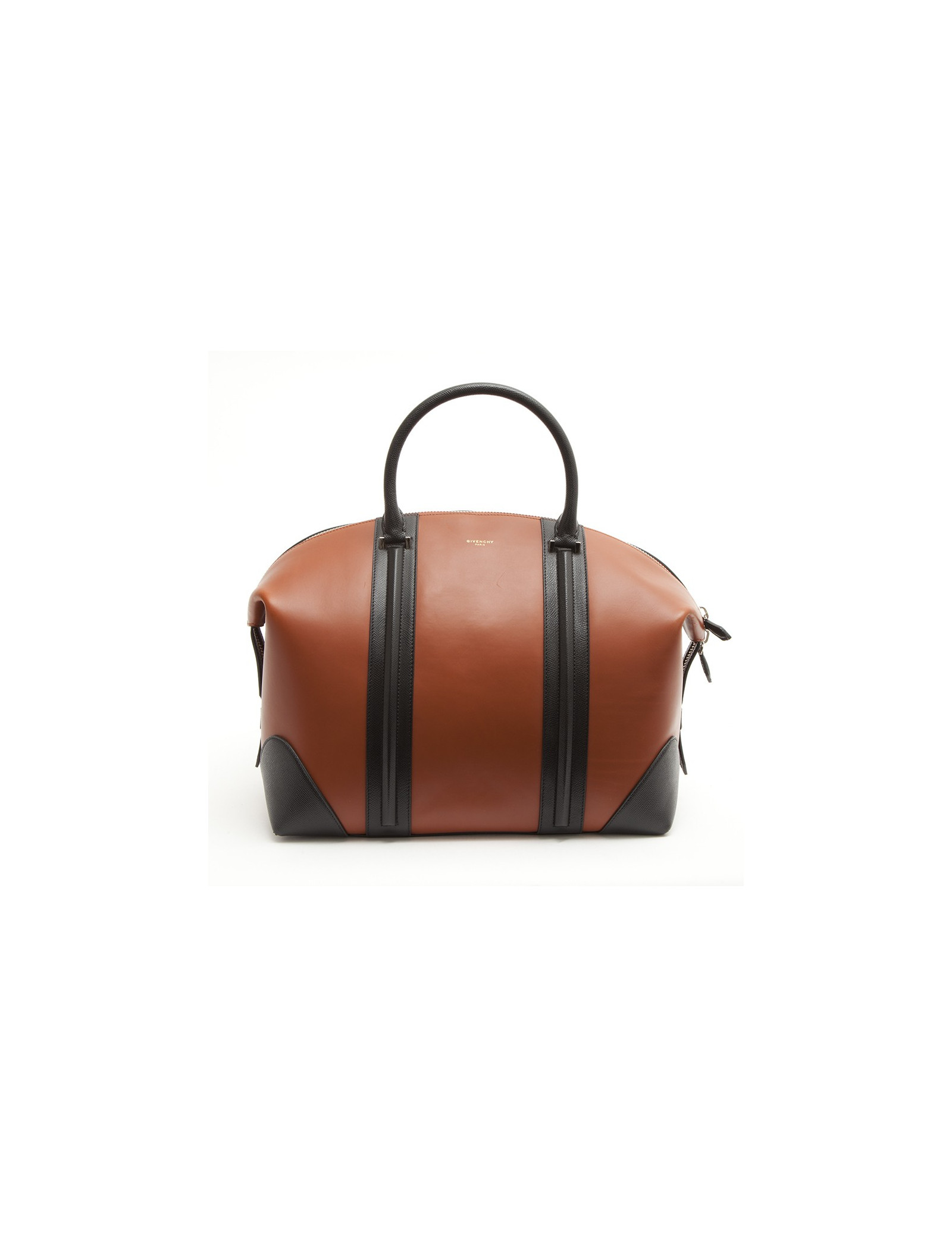 GIVENCHY 24 HOUR bag in box camel leather and black grained leather. Silver metal hardware. It has a double zipper. Worn by hand