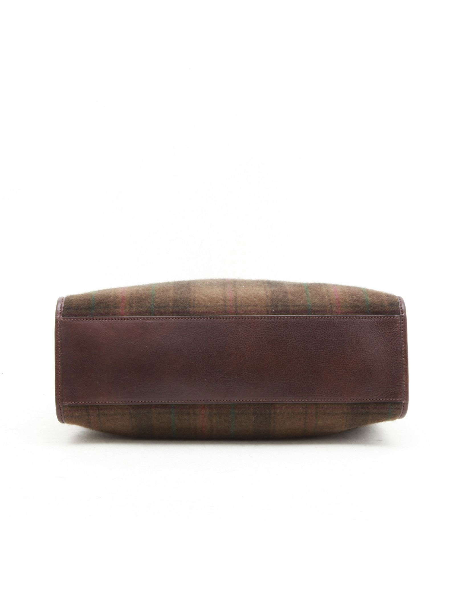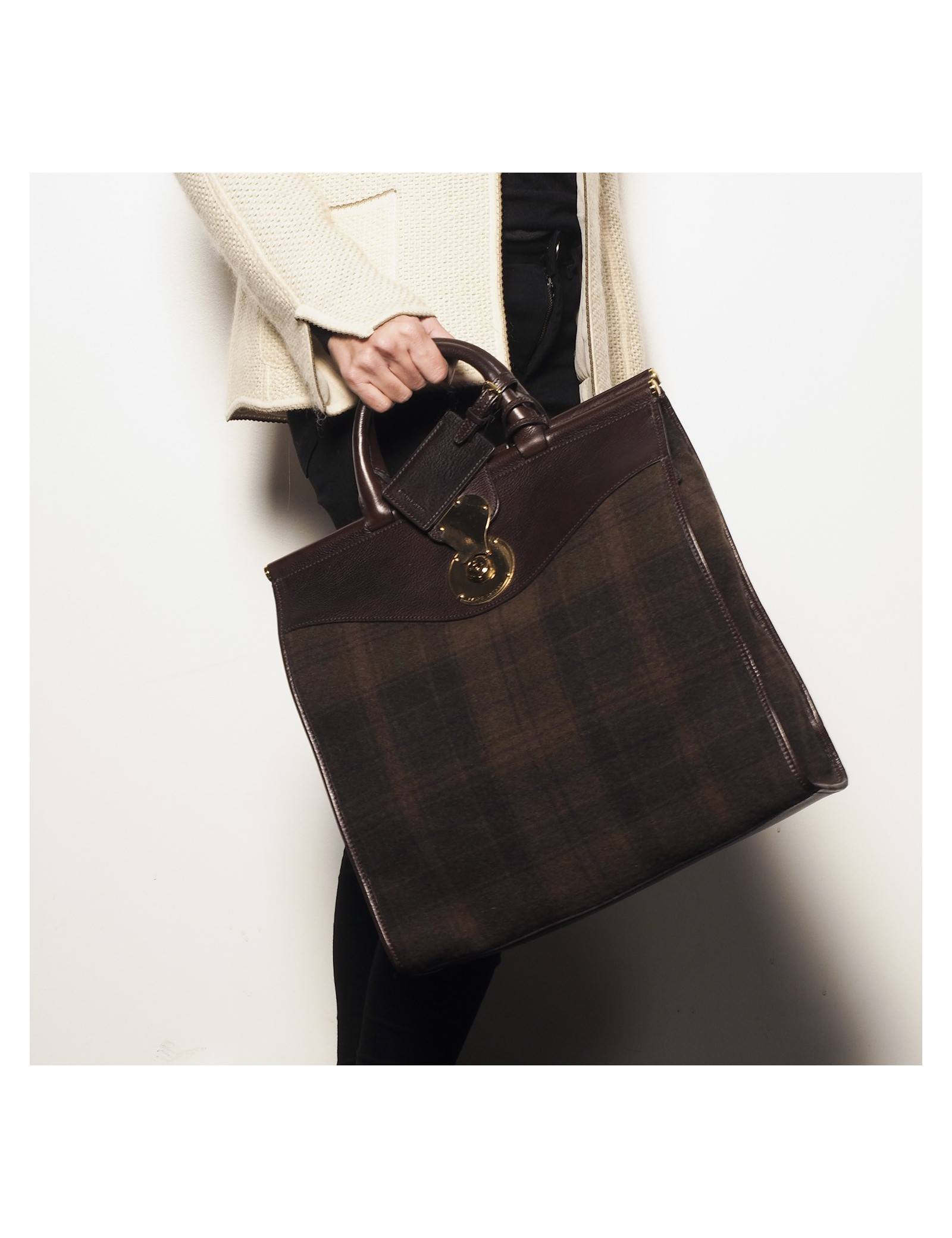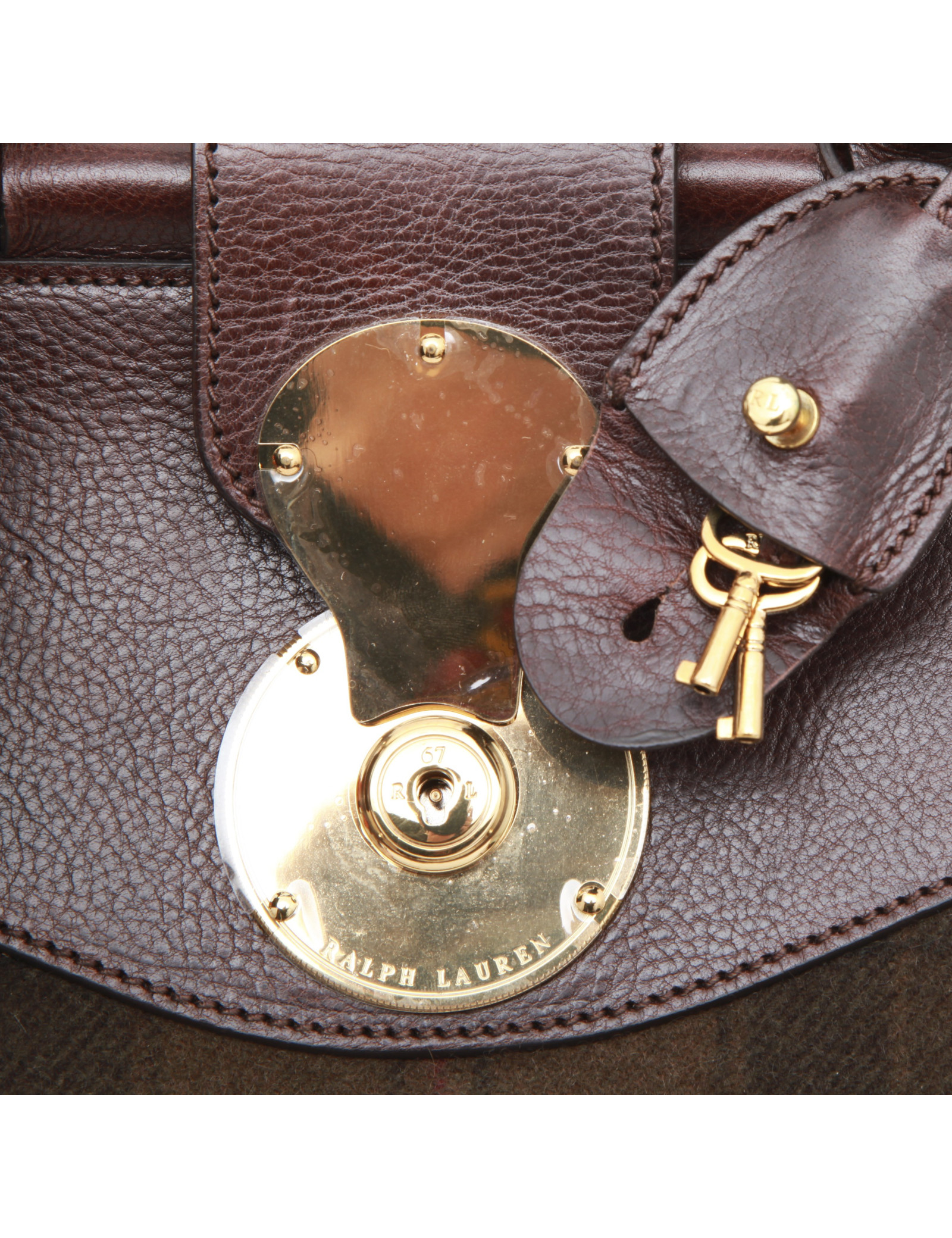 Ralph Lauren bag in wool, English green tartan pattern, brown grained leather. Gold hardware. Made in Italy. Worn by hand or on the shoulder with removable shoulder strap. Keys and address holder. Brand-new condition. Plastics are present on the clasp. It is lined in purple fabric with 4 pockets, one of which is zippered. Authenticity card 313767