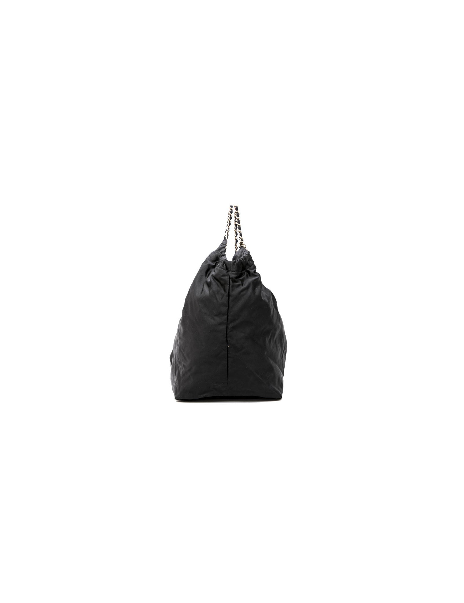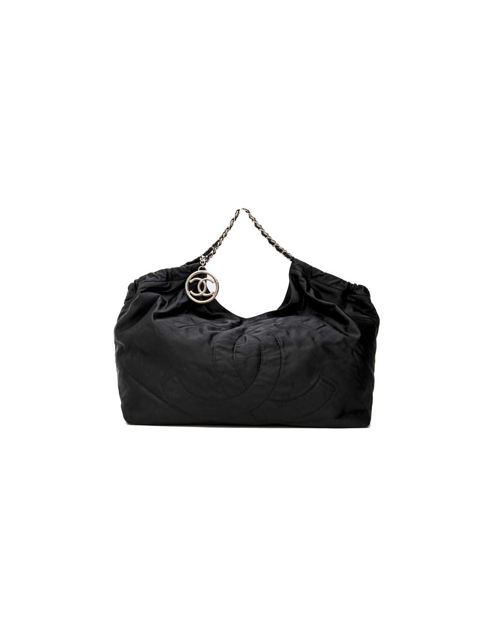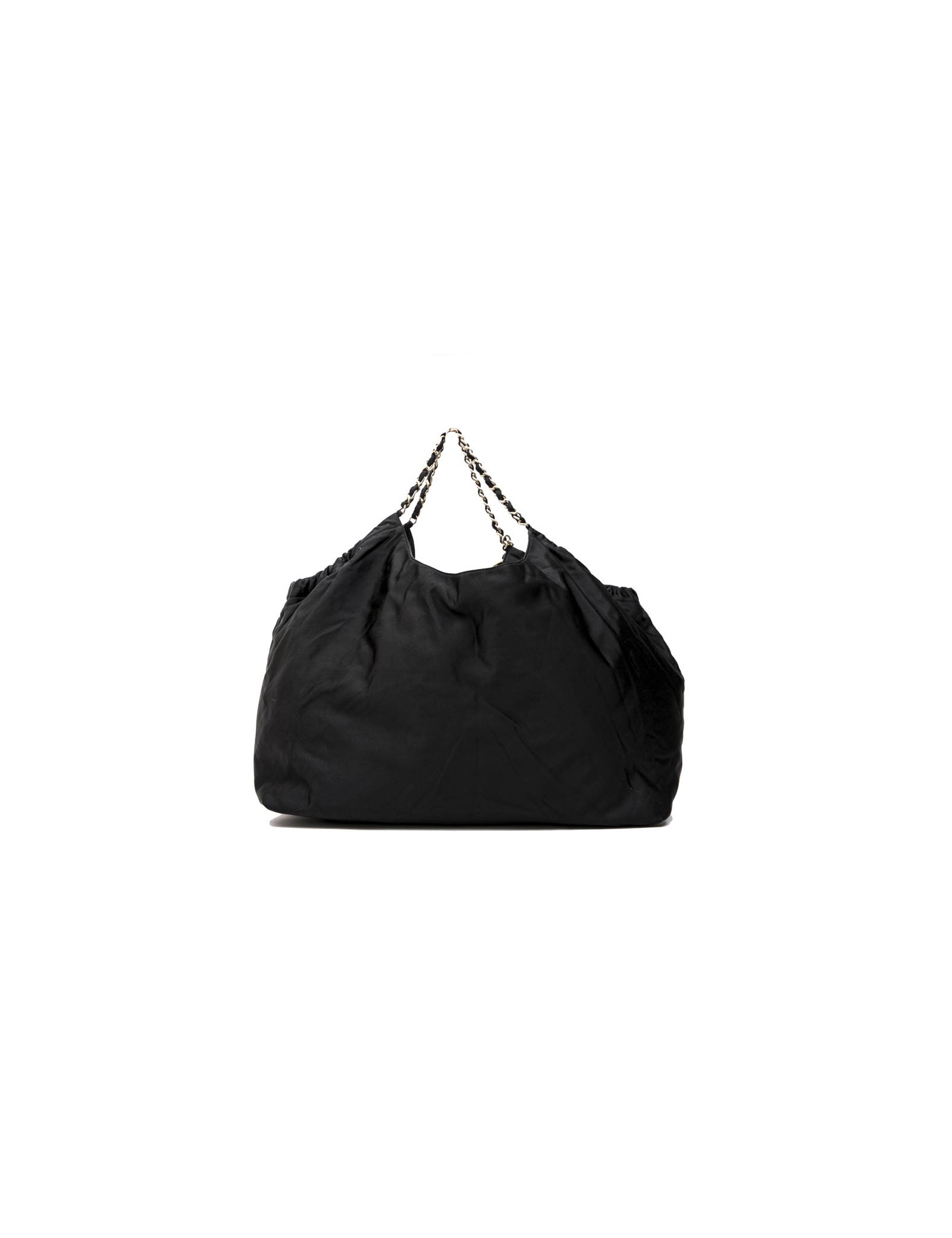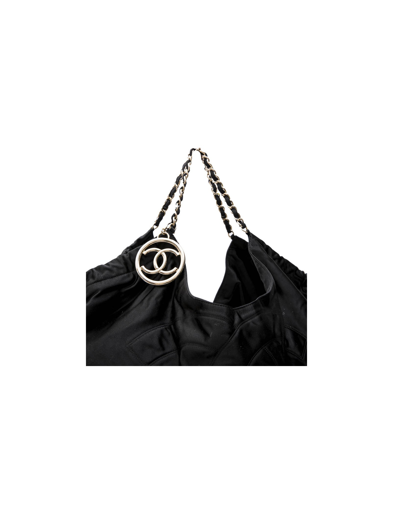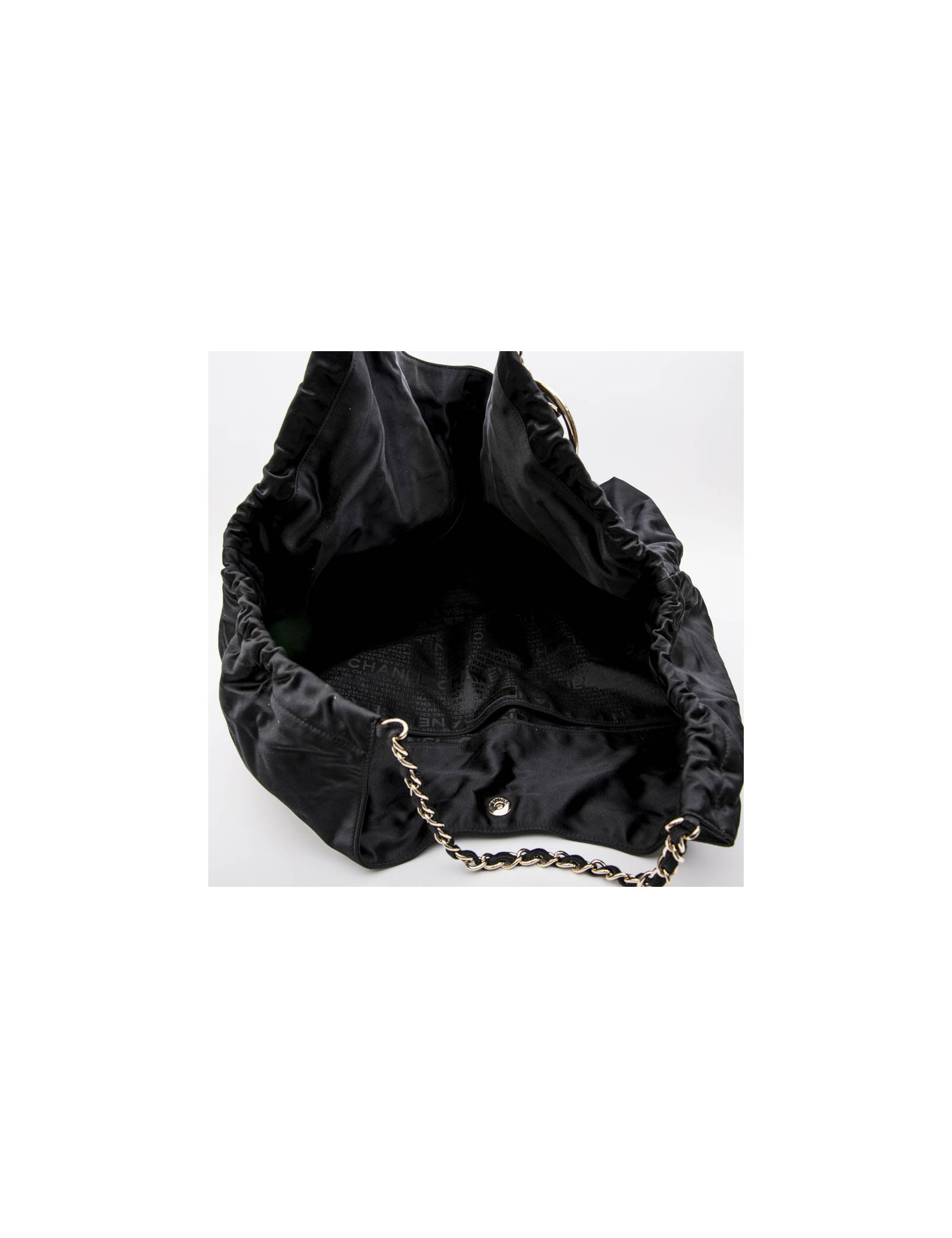 Chanel tote bag in black duchess satin. Gilded metal hardware. Snap closure. The interior is in black monogram canvas.