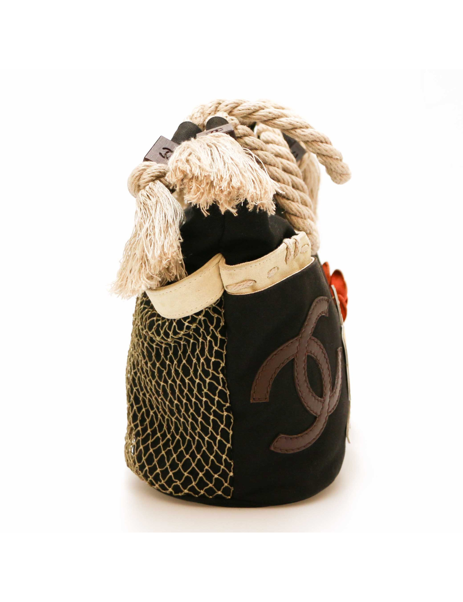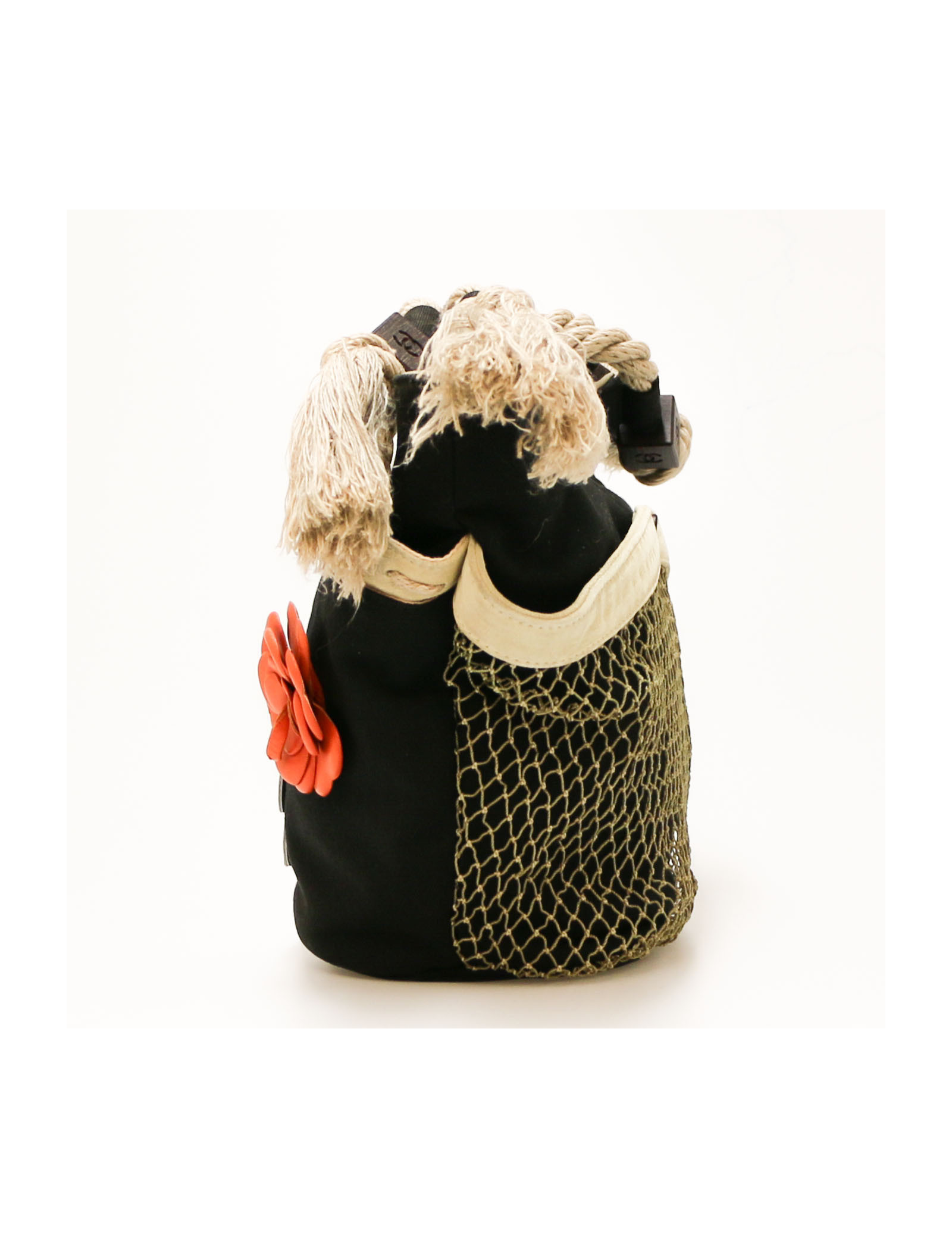 Details : has been cleaned at Germaine Lesèche's. Cotton canvas basket with leather details (tracings) and mesh. Patch pockets on each side, one zipped pocket inside. Magnetic button closure.