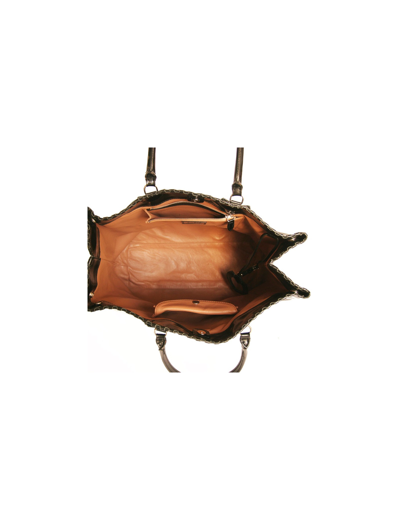Worn by hand or arm with two handles that each measure 46 cm. The interior is in leather with three pockets: one zipper, one that closes with a pressure and a flat pocket.