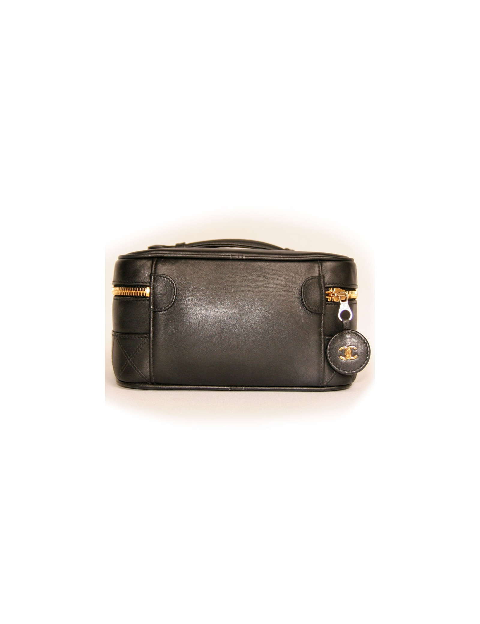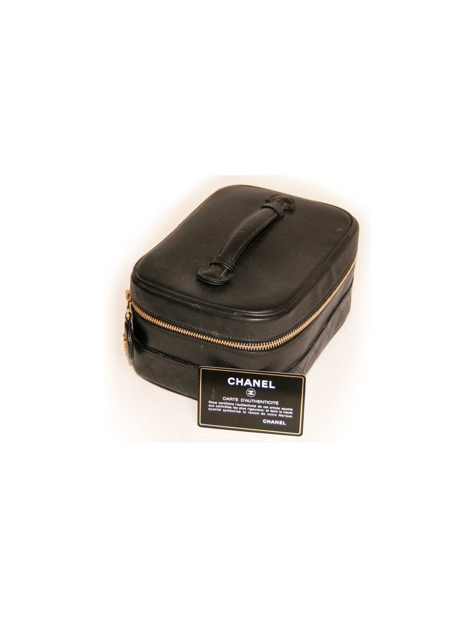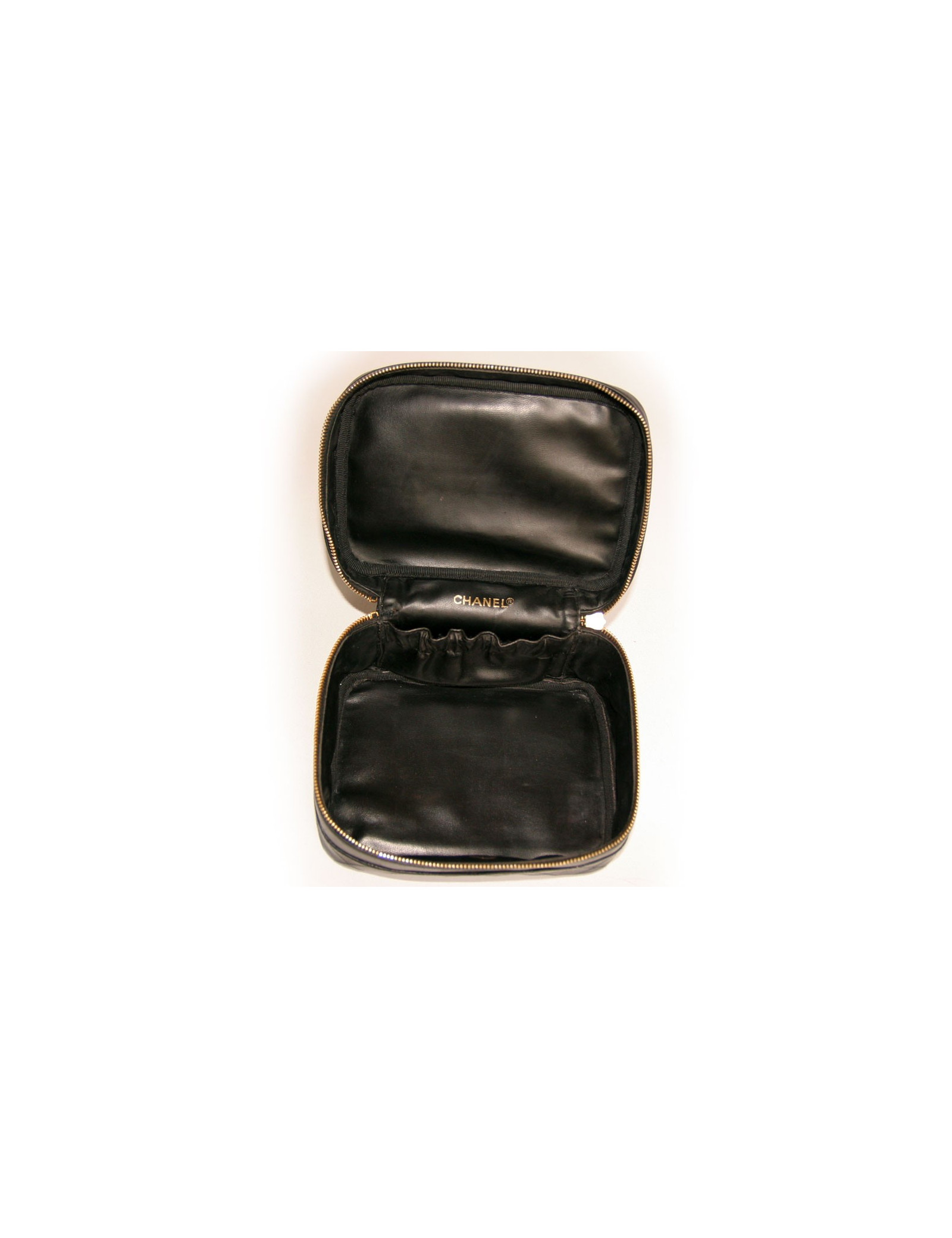Vanity case in black leather Chanel. Ideal to put all your cosmetics or it can also be used for your jewelry. The jewelry are gold metal.