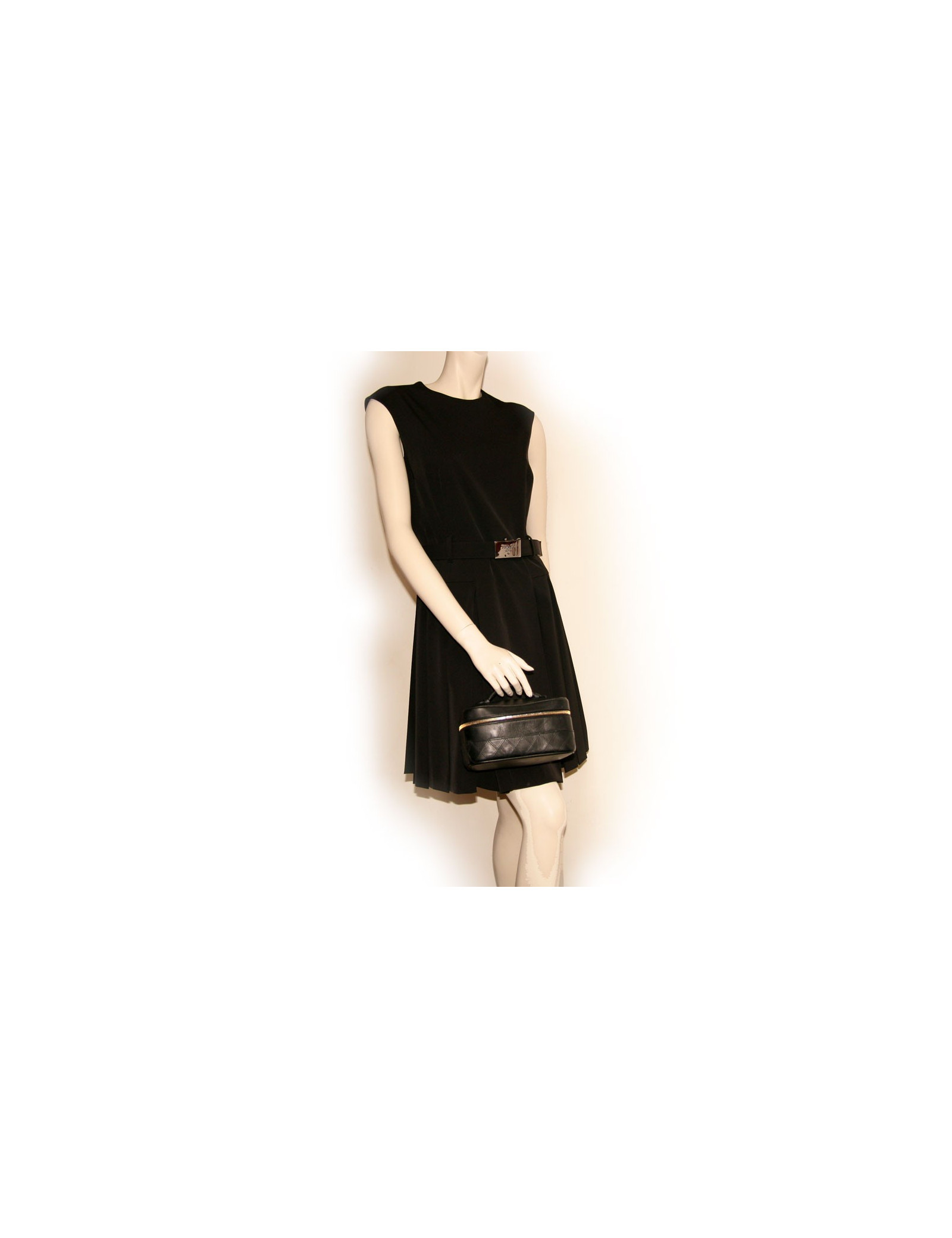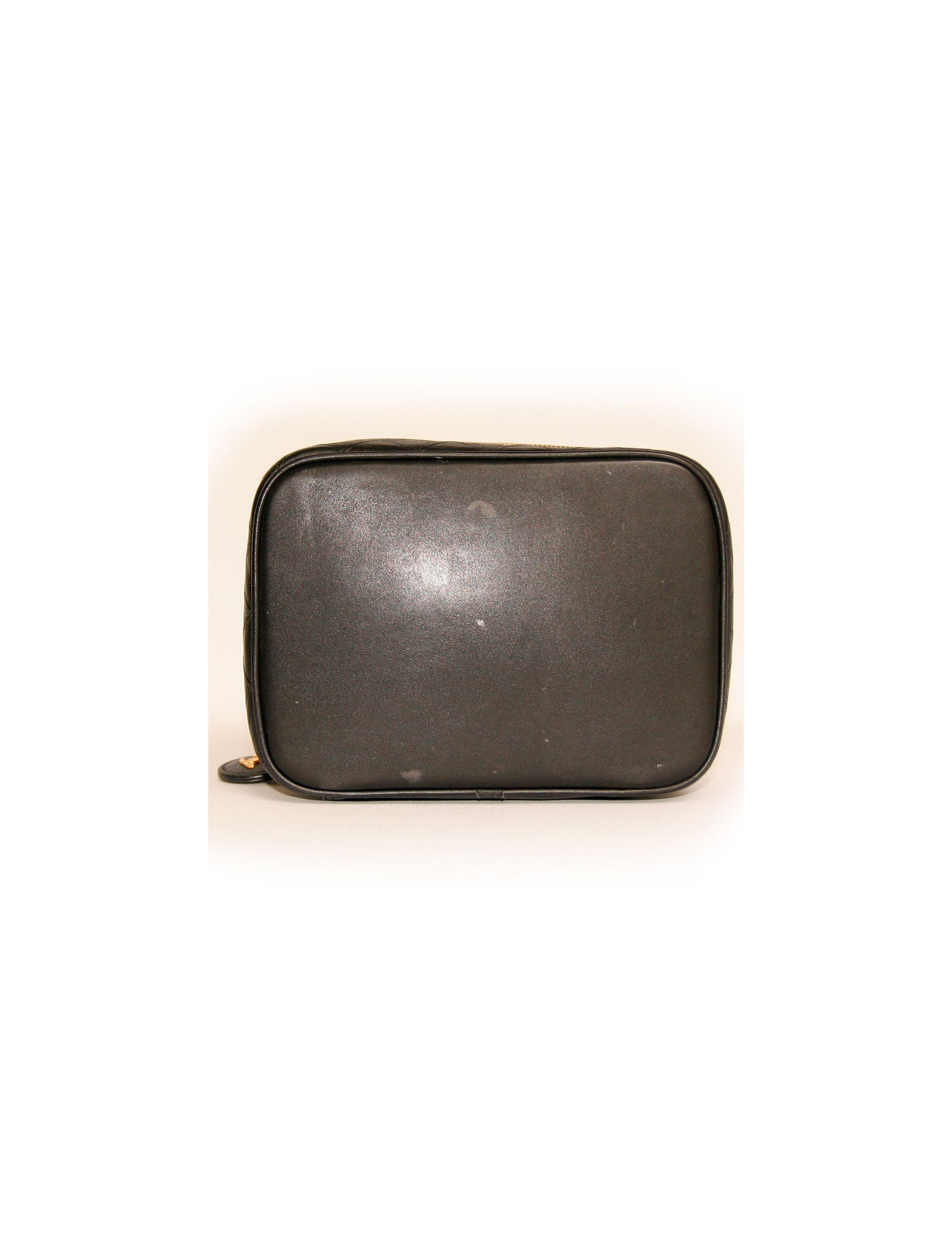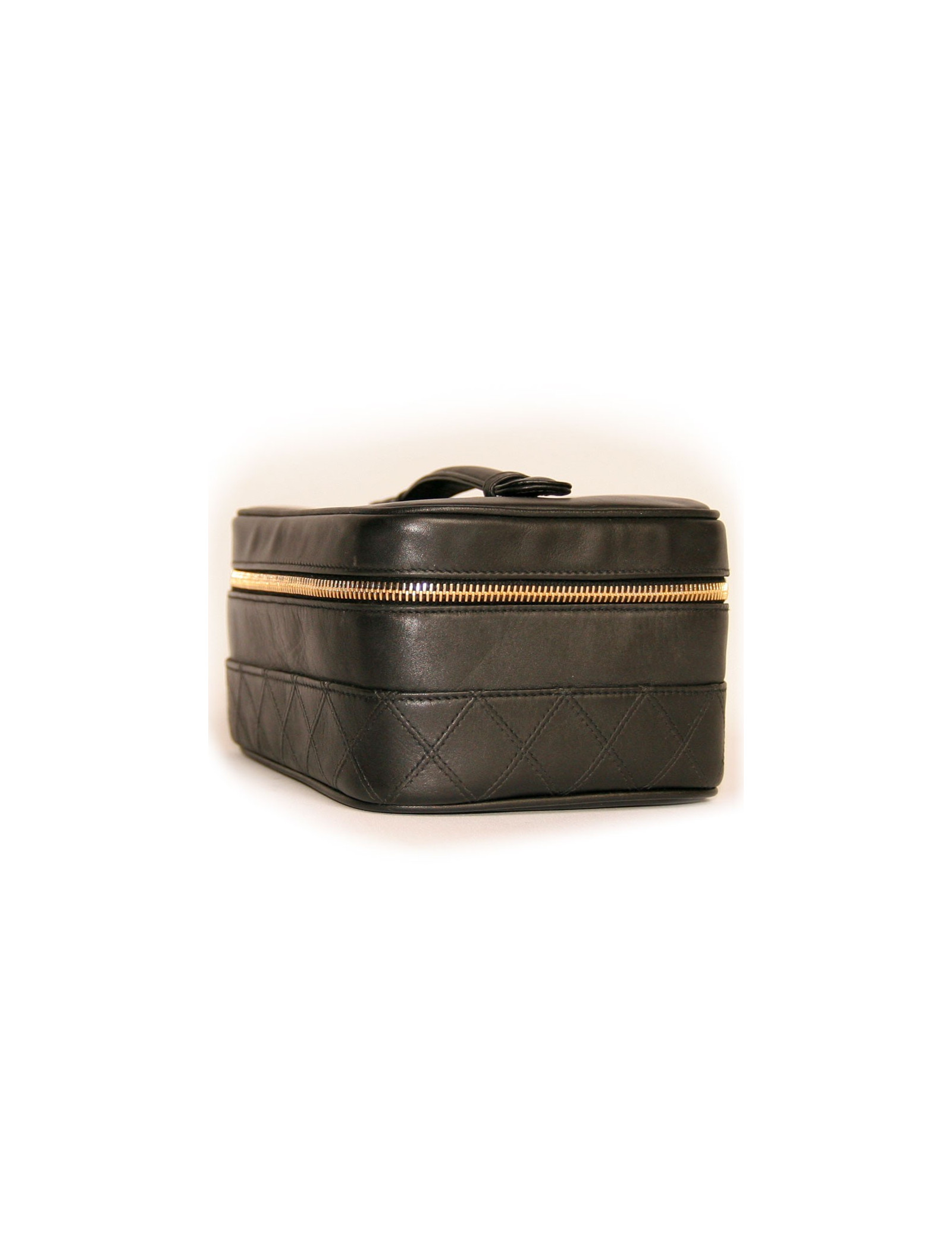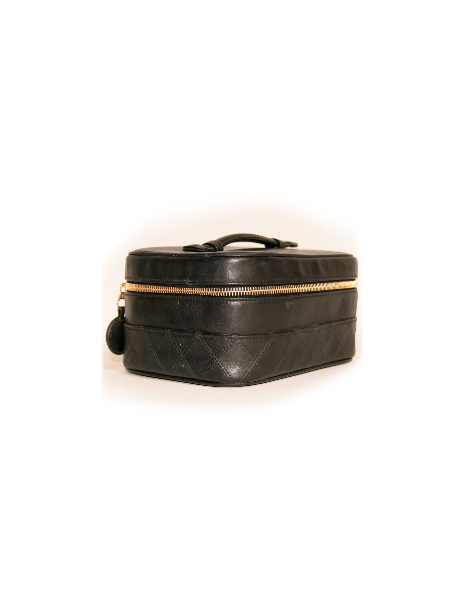 Vanity case in black leather Chanel. Ideal to put all your cosmetics or it can also be used for your jewelry. The jewelry are gold metal.