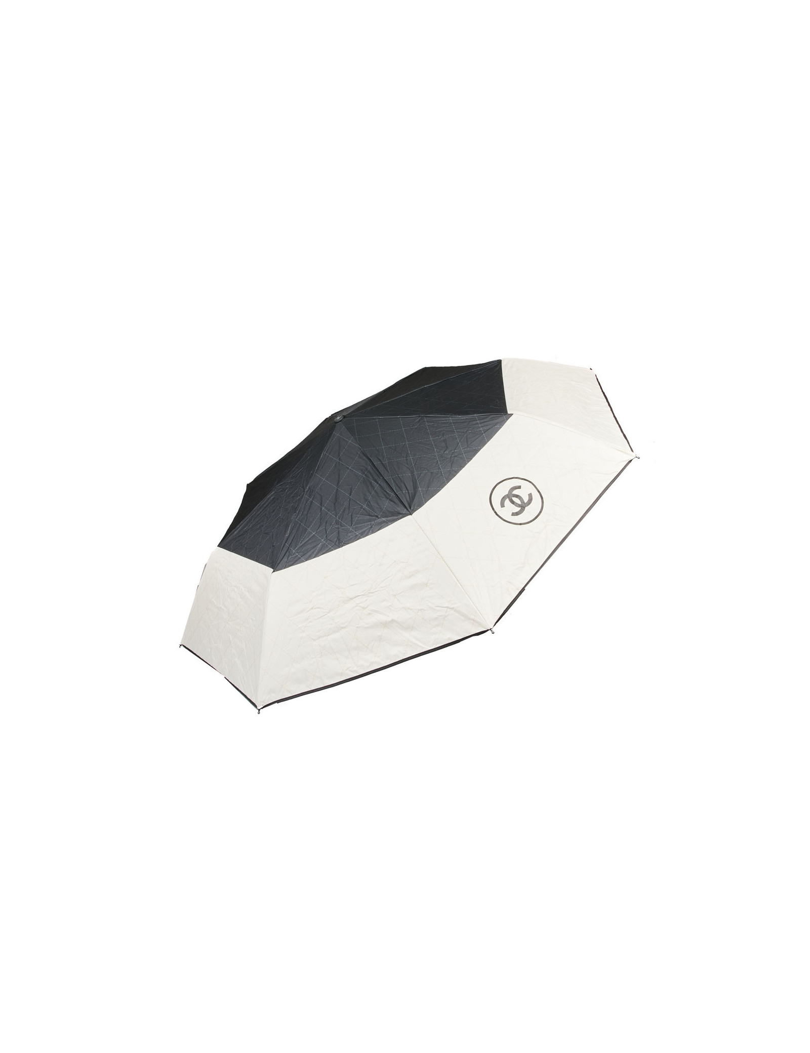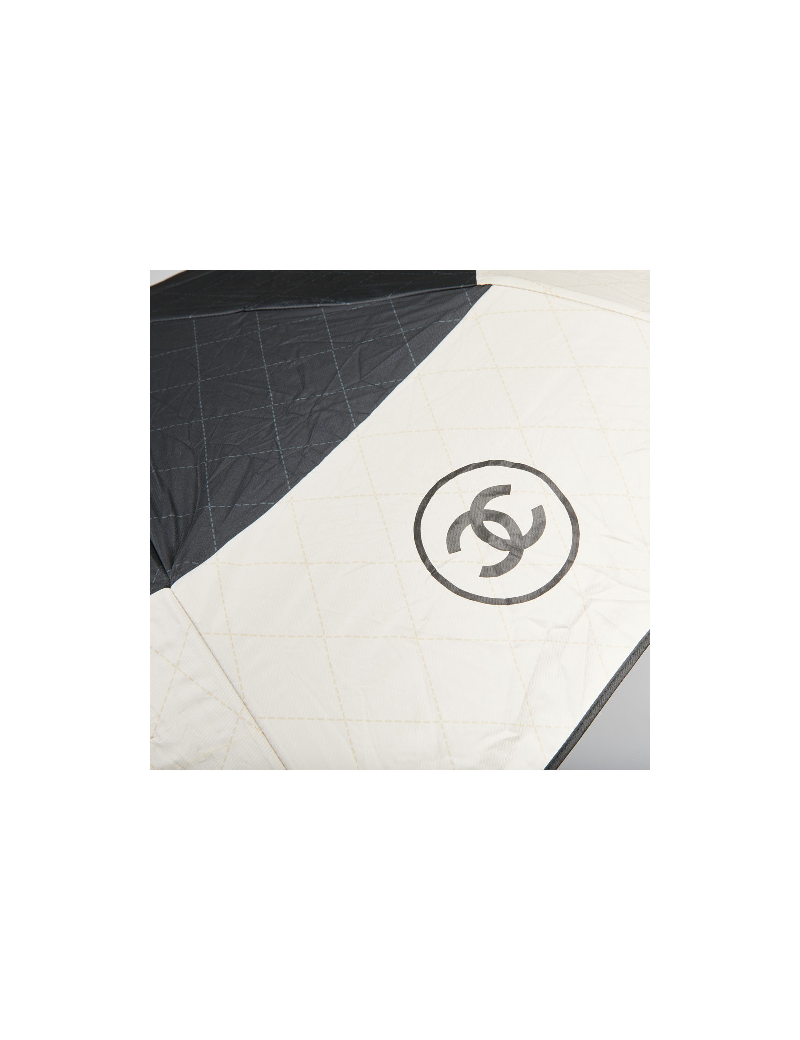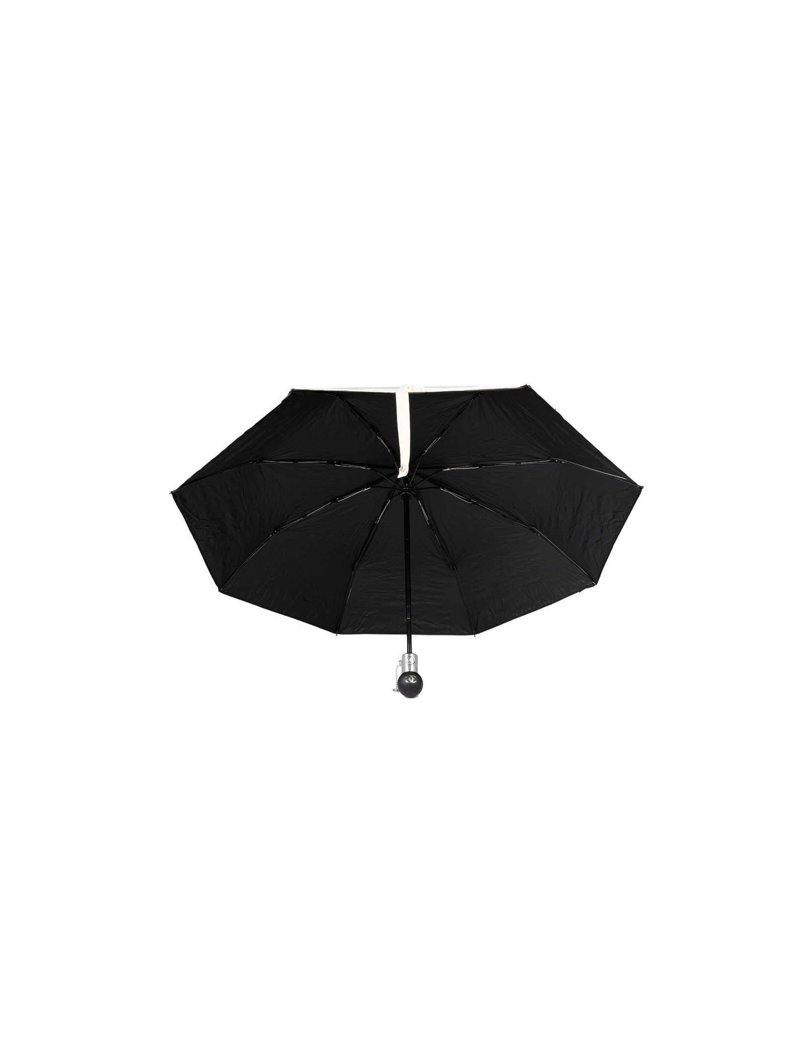 Last items in stock UMBRELLAS CHANEL large black umbrella CHANEL 34173 690.00 € CHANEL large black CC monogram umbrella Condition : very goodMaterial : polyesterColors : black, white Measurements : total length 102 cm, diameter 116 cm Details : Chanel signature and white CC monogram. Slight wear marks on the tip of the umbrella. Add to cart