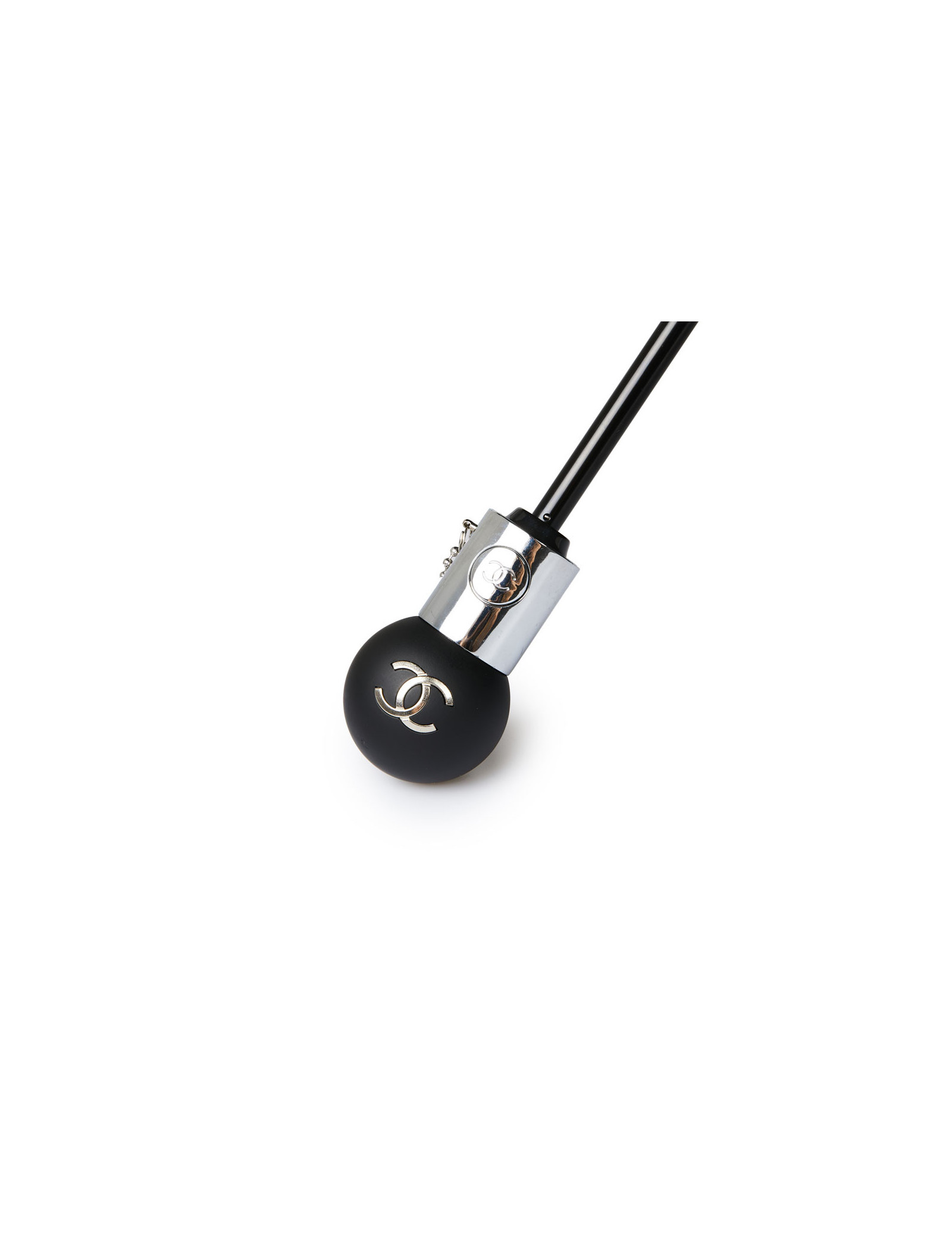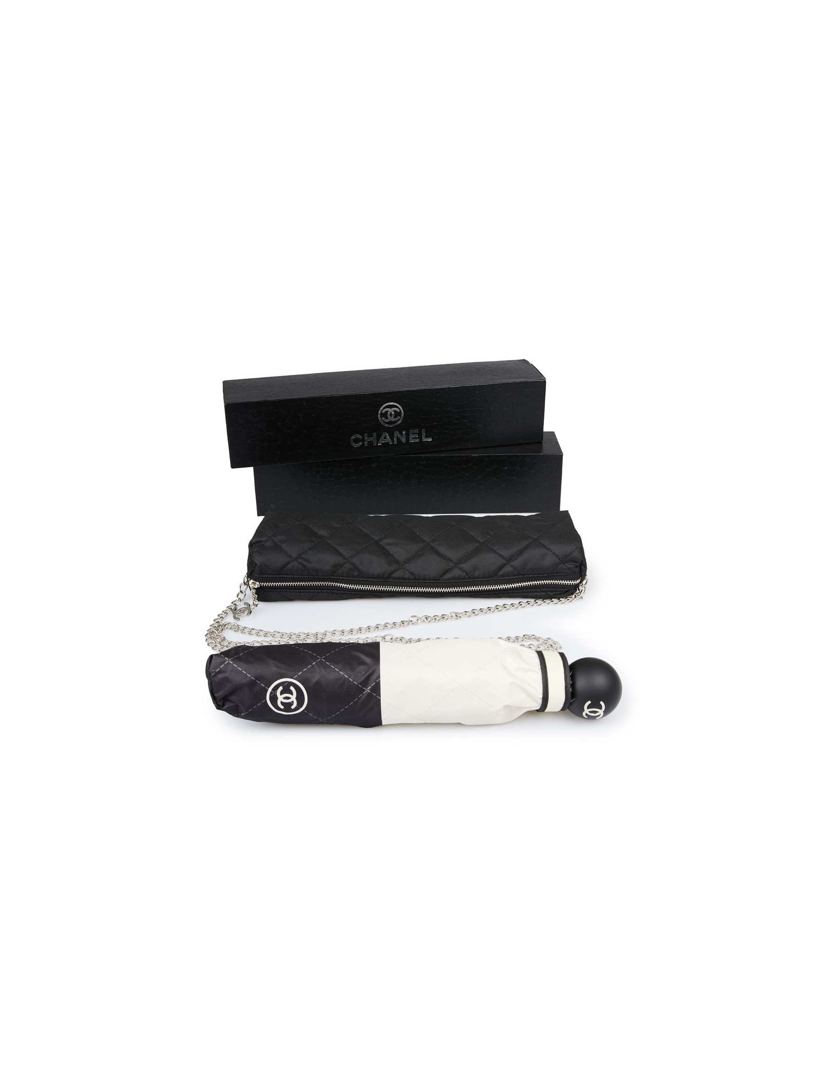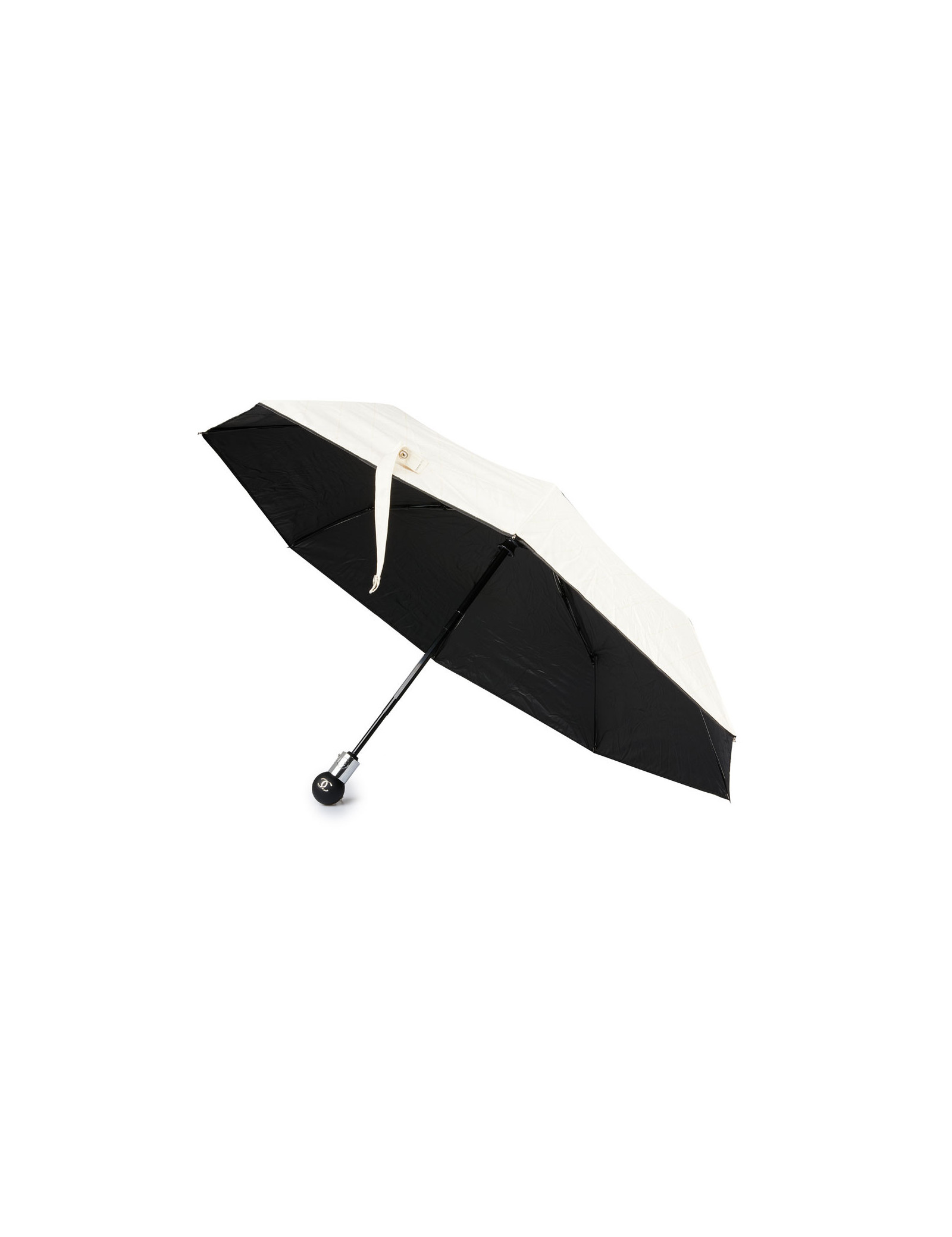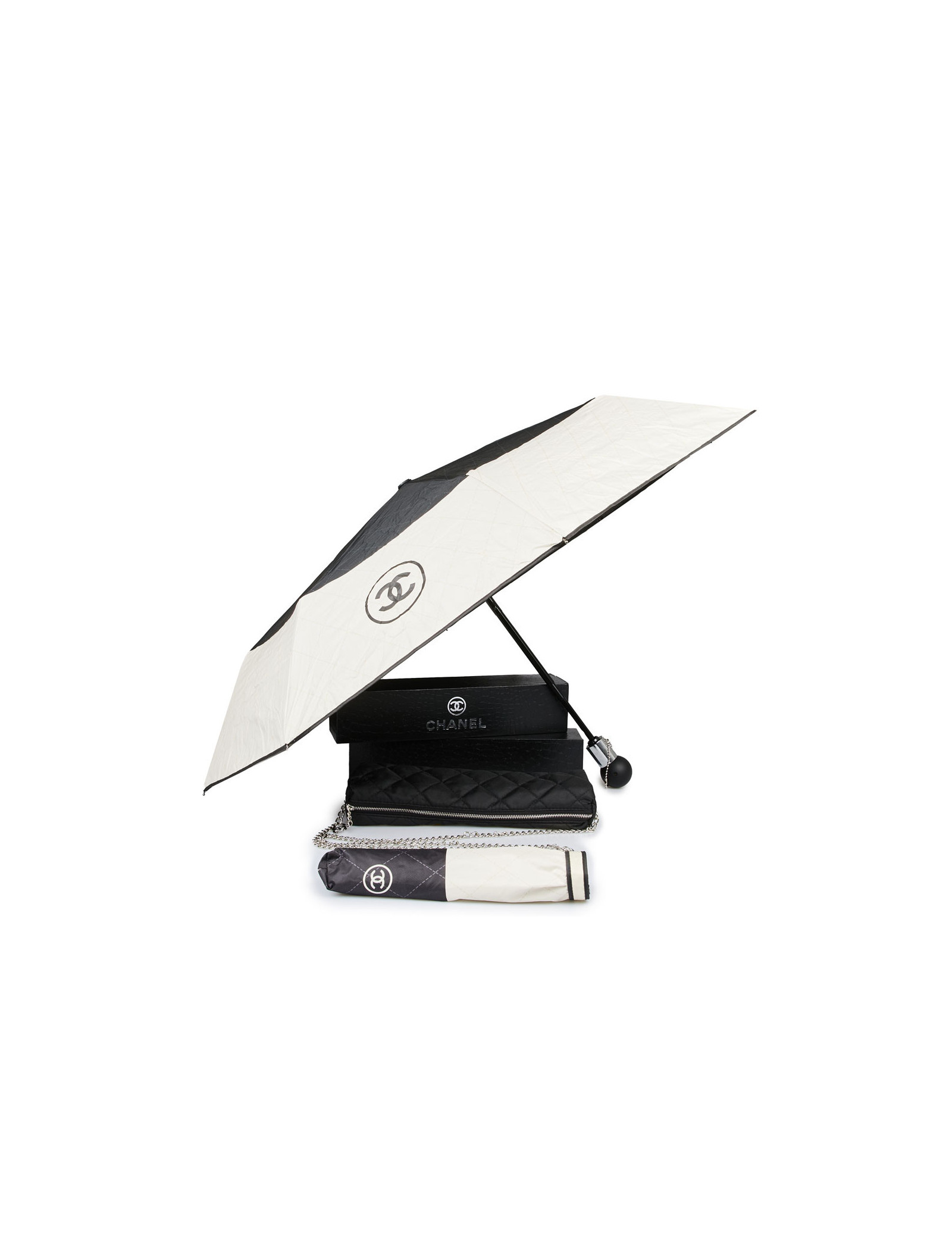 Last items in stock UMBRELLAS CHANEL large black umbrella CHANEL 34173 690.00 € CHANEL large black CC monogram umbrella Condition : very goodMaterial : polyesterColors : black, white Measurements : total length 102 cm, diameter 116 cm Details : Chanel signature and white CC monogram. Slight wear marks on the tip of the umbrella. Add to cart