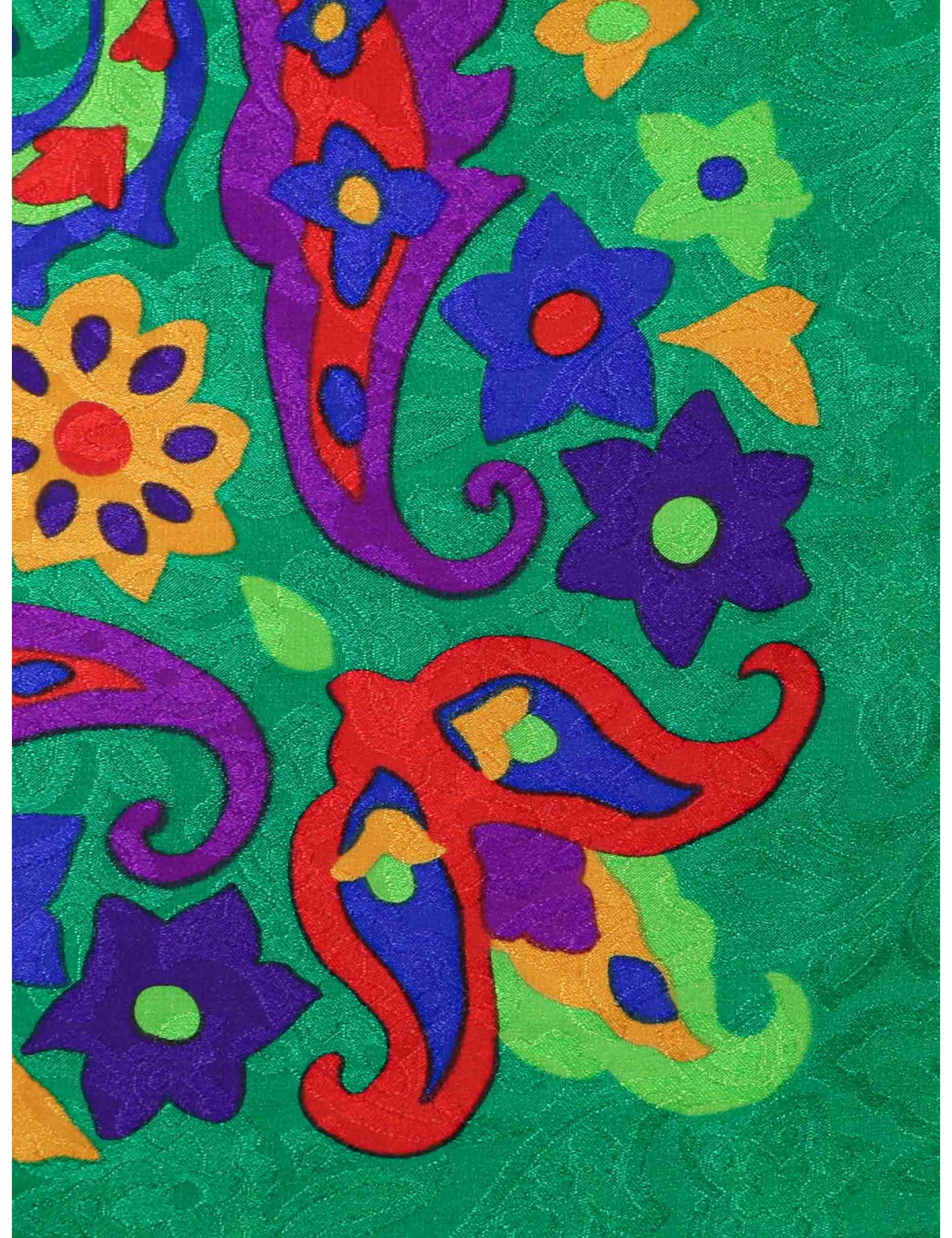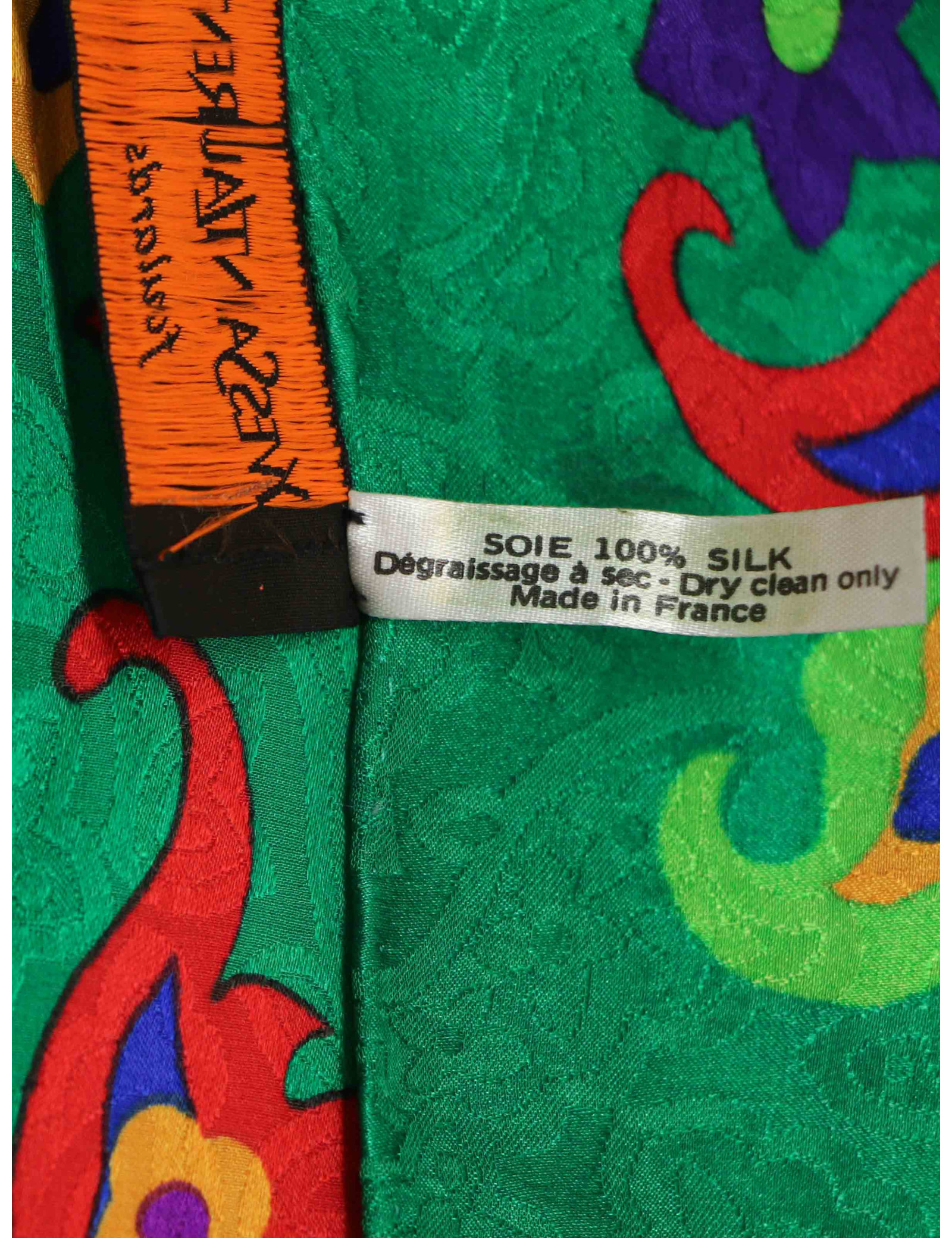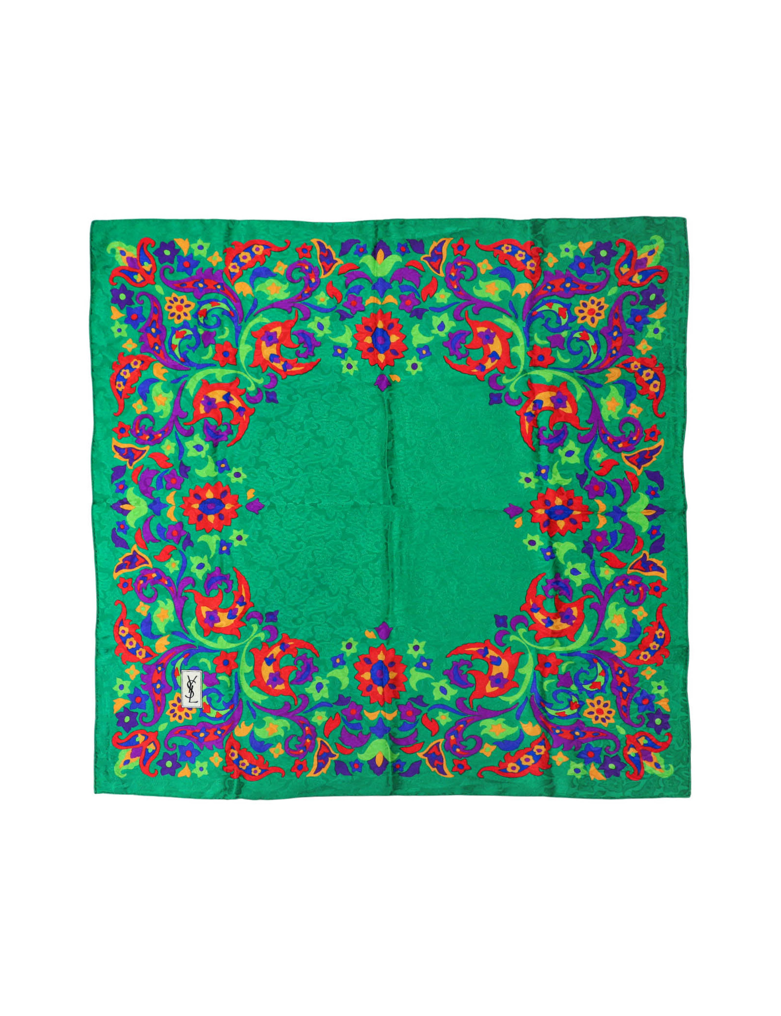 Détails : carré Yves Saint Laurent motif aux couleurs vives sur fond vert. Le roulotté est en très bon état, étiquette de composition toujours présente.
