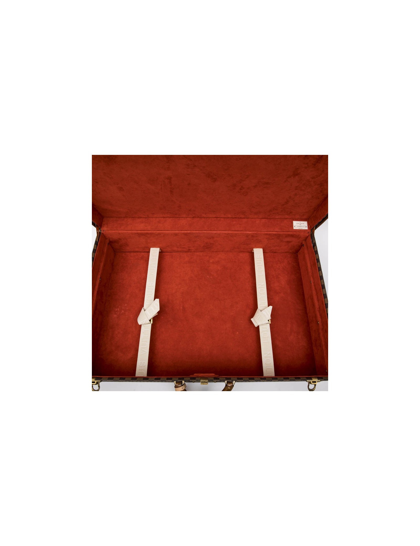Valise Louis Vuitton, en toile monogram avec doublure en fibre microfibre rouge. Les poignées sont arrondies en cuir de vachette naturel. Numéro de série 1044013.