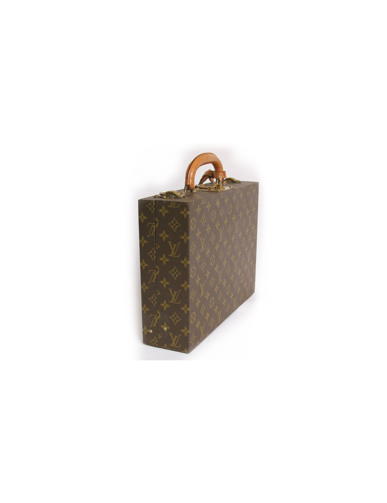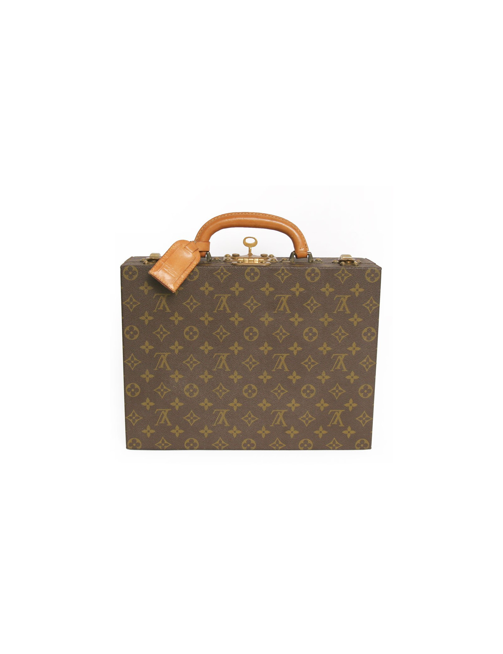 L'intérieur est en cuir et velours marron. Les pièces métalliques sont en laiton doré. Serrure S avec clé, renforcée de deux loquets complémentaires. Confortable poignée en cuir. Porte-adresse amovible en cuir.