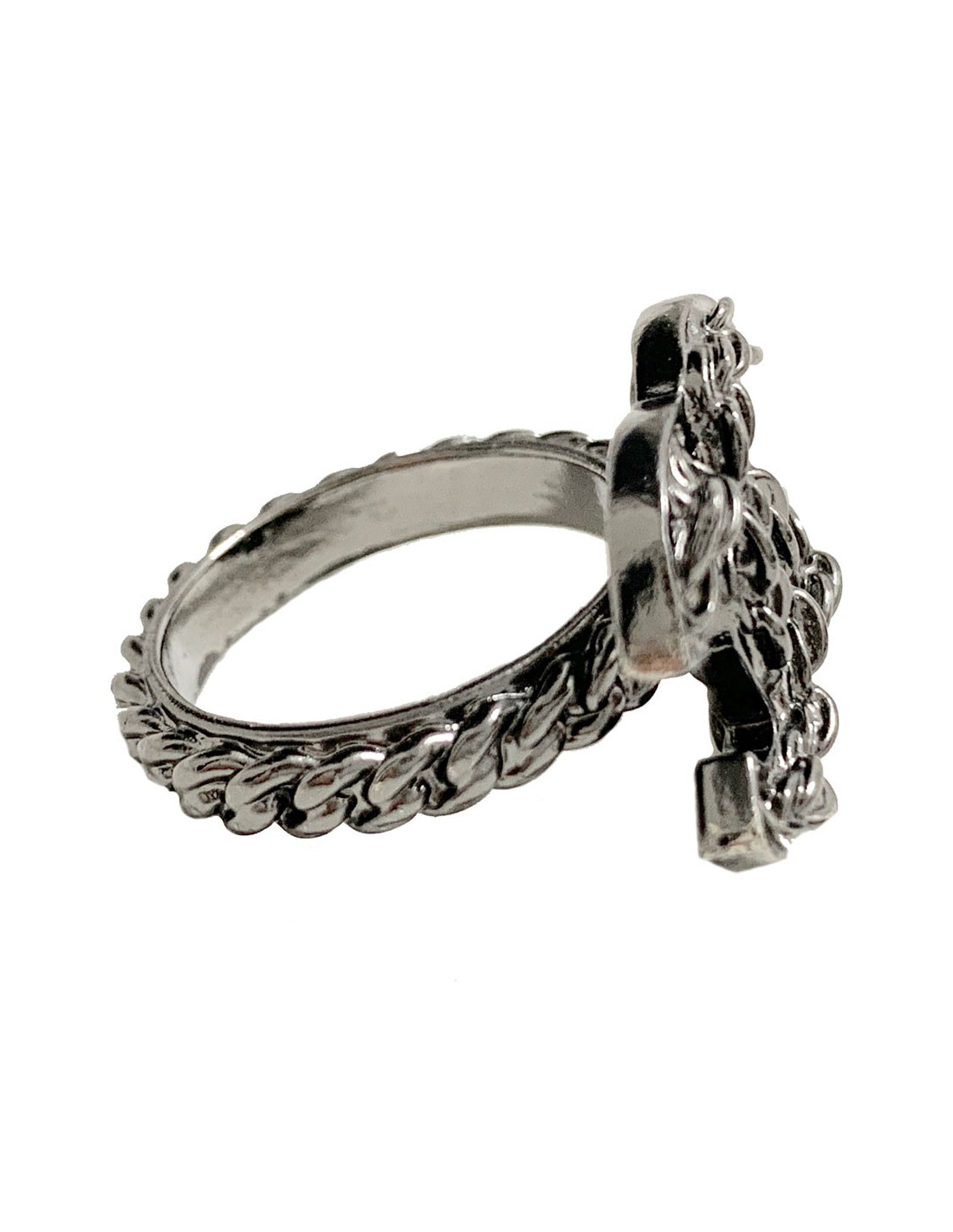 Un intemporel de la Maison CHANEL! Craquez pour cette bague CC. Une fantaisie chic en métal ruthénium (couleur argent vieilli). Le motif chaine est présent sur tout le tour de l'anneau ainsi que sur le CC.