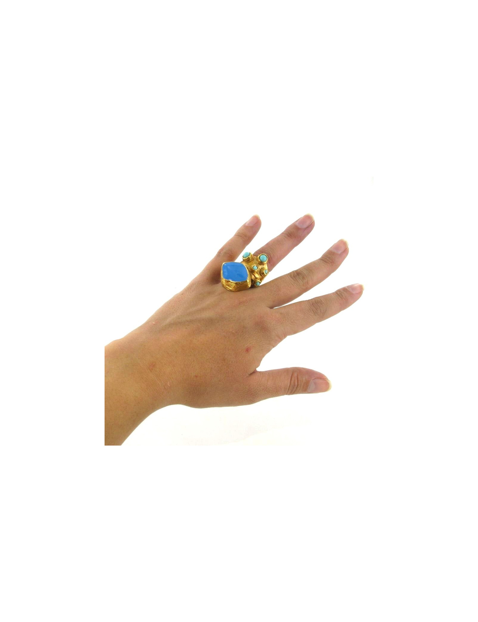Bague YVES SAINT LAURENT Arty en métal doré et pierres semi-précieuses turquoises. Très tendance cette bague peut être portée en vue d'agrémenter une tenue décontractée, comme une robe de soirée.