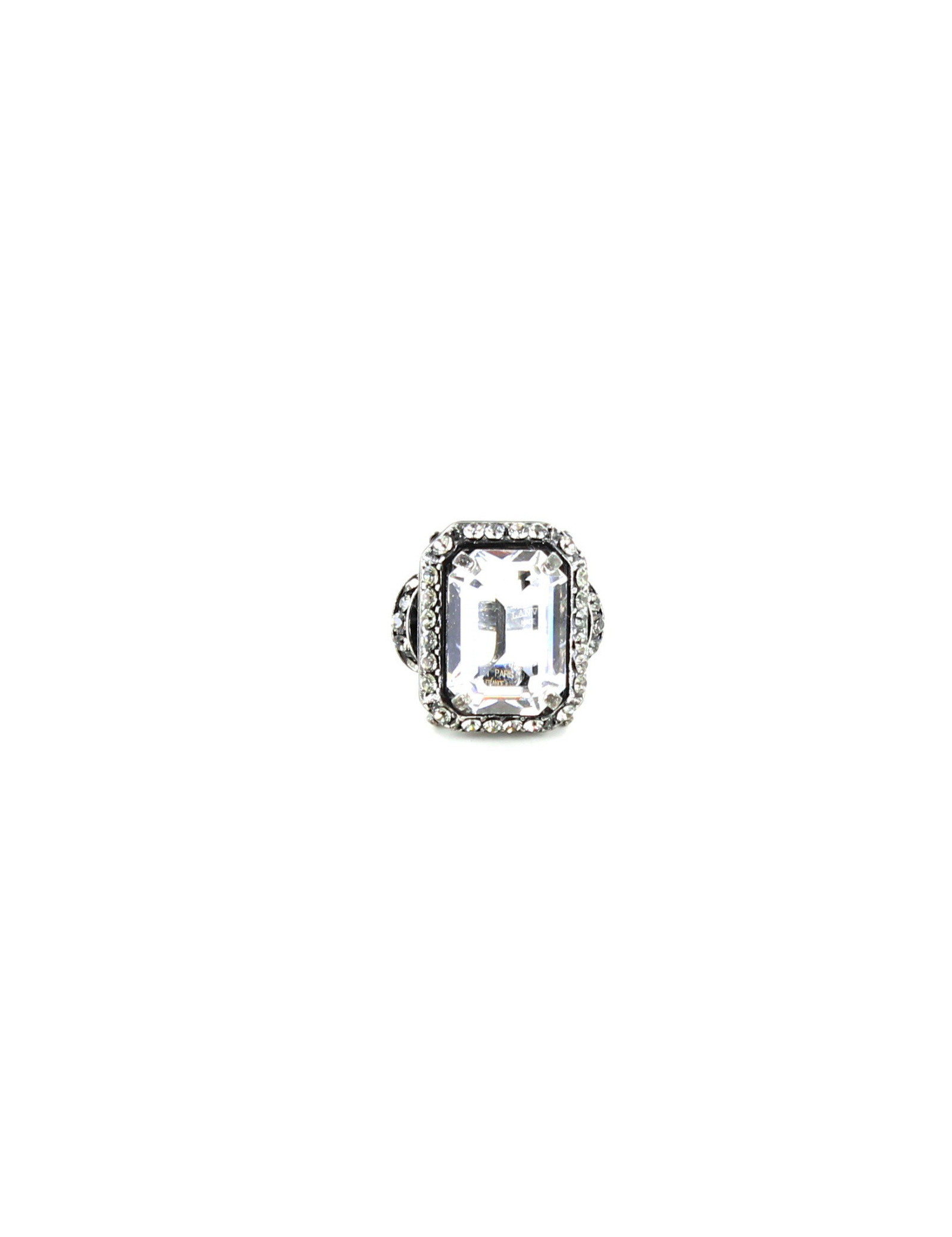 Spectaculaire bague fantaisie LANVIN, signée Alber Elbaz. surmontée d' un gros cabochon en brillant taille émeraude, sertie de petits brillants. elle est métal argent vieilli.
