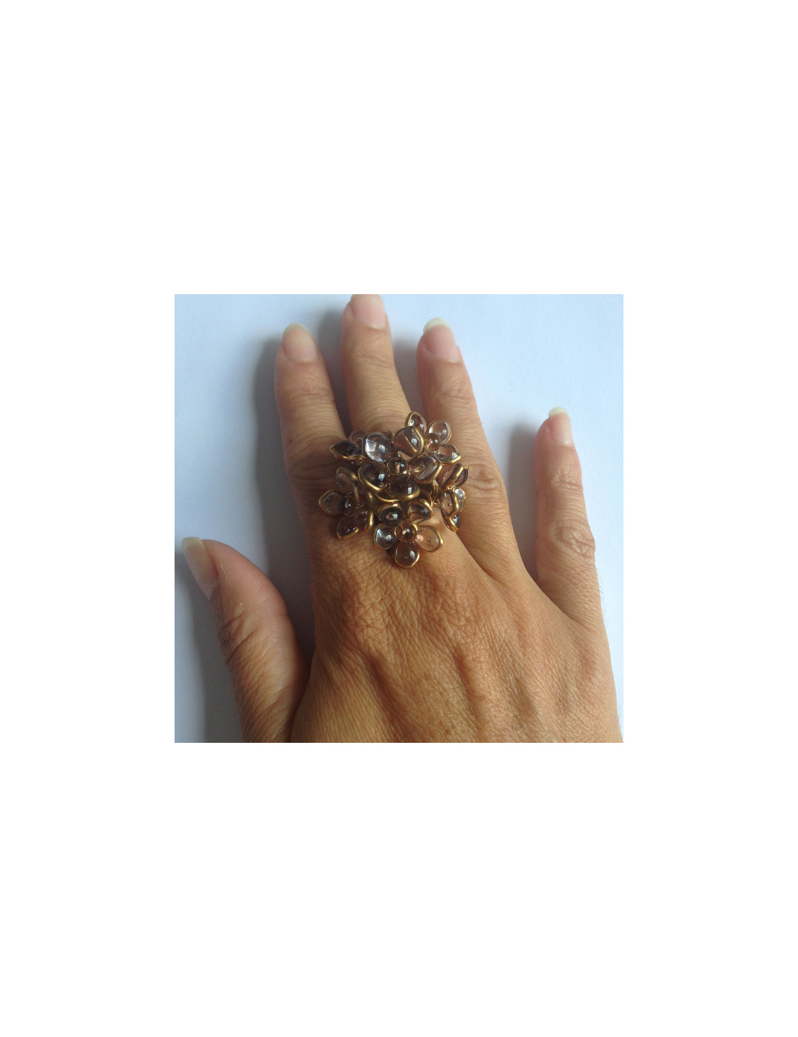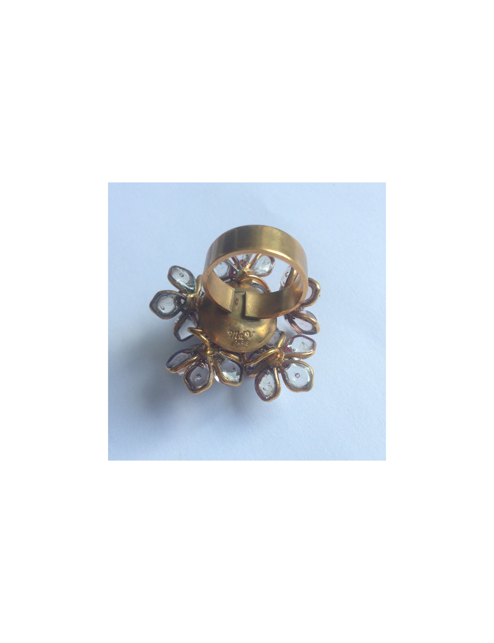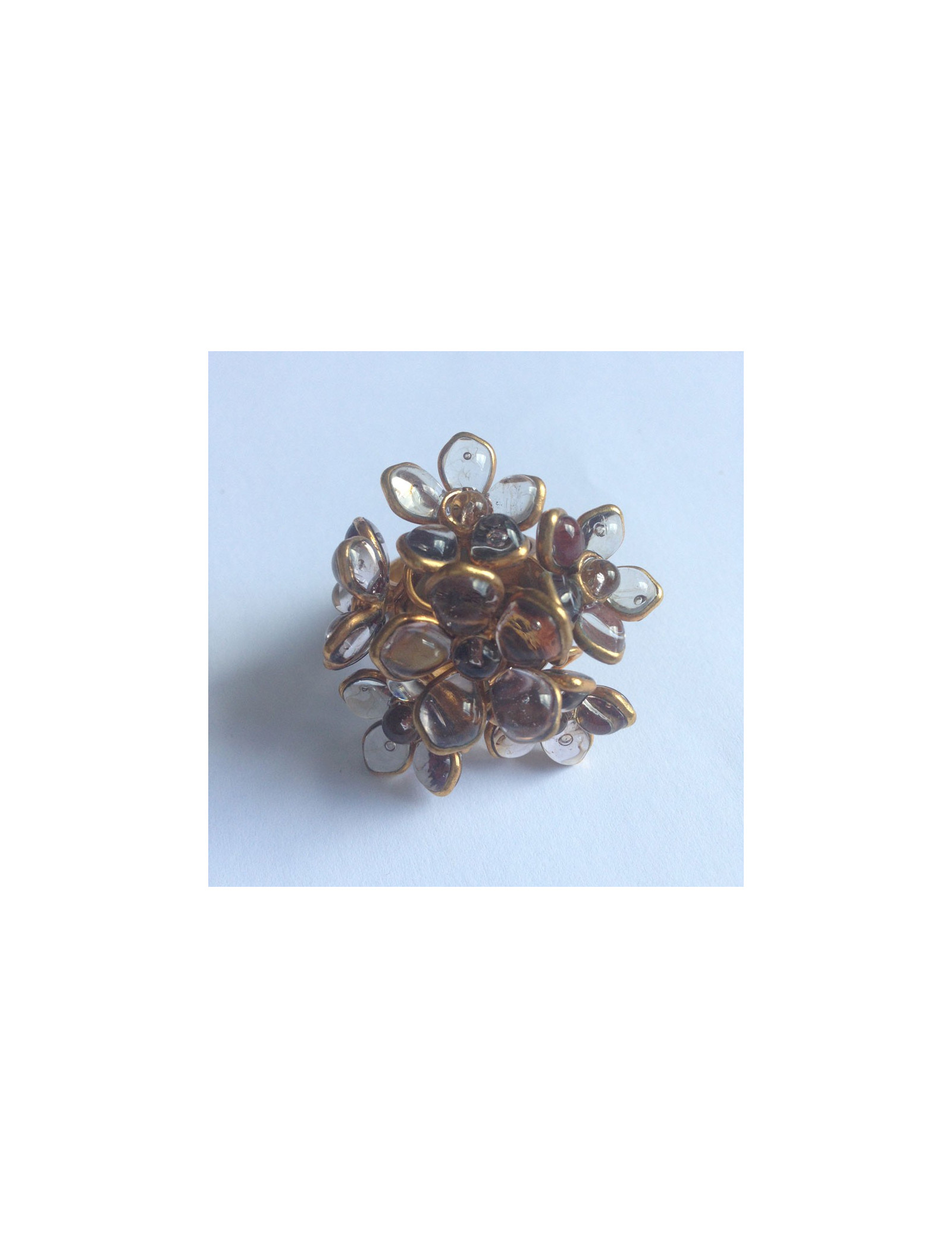 Bague Fleurettes en pâte de verre translucide Marguerite de Valois, monté sur métal doré vieilli.