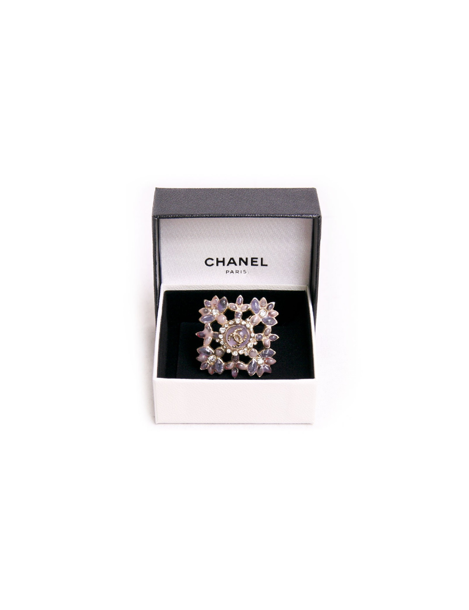 Belle bague t 54 ajustable dorée or pâle, de la Maison Chanel, en pâte de verre améthyste, rose pâle et strass, forme carrée, surmontée d'un double "C". Elle est en très bon état. Les mesures : 3 cm x 3 cm -Jamais portéé.