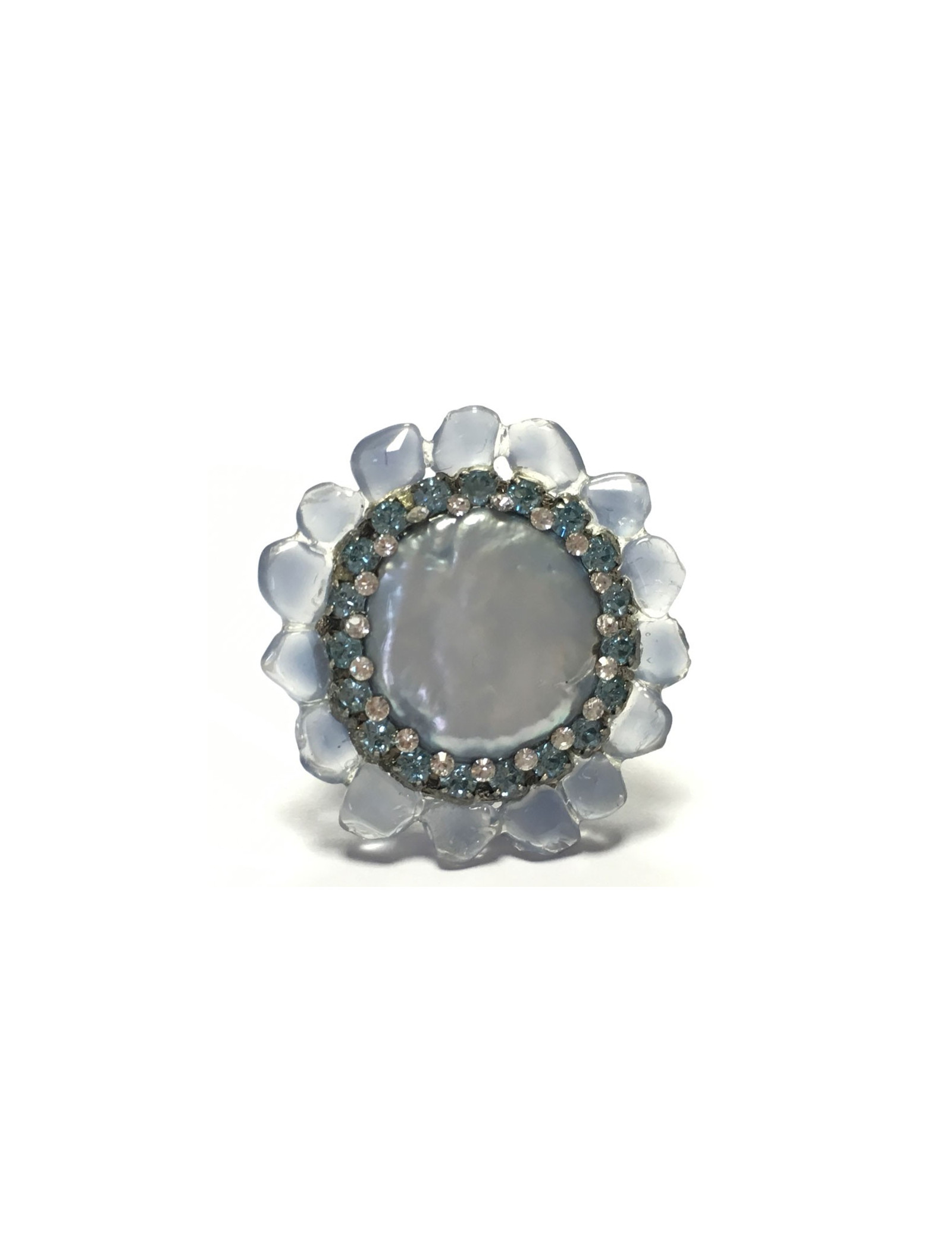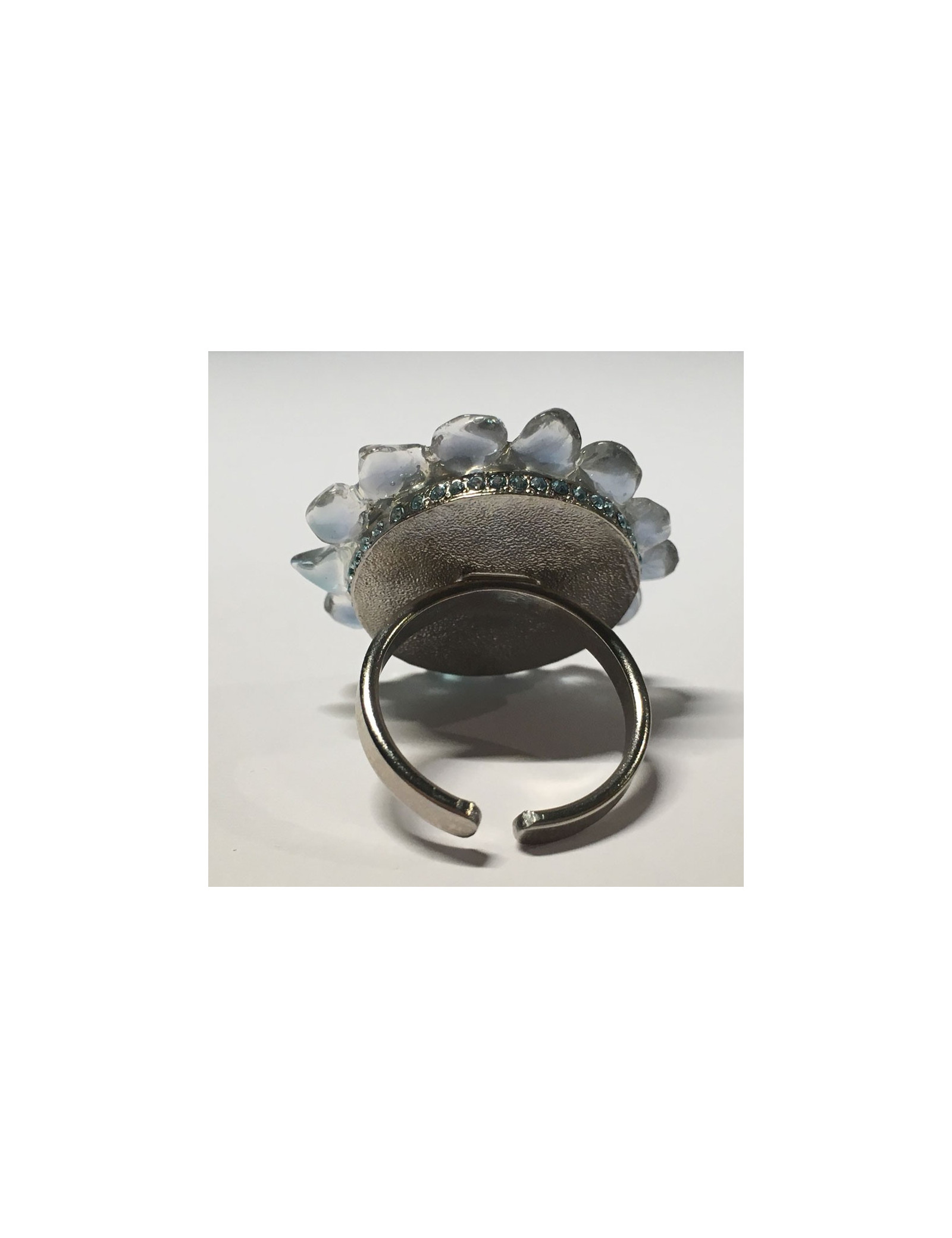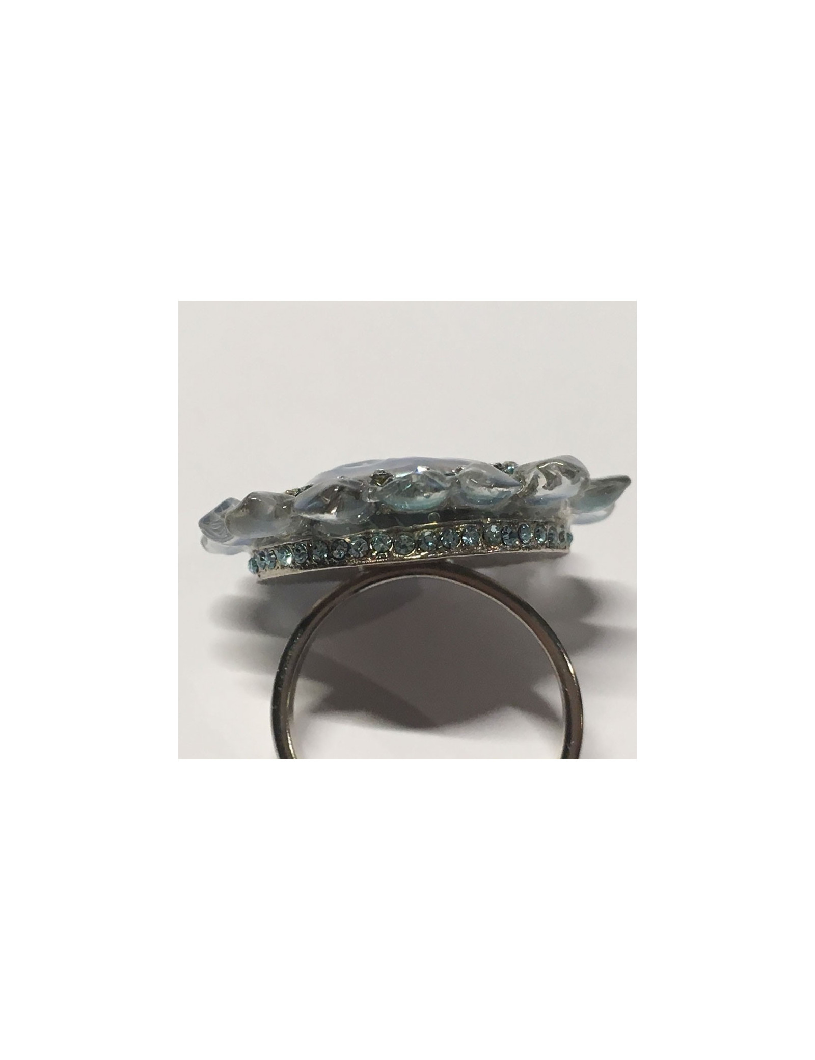Bague fleur CHANEL haute couture. Centre en résine nacrée bleue entourée de strass bleu. Pétales en petites résines bleues. Contour en métal argenté serti de petits strass blancs. Jamais portée.