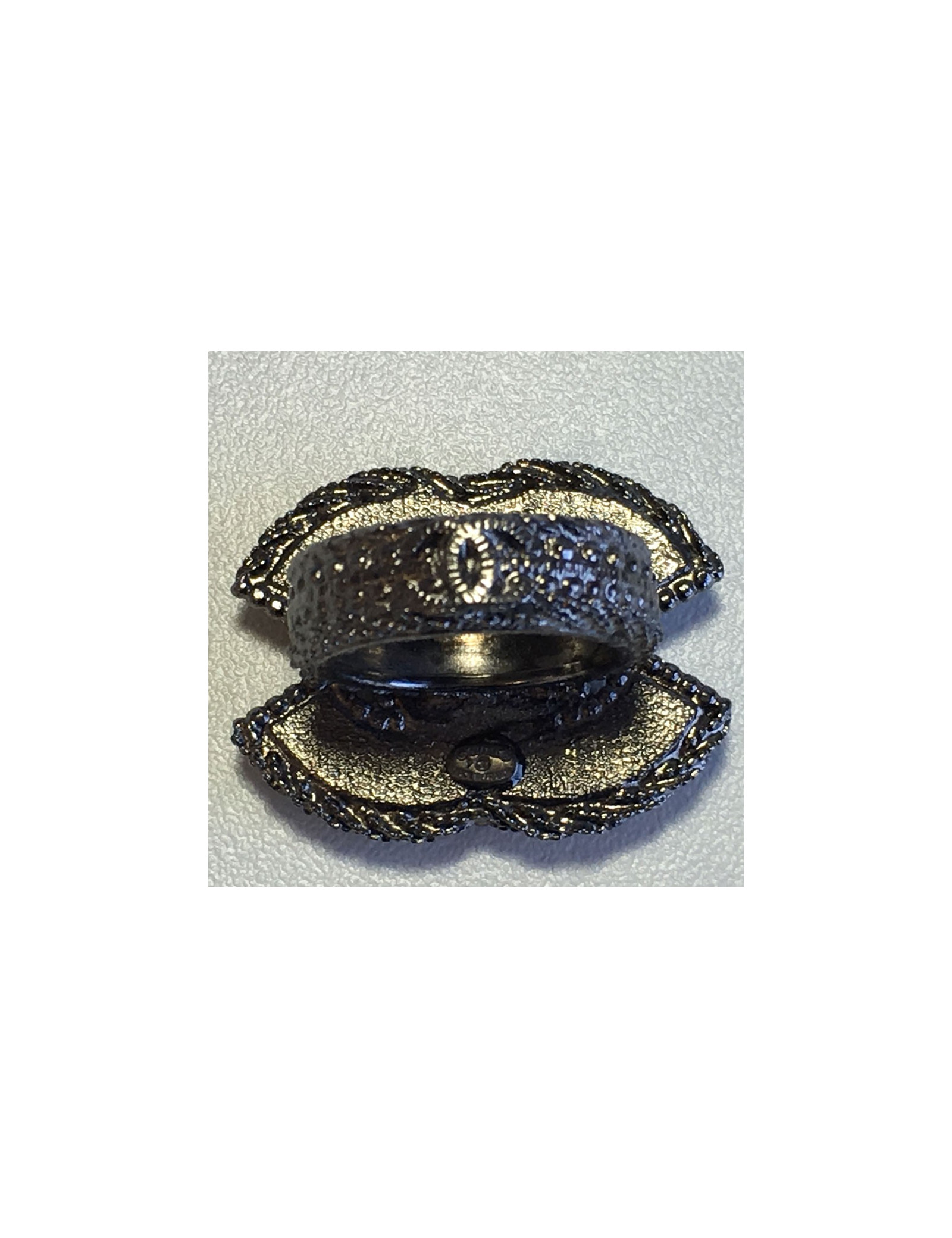 Belle bague CHANEL CC en métal ruthénium effet torsadé. CC serti de petites perles nacrées. Un CC sur le bas de l'anneau. Pastille de la marque présente. Jamais portée.