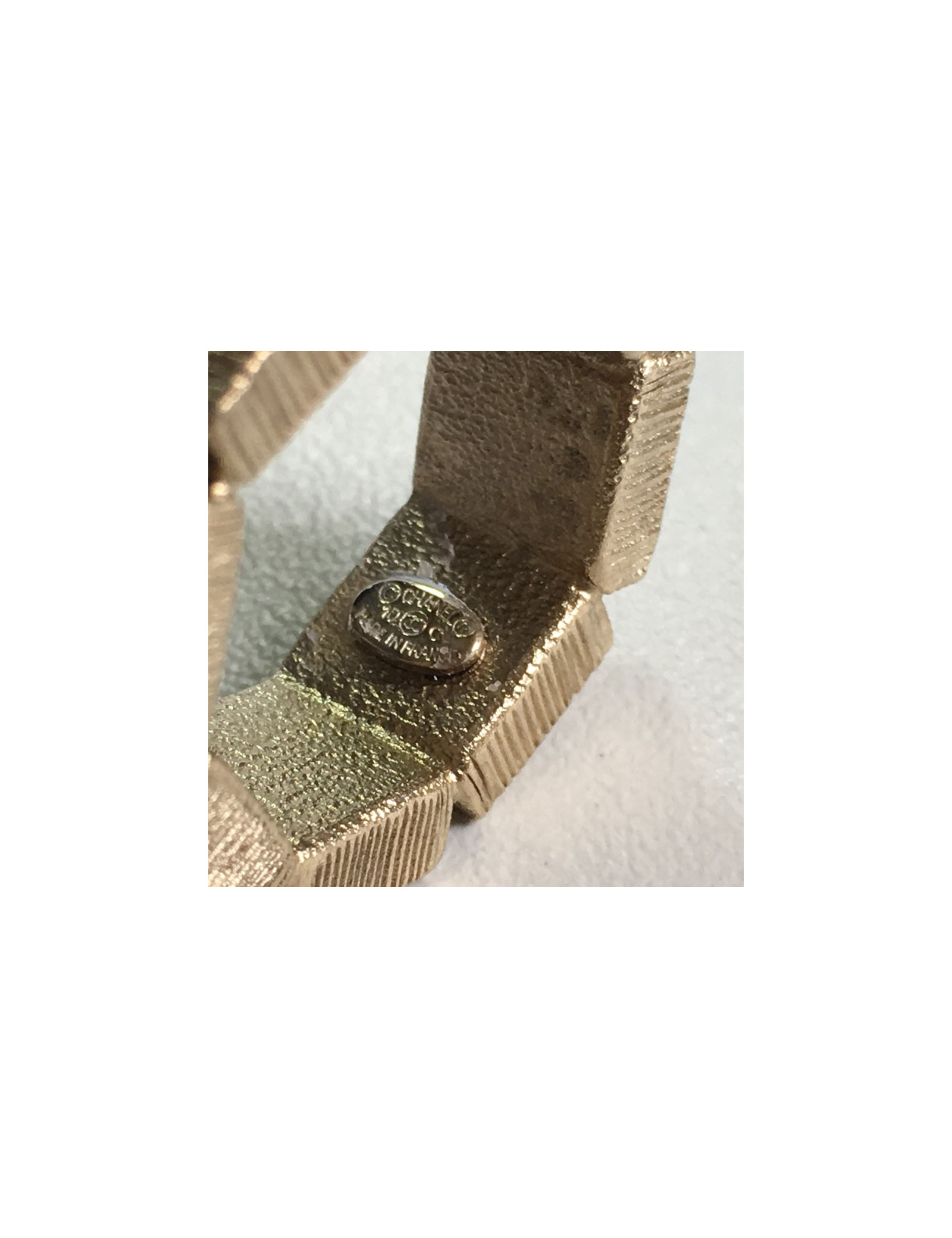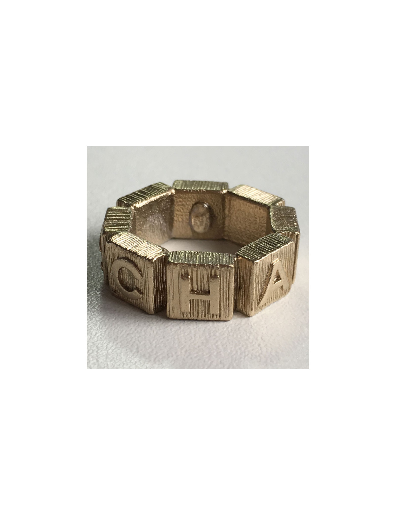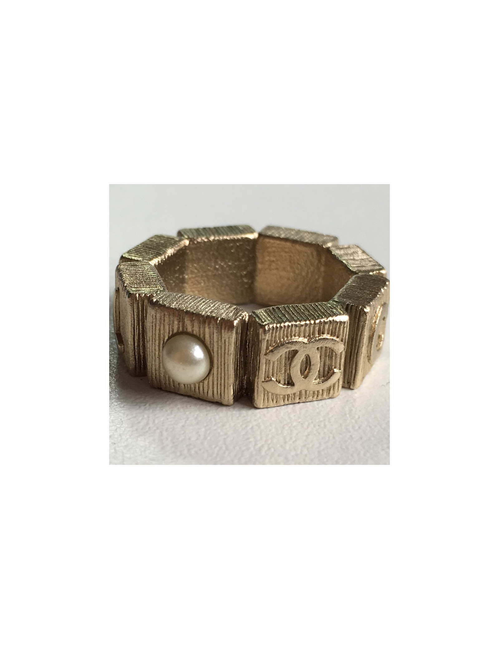 Belle bague CHANEL en métal couleur or pâle martelé sertie d'une petite perle nacrée. Un CC et CHANEL inscrits sur tout le tour de la bague. En très bon état. Pastille de la marque présente.