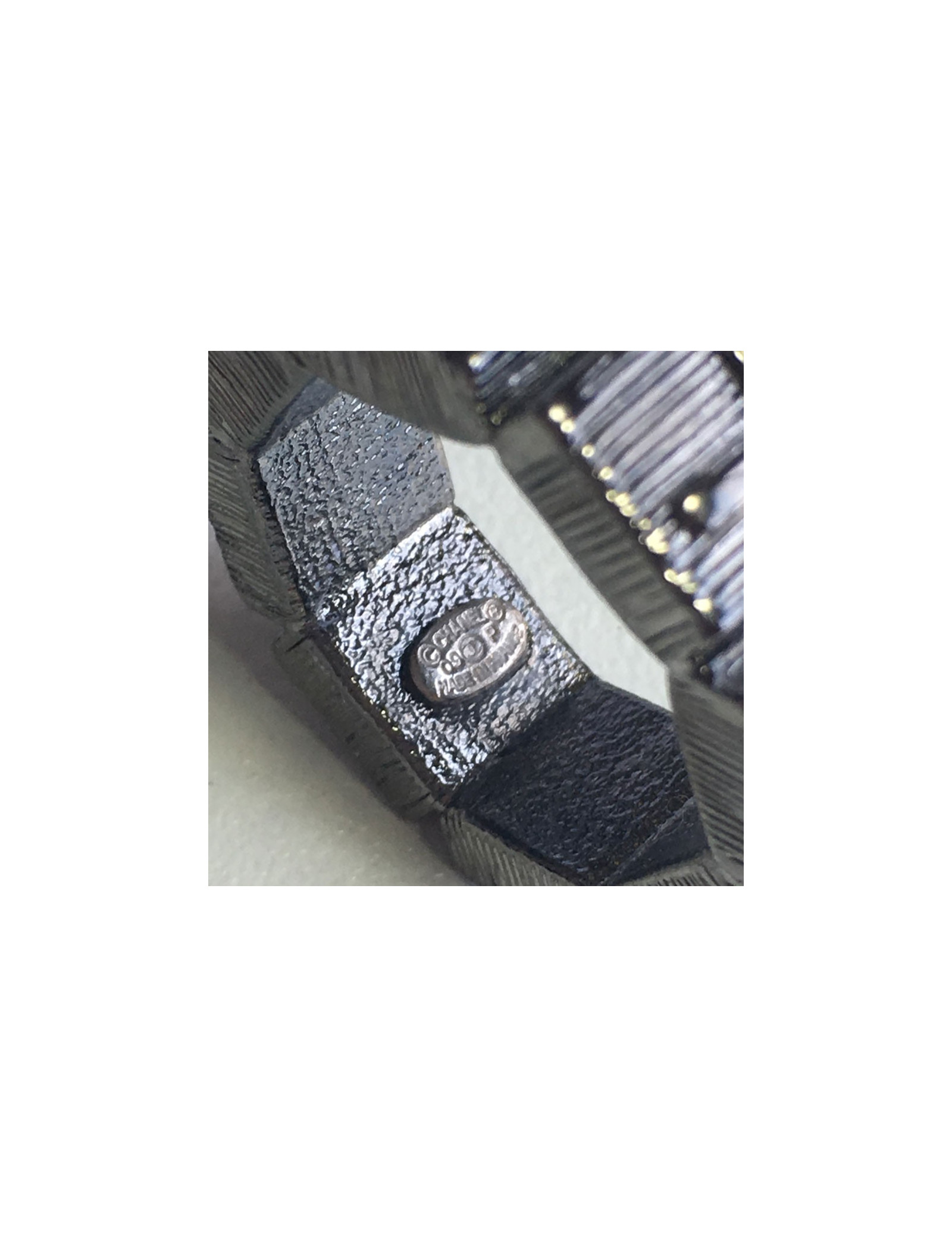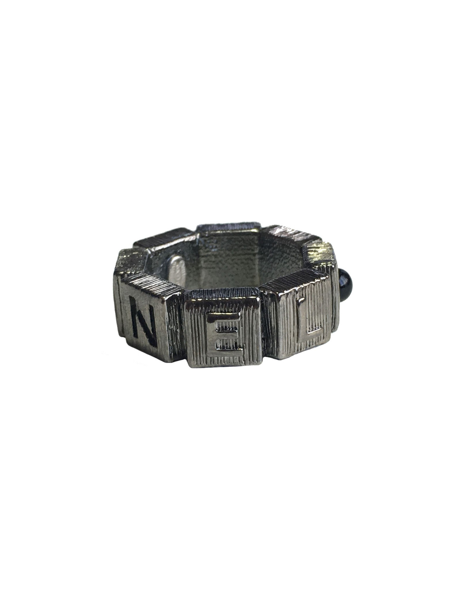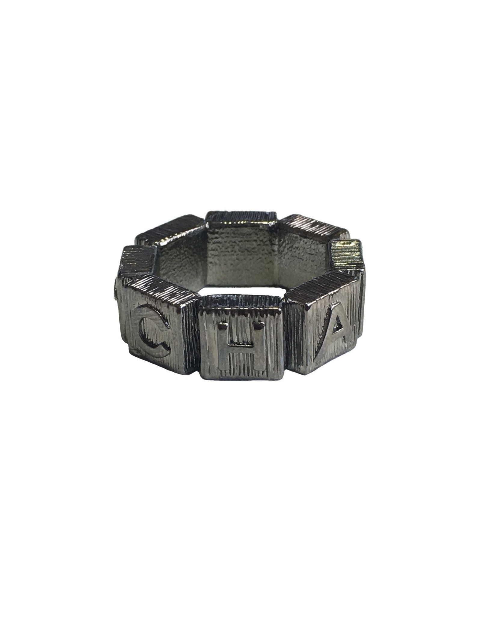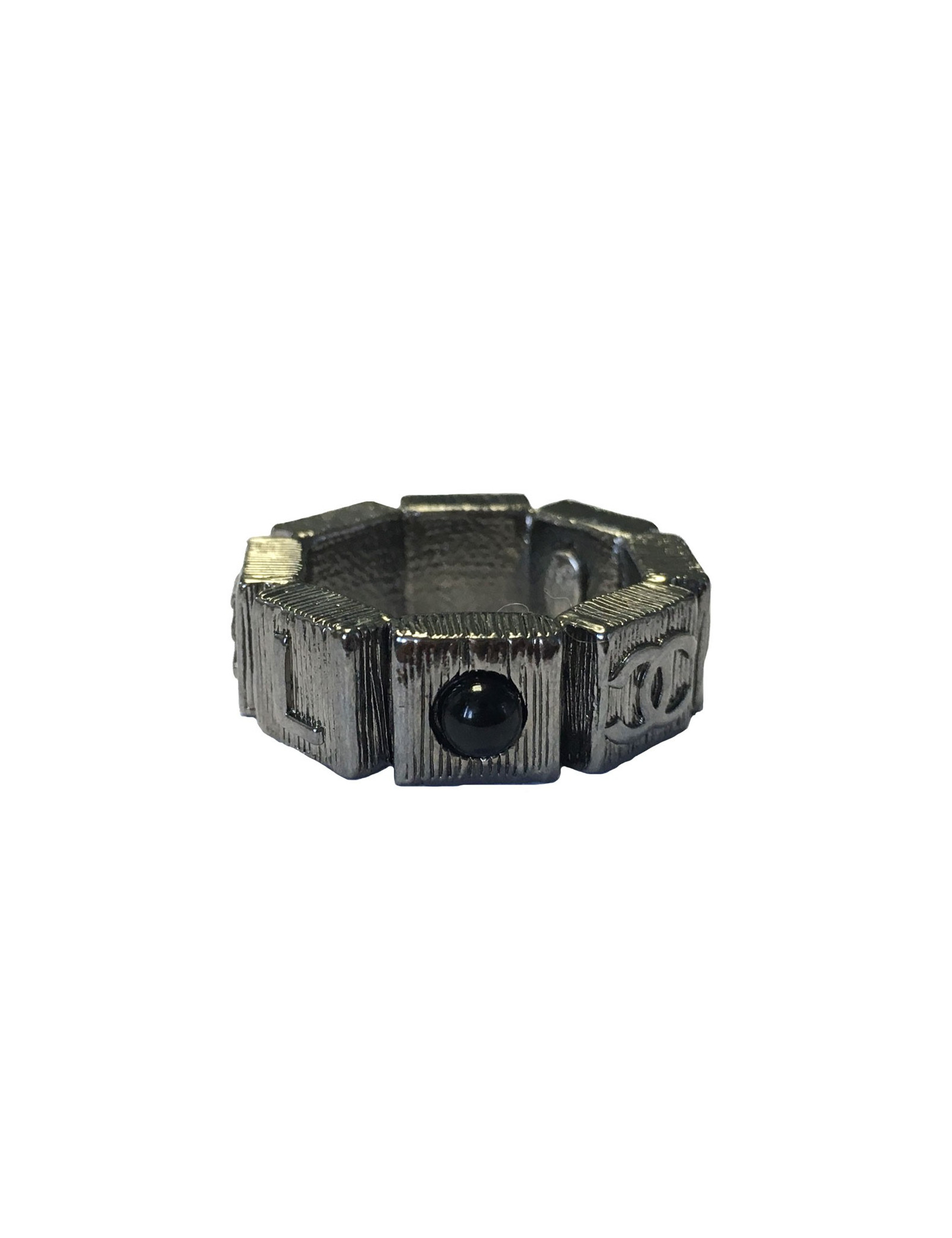 Belle bague CHANEL en métal couleur ruthénium martelé sertie d'une petite perle noire. Un CC et CHANEL inscrits sur tout le tour de la bague.