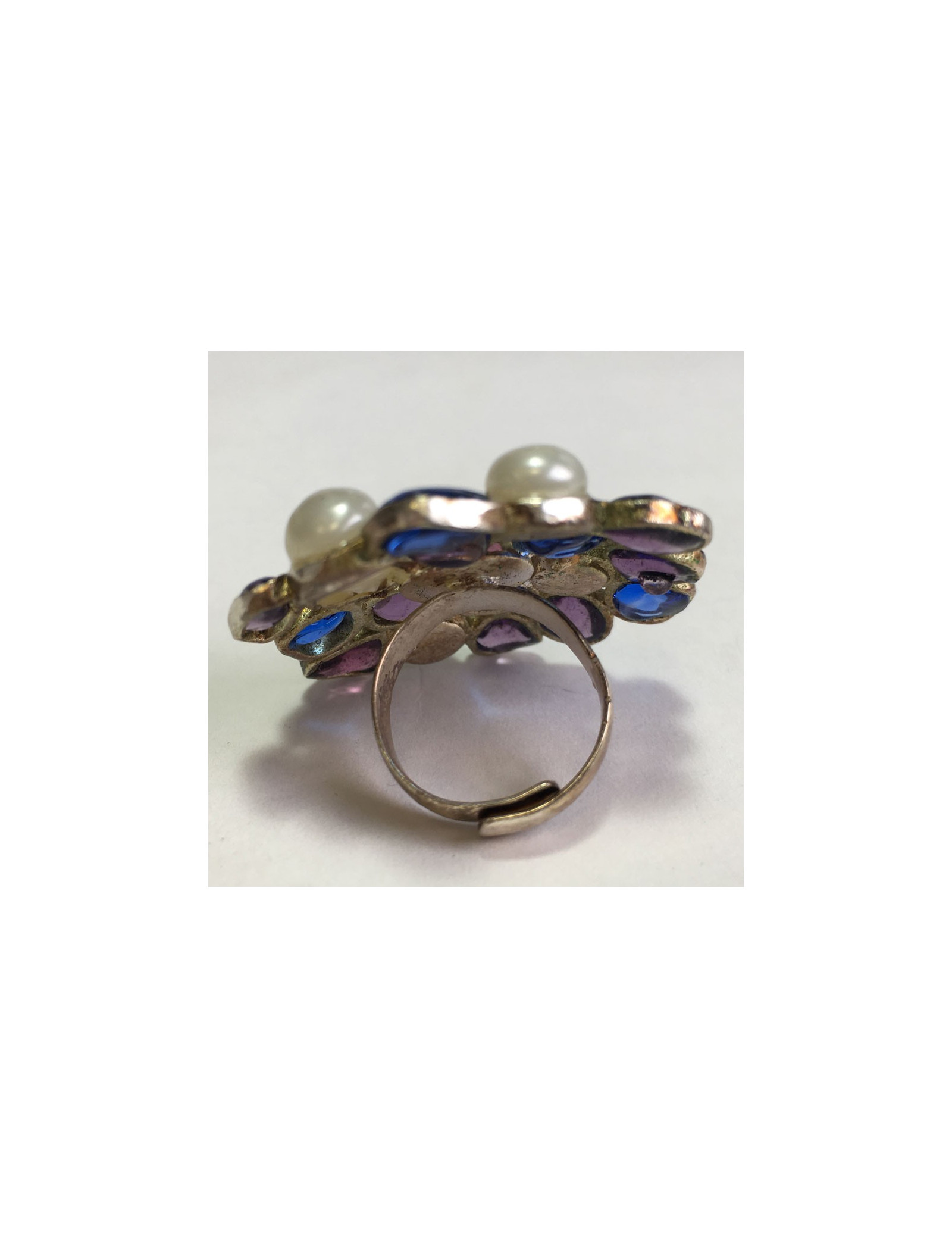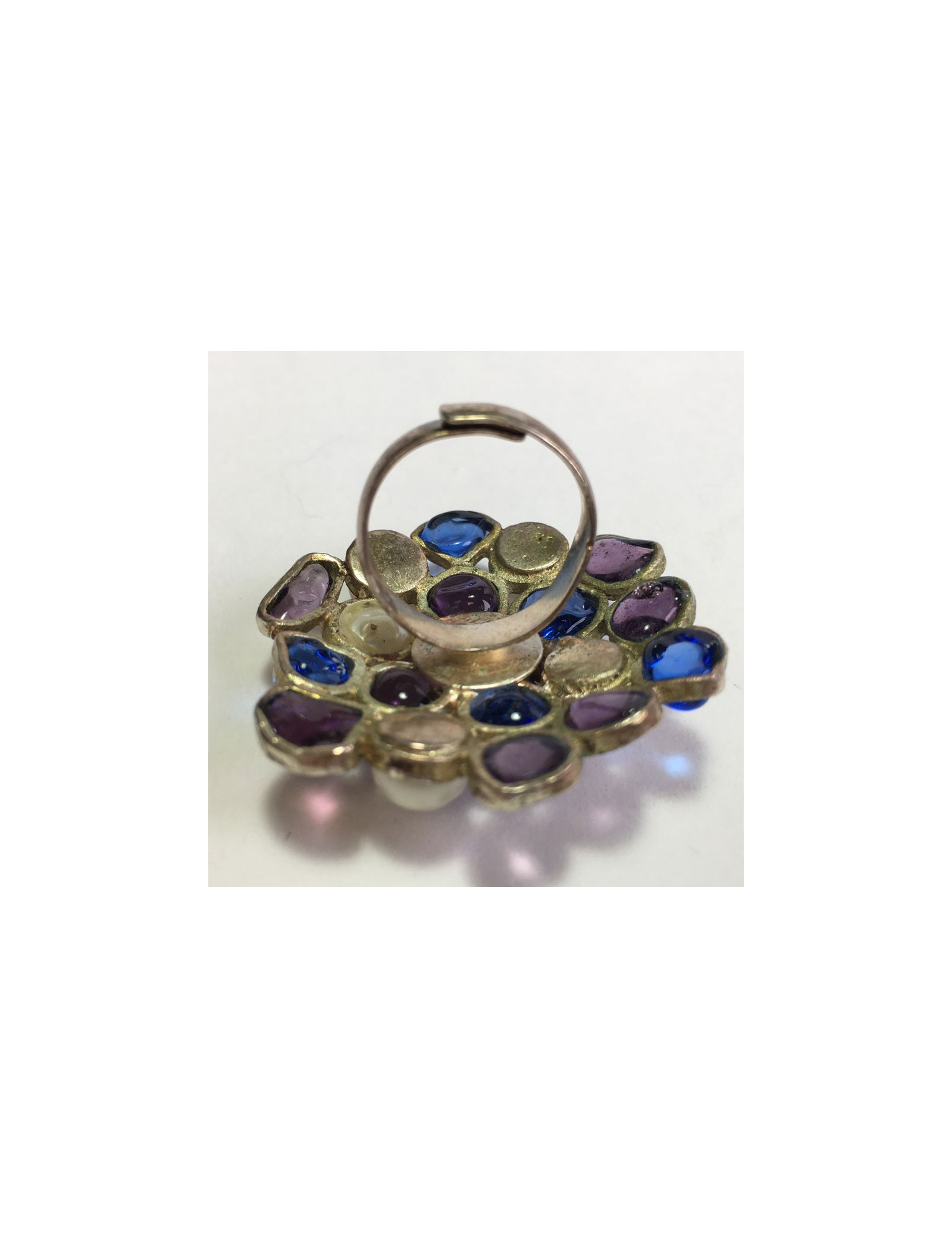 Très belle bague ronde MARGUERITE DE VALOIS en métal doré vieilli à l'or fin, sertie de pierres mauves et bleues en pâte de verre et de perles nacrées.